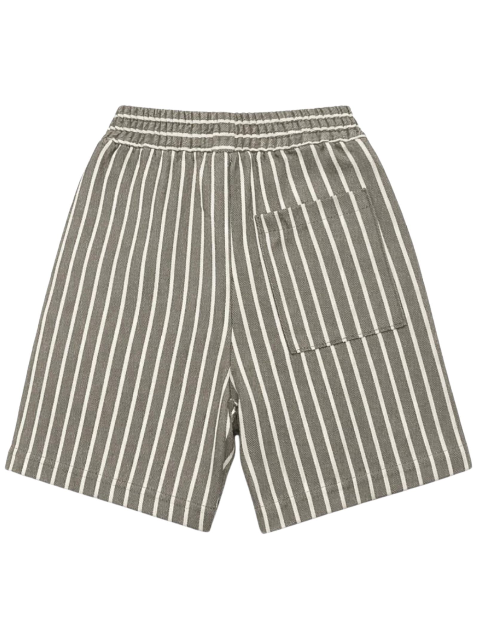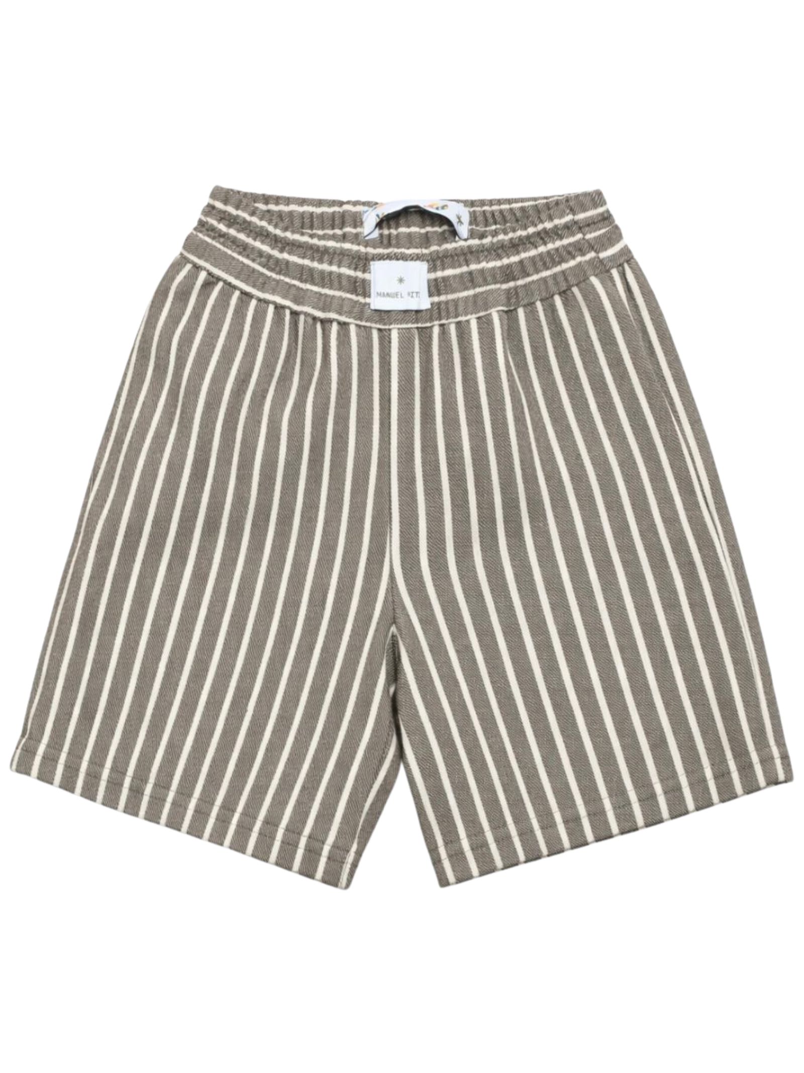 Manuel Ritz Kids bermuda in fantasia a righe di colore beige, modello con elastico in vita, due tasche laterali, una tasca sul retro, applicazione logo, vestibilità regolare. Composizione: 76% cotone 24% poliestere. Made in Italy