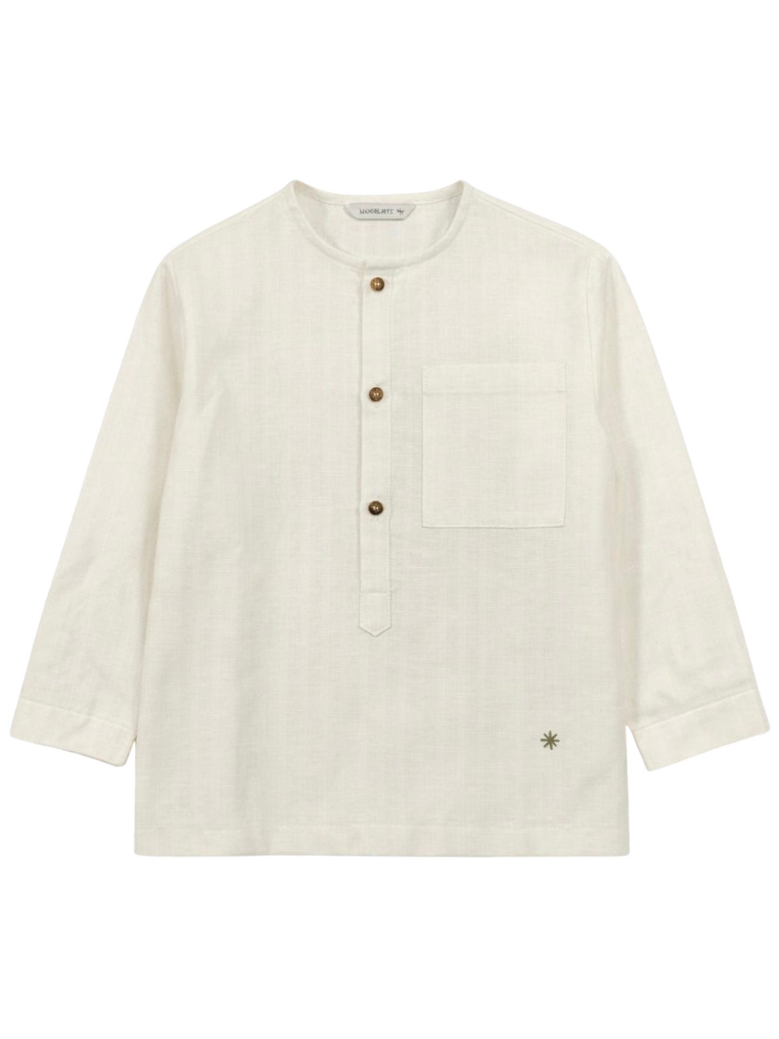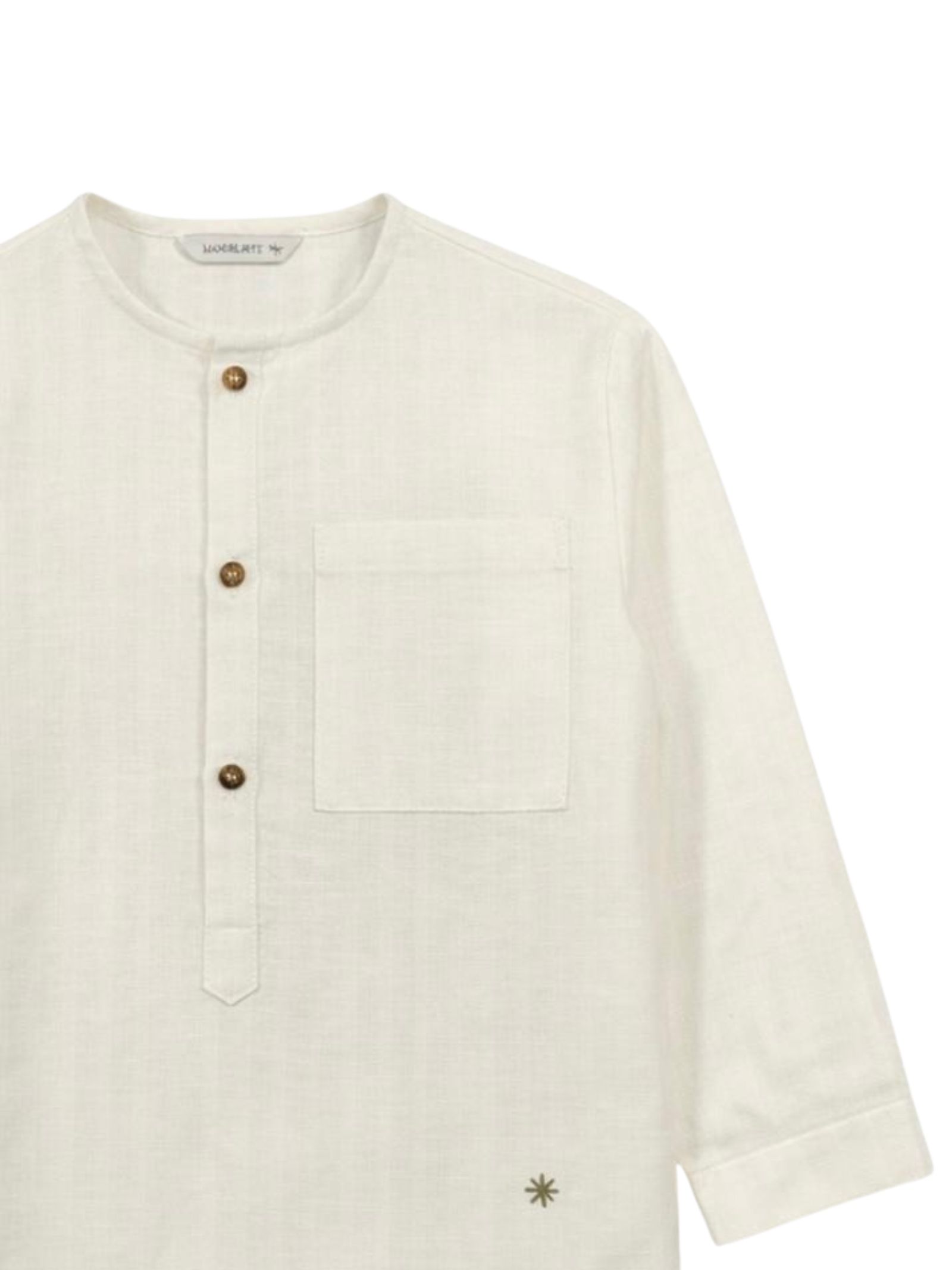 Manuel Ritz Kids camicia di colore panna, modello con colletto alla coreana, manica lunga, taschino sul petto, ricamo logo, orlo dritto, vestibilità regolare. Composizione: 45% cotone 30% lino 25% poliestere. Made in Italy