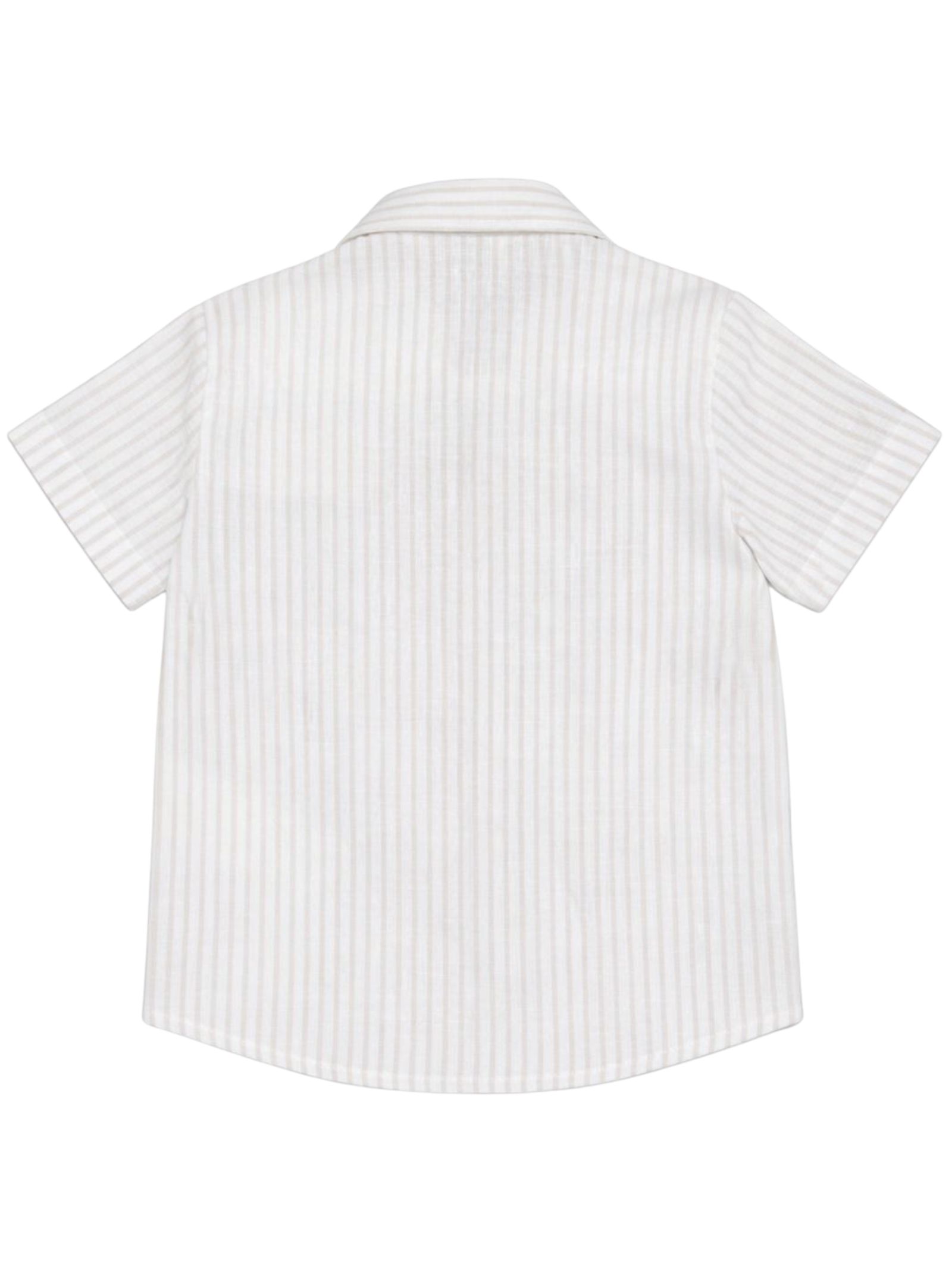 Manuel Ritz Kids camicia di colore panna in fantasia a righe, morbido tessuto misto lino e cotone, colletto classico, mezza manica, ricamo logo, orlo curvo, vestibilità regolare. Composizione: 45% cotone 55% lino. Made in Italy