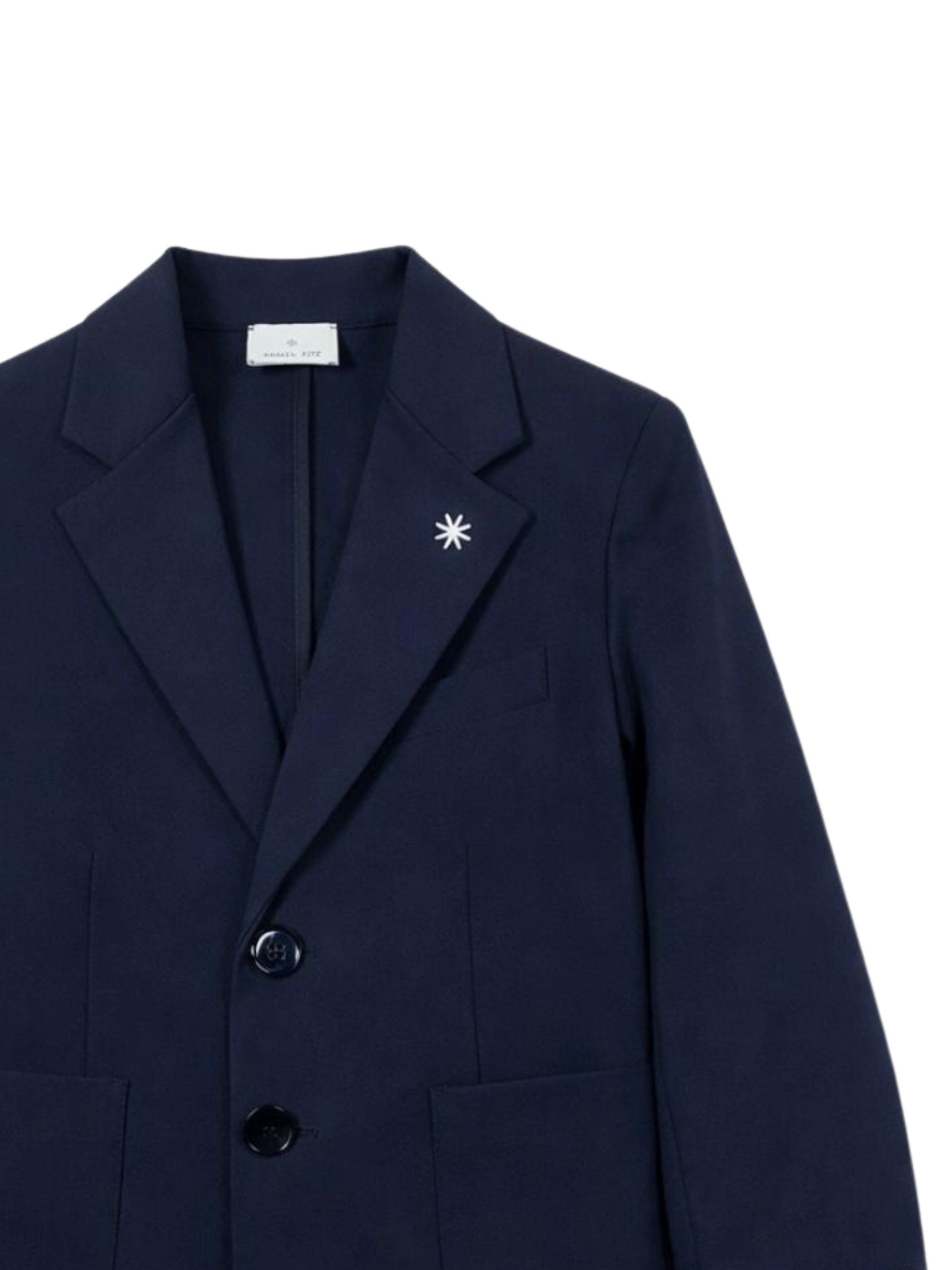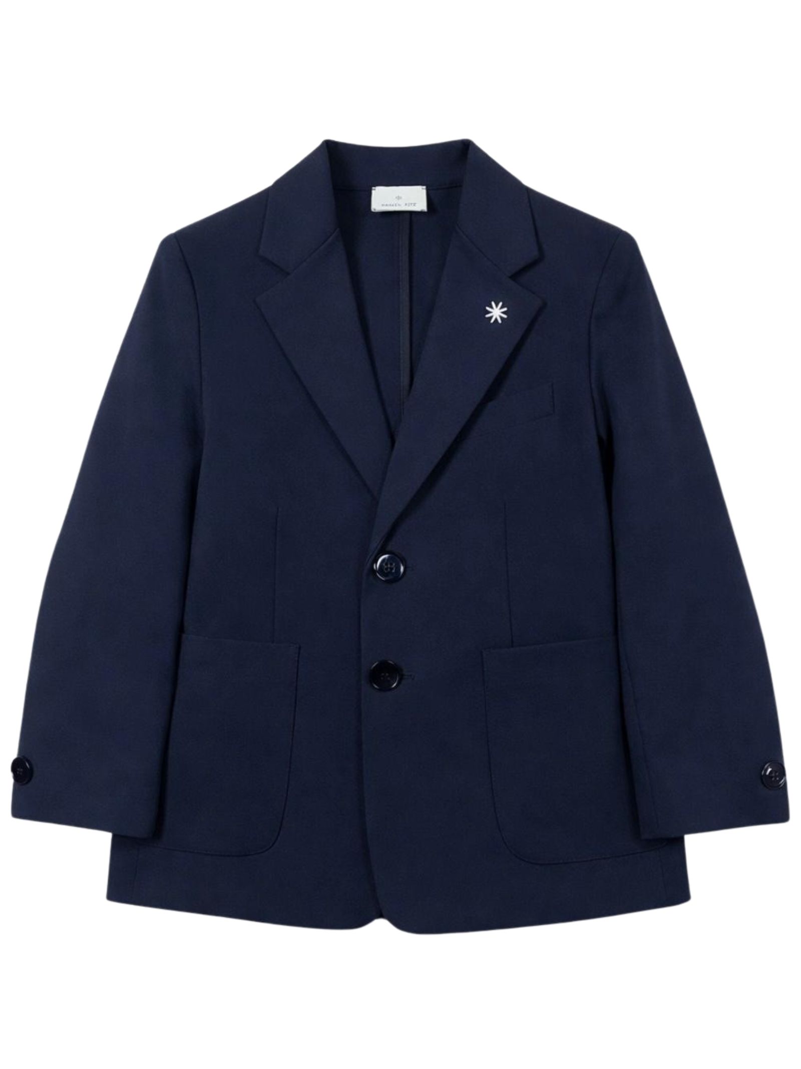 Manuel Ritz Kids giacca di colore blu, design a due bottoni, manica lunga, due tasche frontali, un taschino sul petto, spacco centrale posteriore, taglio dritto, vestibilità regolare. Composizione: 52% Cotone 40% poliammide 8% elastan. Made in Italy