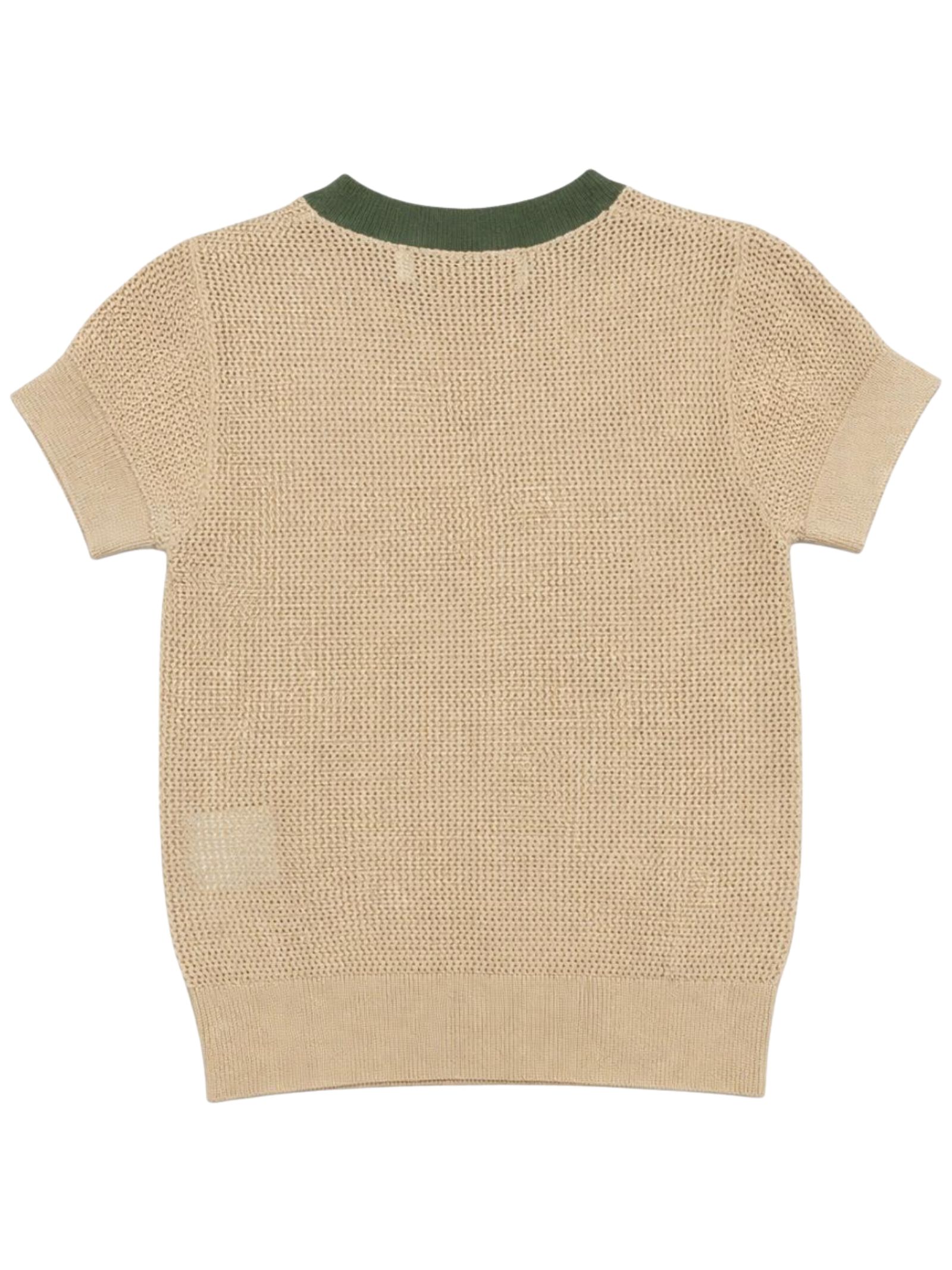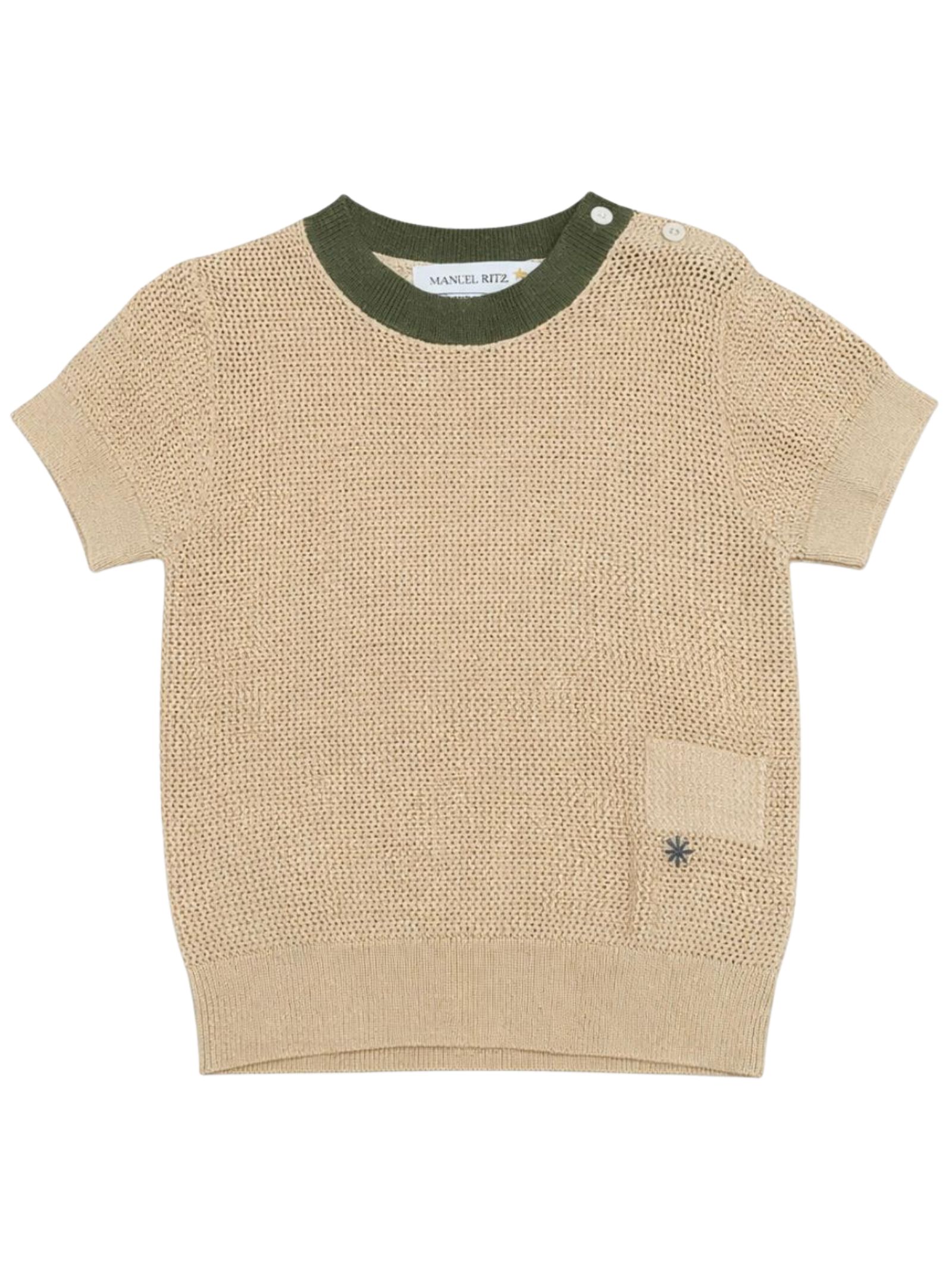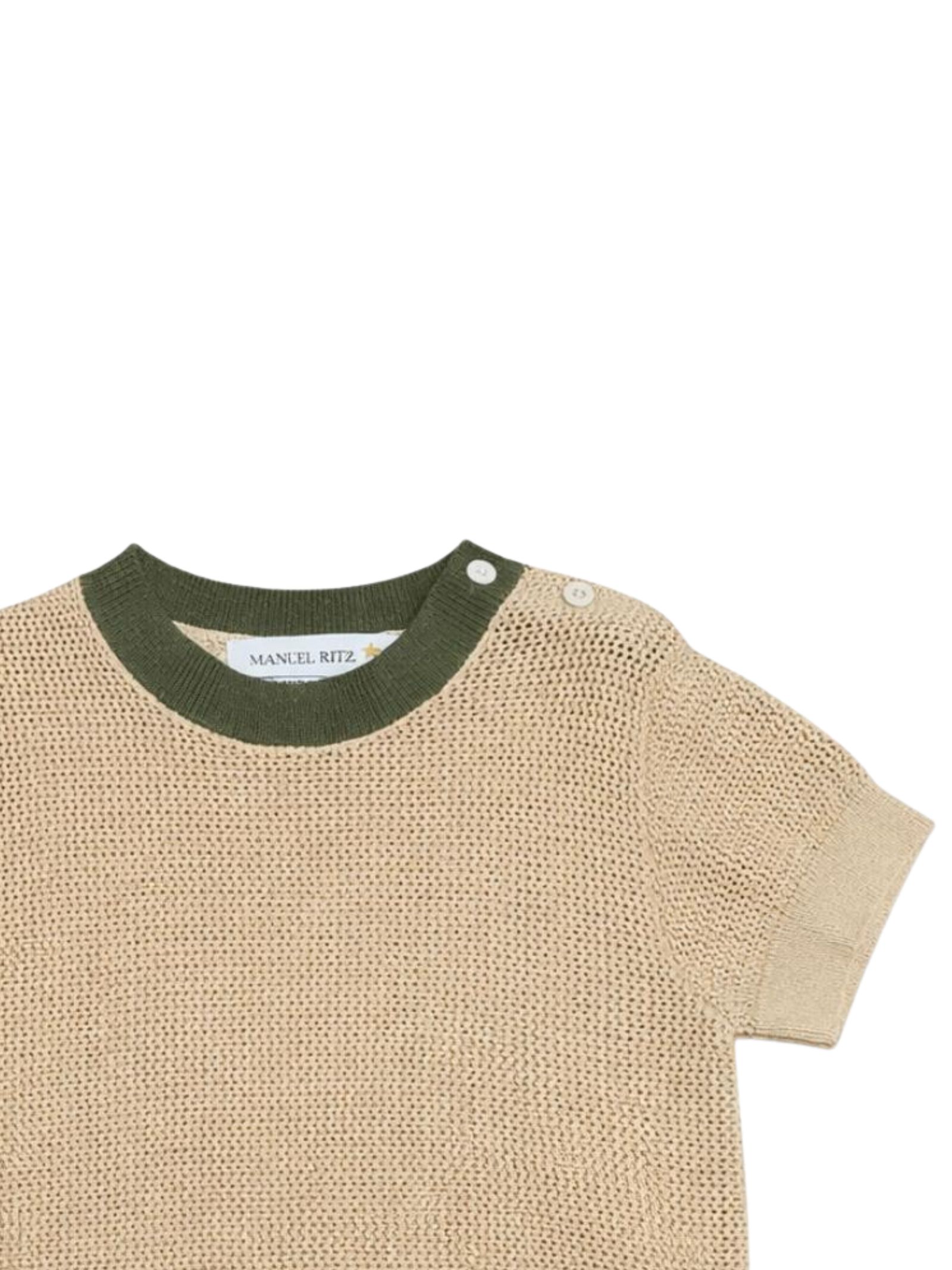 Manuel Ritz Kids maglia di colore beige, dettagli a contrasto verde, tessuto a maglia, modello girocollo, mezza manica, apertura bottoni sulla spalla, vestibilità regolare. Composizione: 65% viscosa 35% poliammide