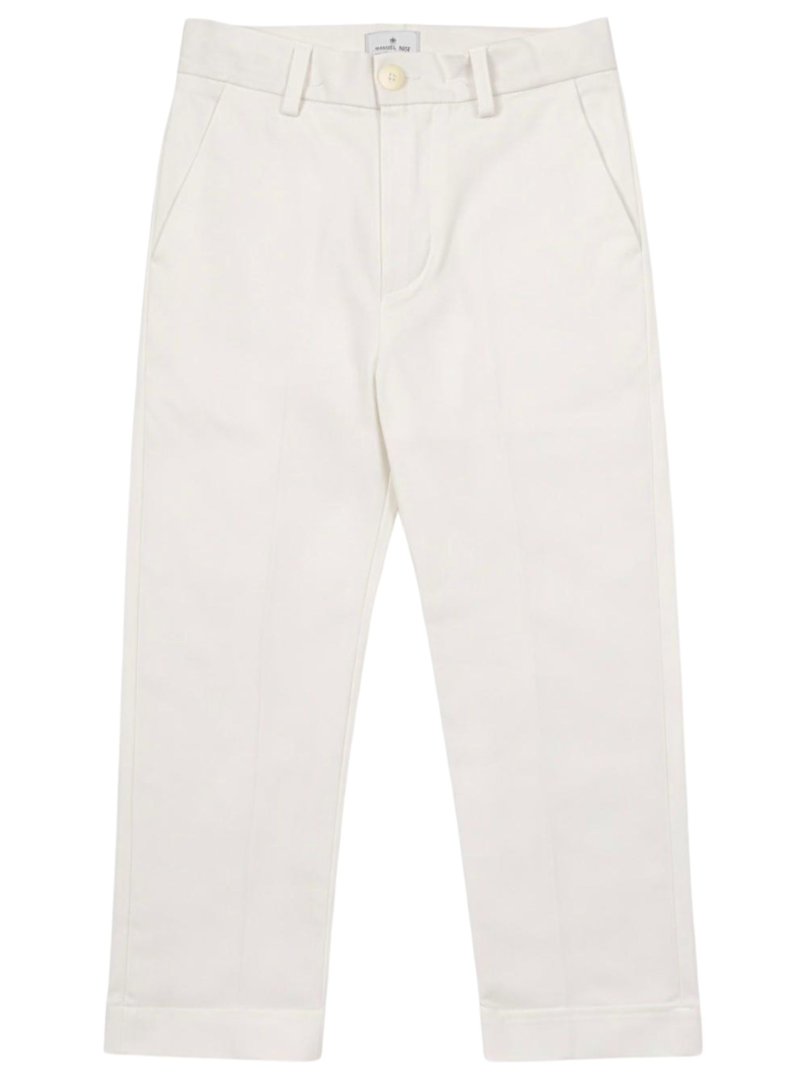 Manuel Ritz Kids pantalone di colore bianco, modello con vita regolare, due tasche laterali, una tasca sul retro, vestibilità regolare. Composizione: 98% Cotone 2% Elastan. Made in Italy