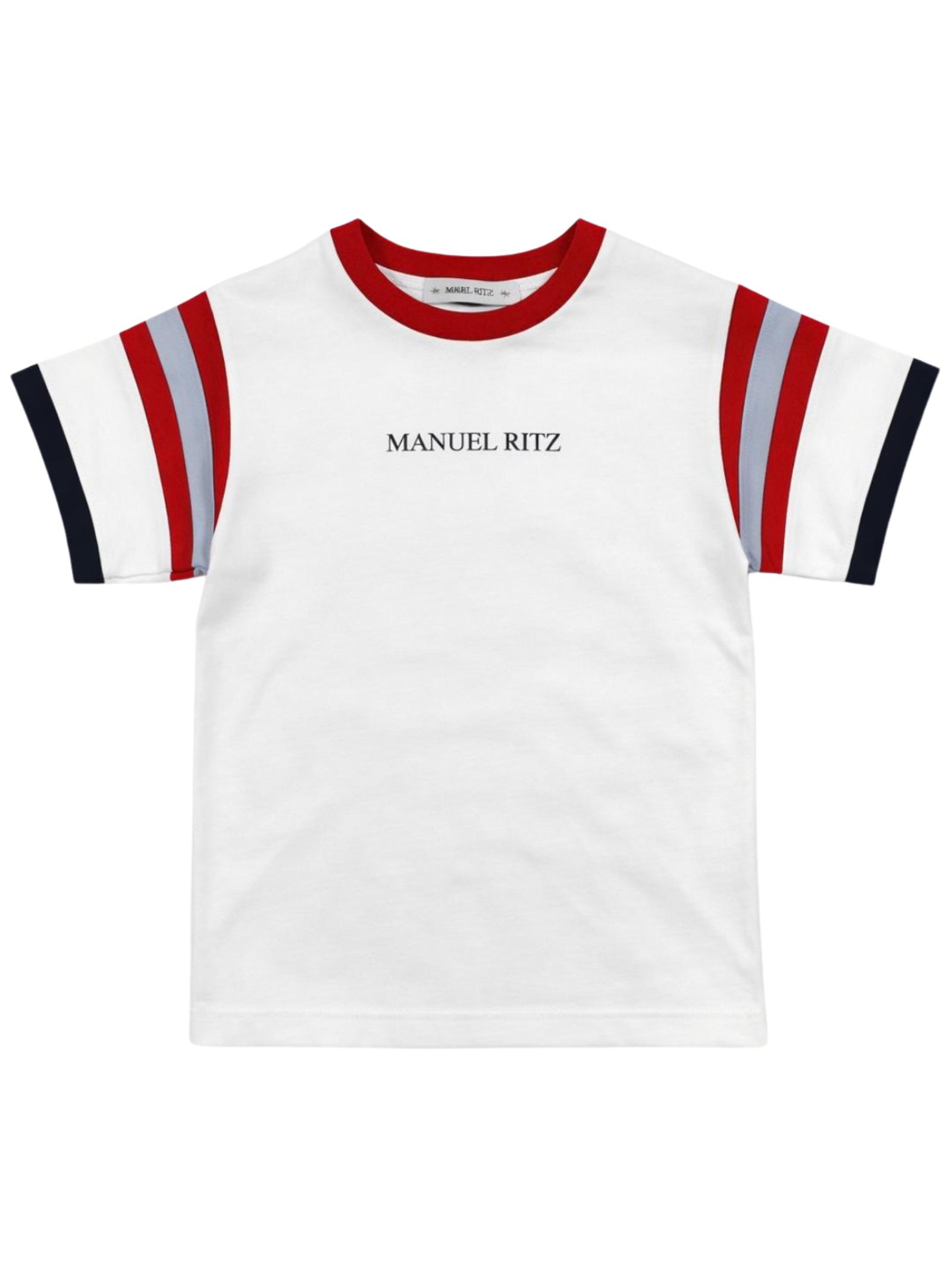 Manuel Ritz Kids t-shirt di colore bianco, dettagli a contrasto blu/rosso/azzurrro, modello girocollo, mezza manica, stampa a contrasto, orlo dritto, vestibilità regolare. Composizione: 100% cotone. Made in Italy