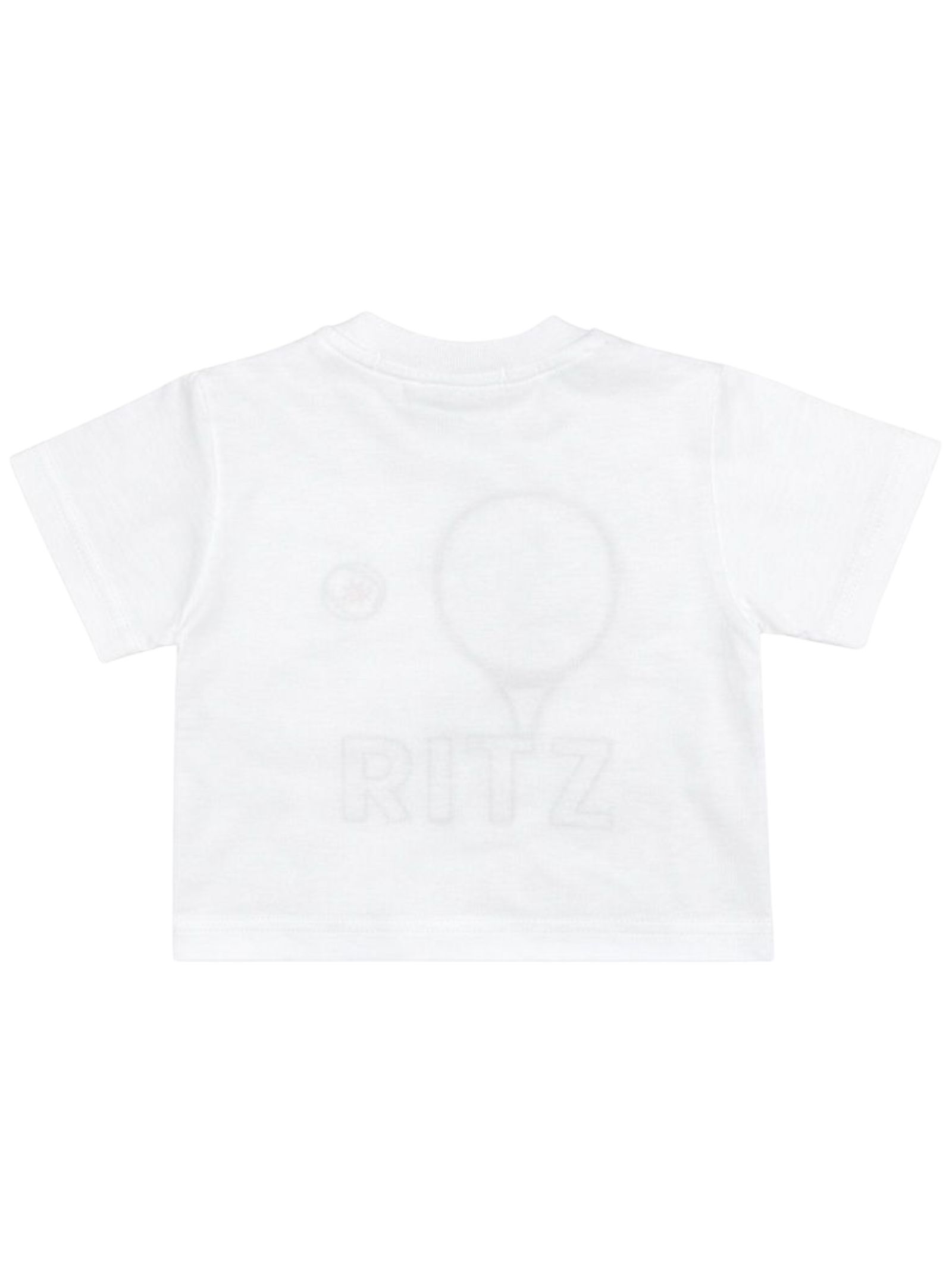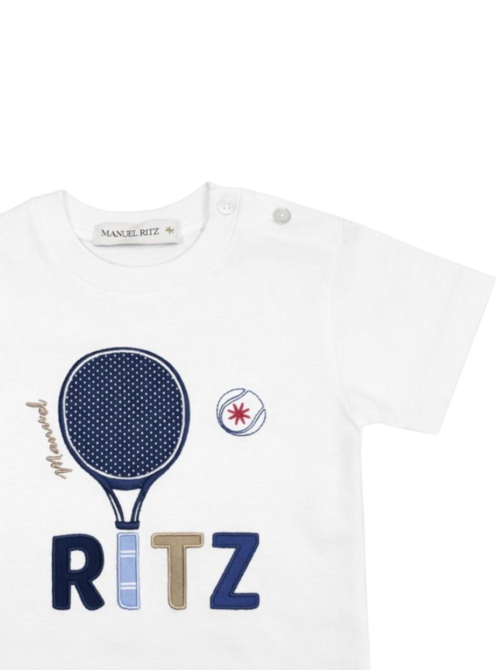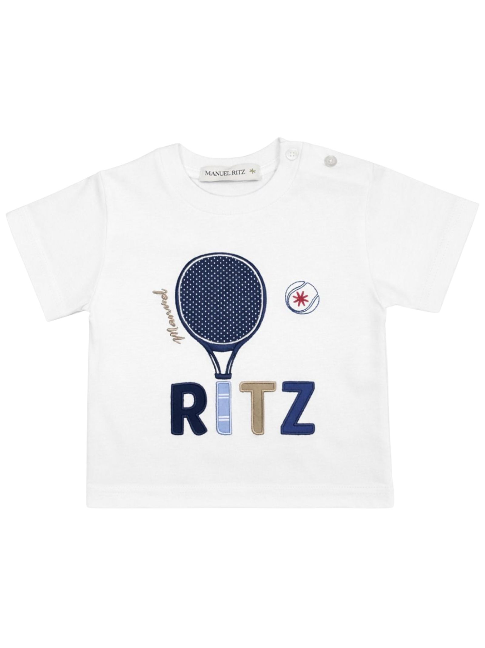 Manuel Ritz Kids t-shirt di colore bianco, modello girocollo, mezza manica, ricamo centrale a contrasto, apertura bottoni sulla spalla, orlo dritto, vestibilità regolare. Composizione: 100% cotone. Made in Italy