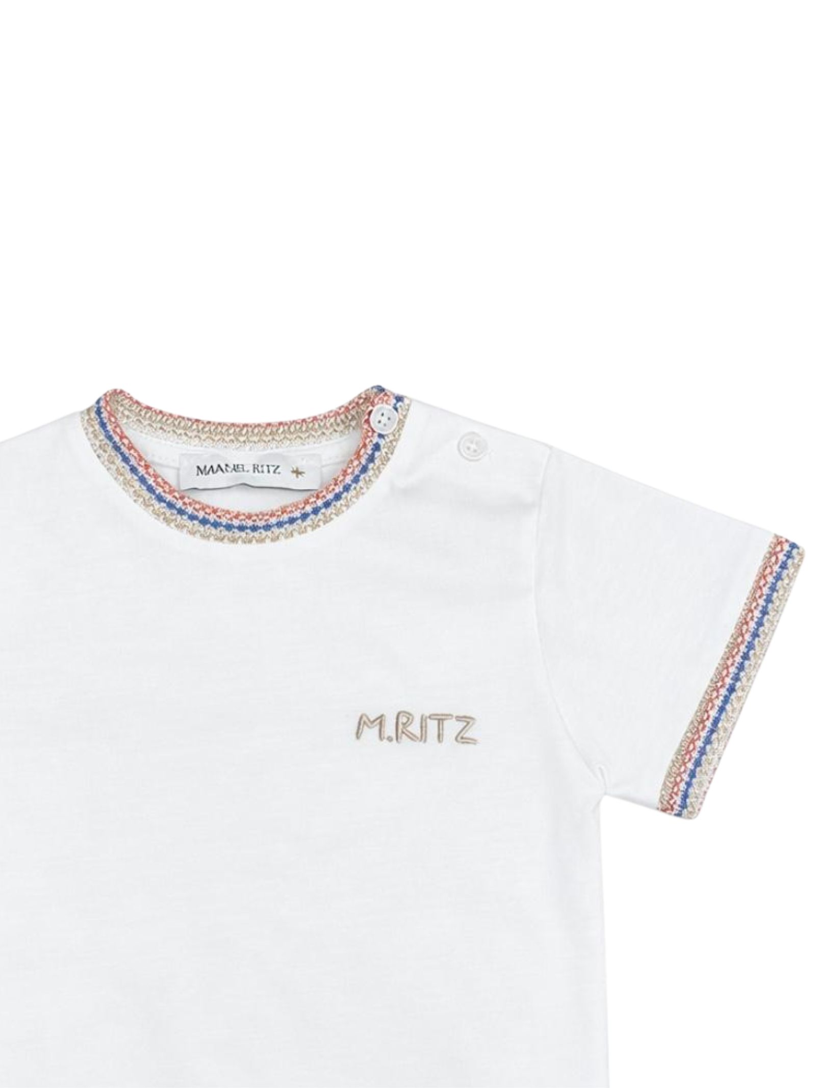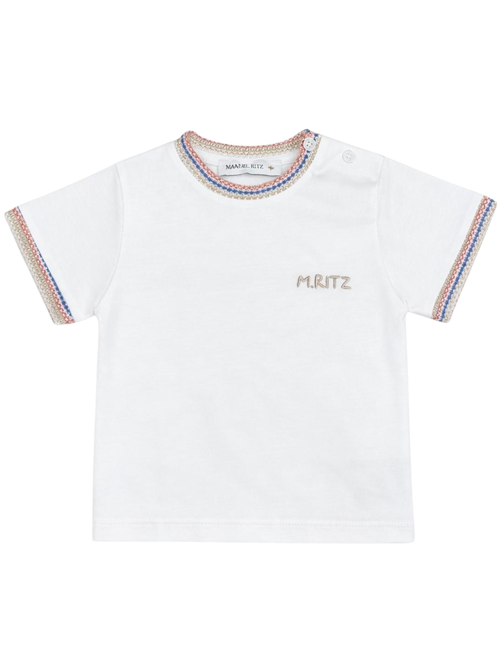 Manuel Ritz Kids t-shirt di colore bianco, dettagli a contrasto, modello girocollo, mezza manica, stampa centrale a contrasto con logo, apertura bottoni sulla spalla, orlo dritto, vestibilità regolare. Composizione: 100% cotone. Made in Italy