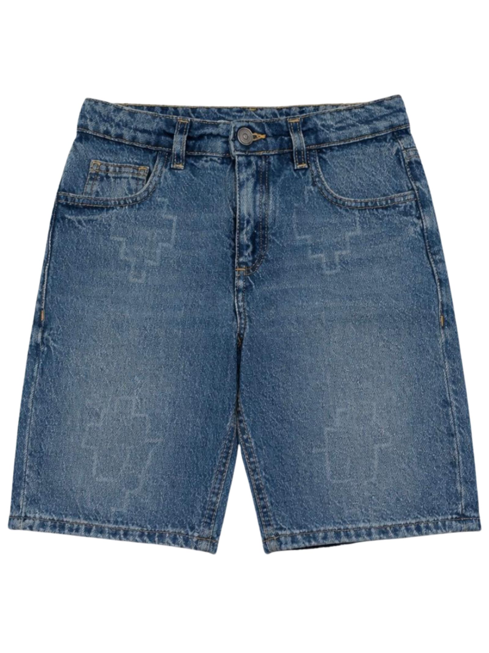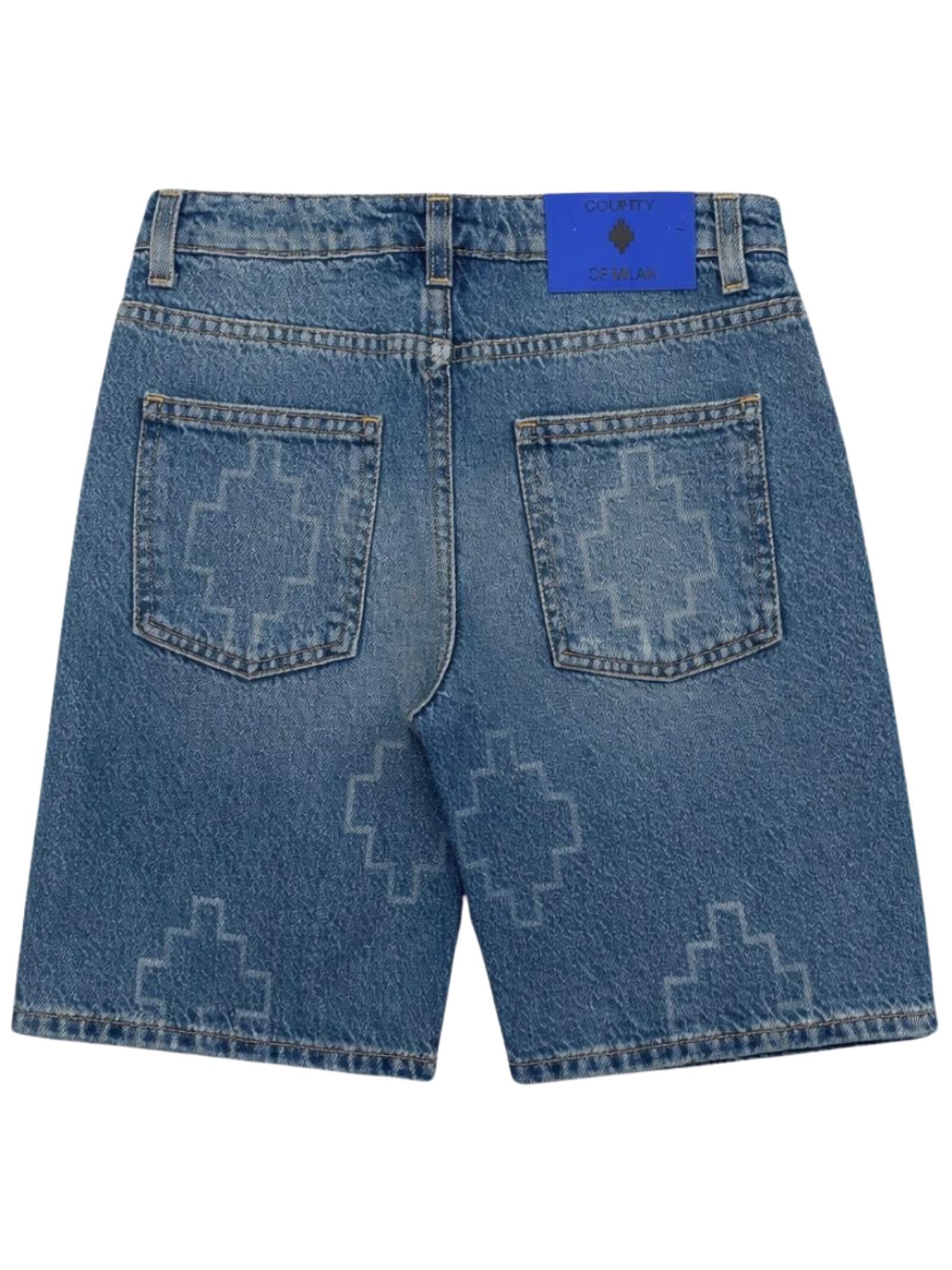 Marcelo Burlon Kids bermuda in cotone denim, simbolo logo stampato a contrasto su tutta la superficie, design 5 tasche, vita regolare, patch con logo sul retro, vestibilità regolare. Composizione: 100% cotone. Made in Italy