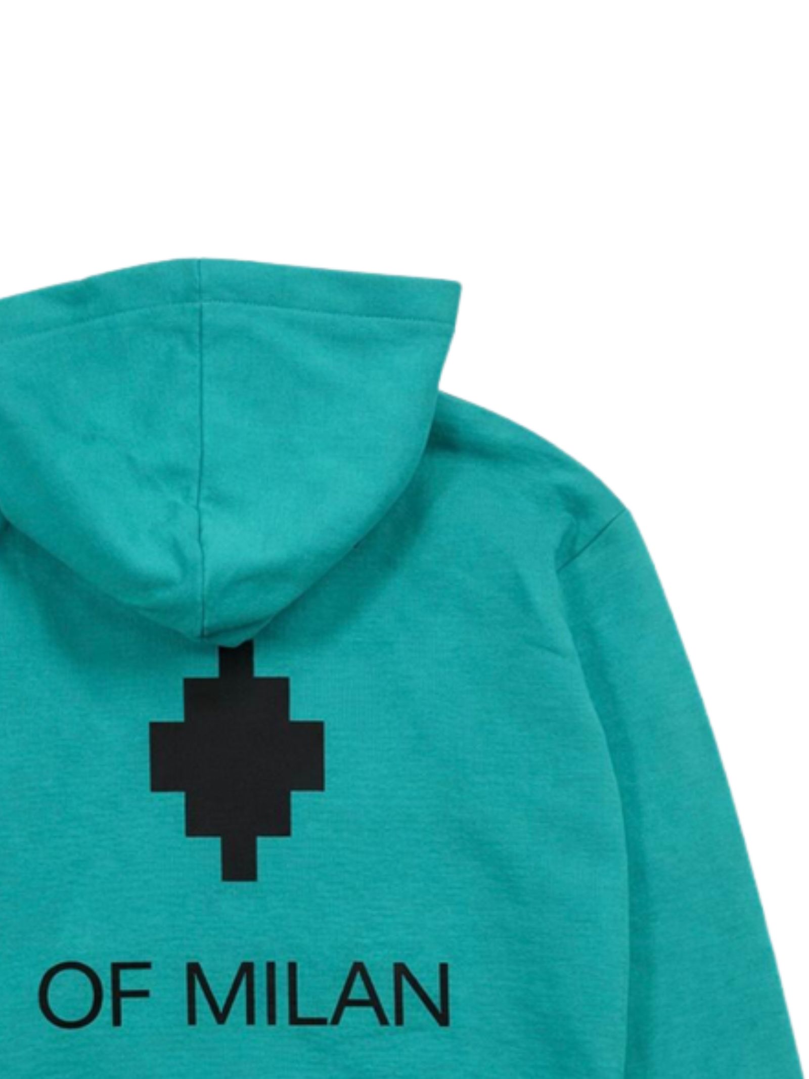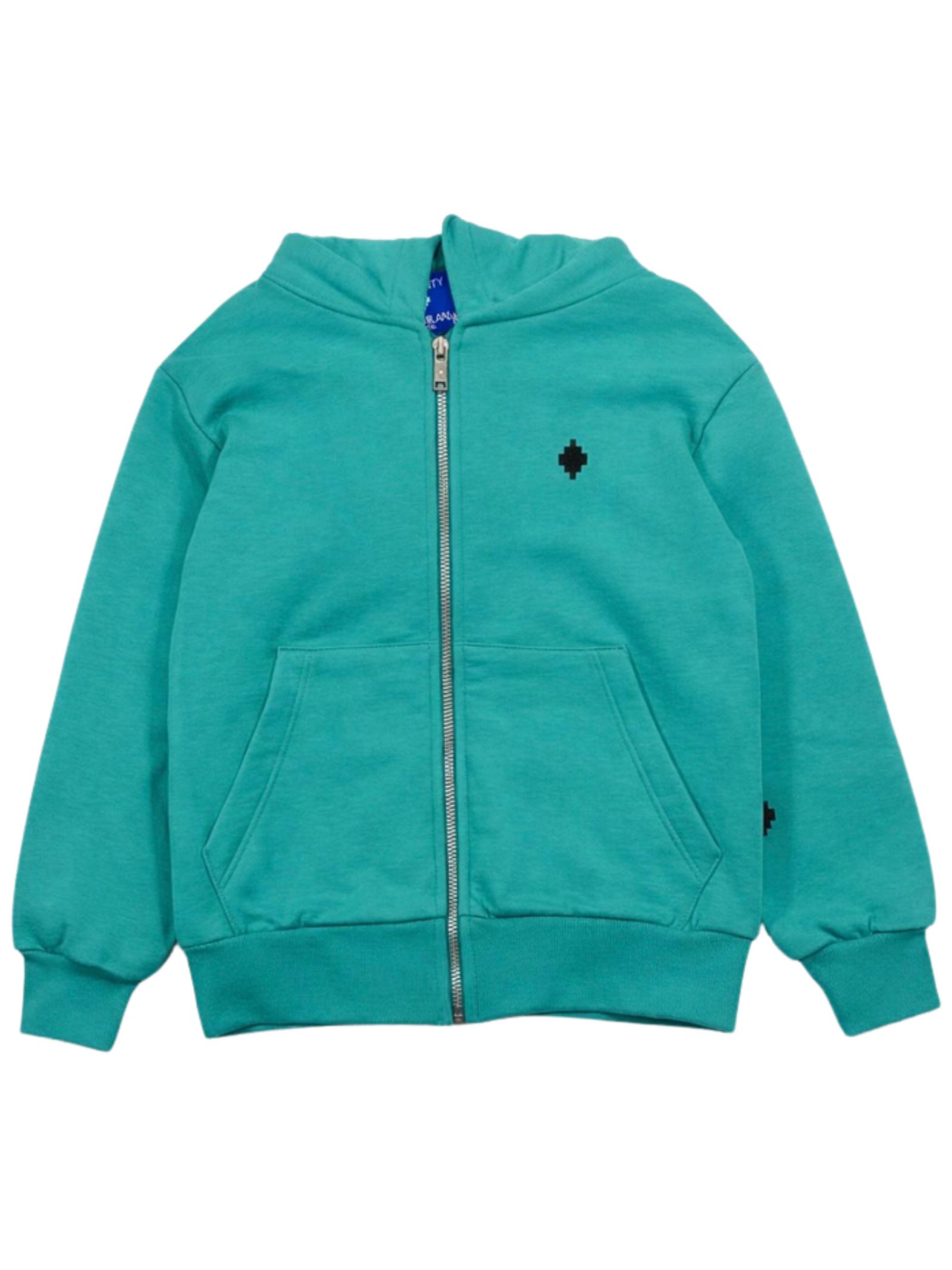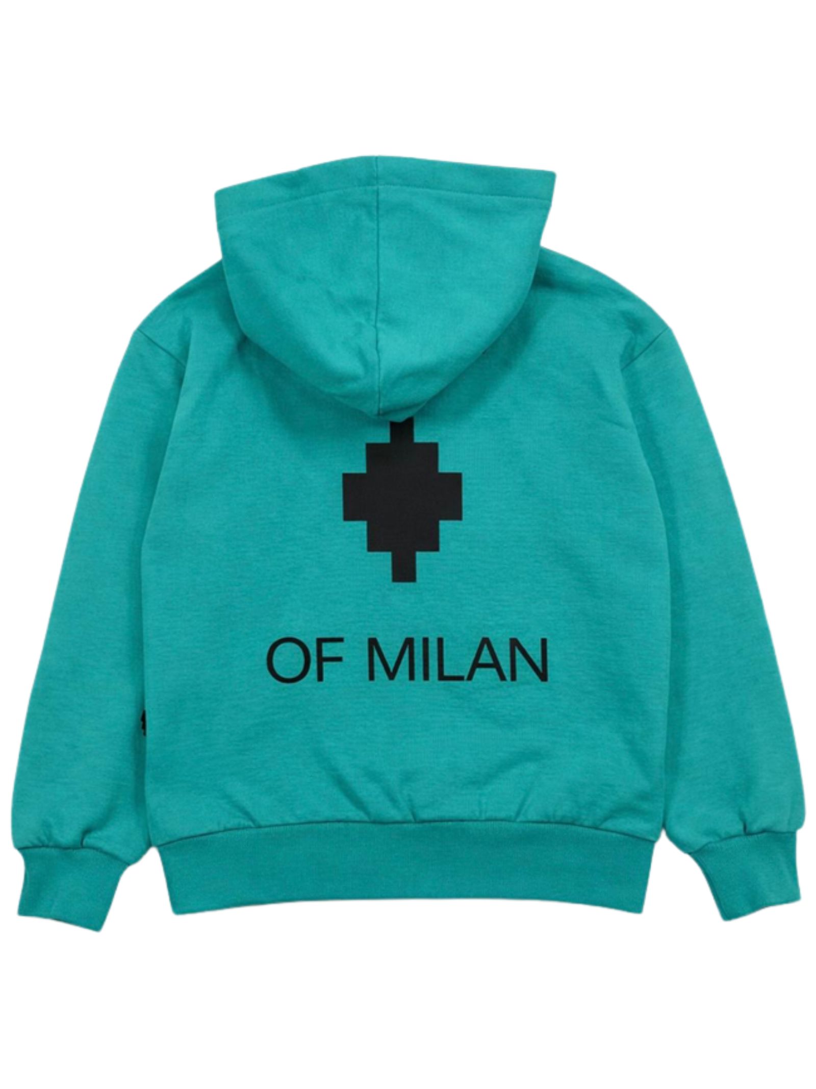 Marcelo Burlon Kids felpa di colore verde acqua, modello con cappuccio, maniche lunghe, stampa a contrasto, vestibilità regolare, due tasche laterali, orli a costine, fondo dritto. Composizione: 100% cotone. Made in Italy