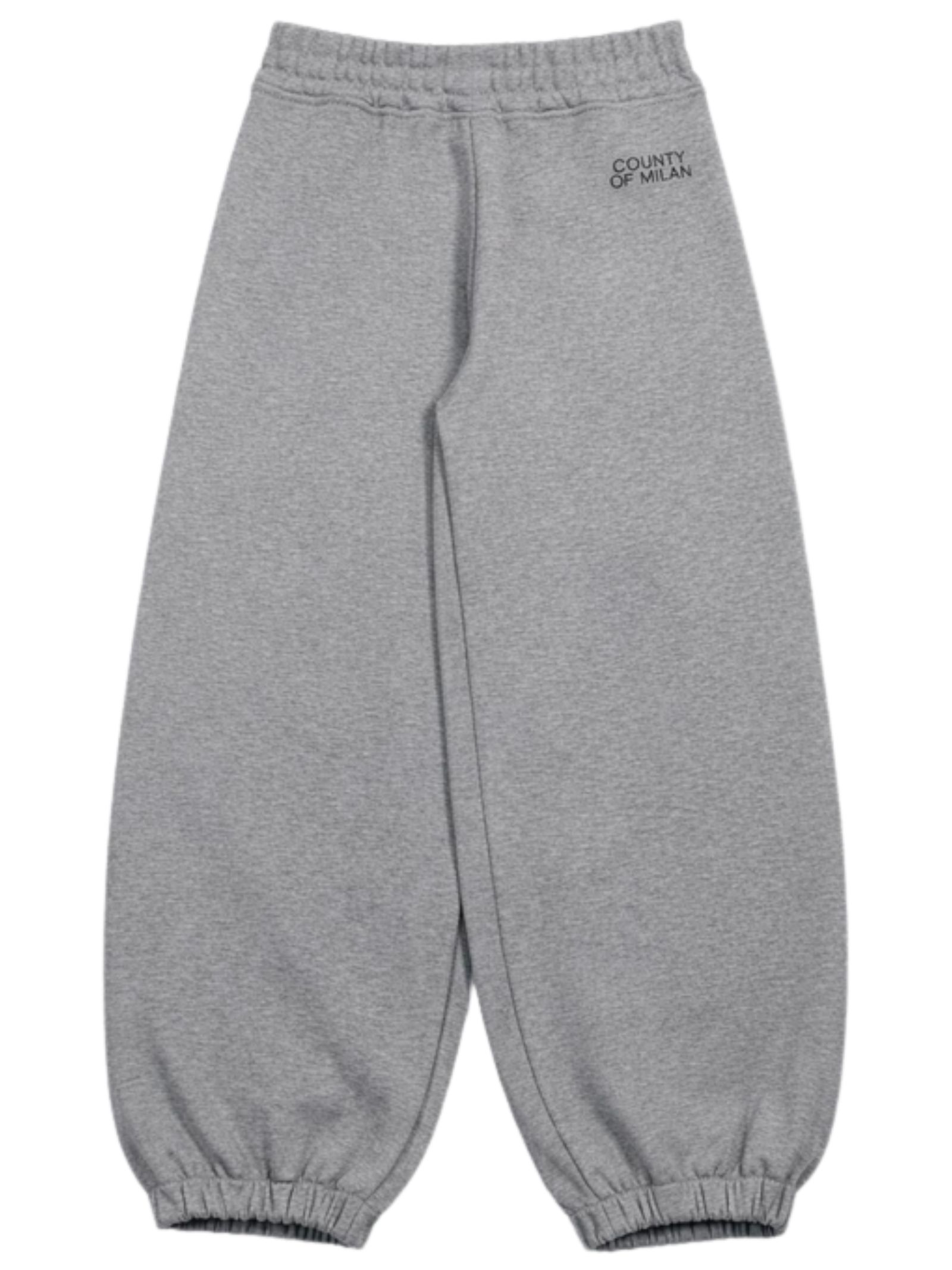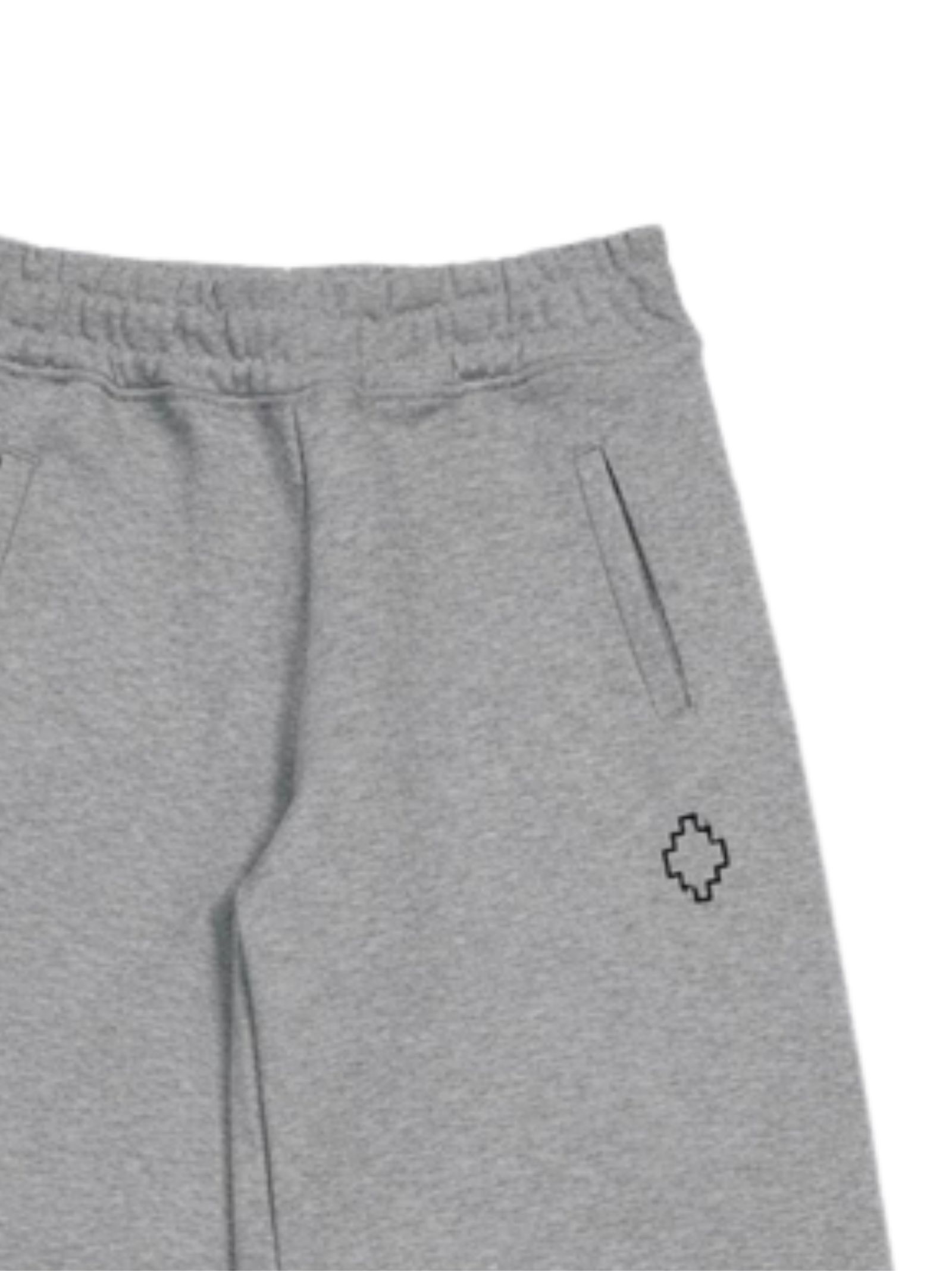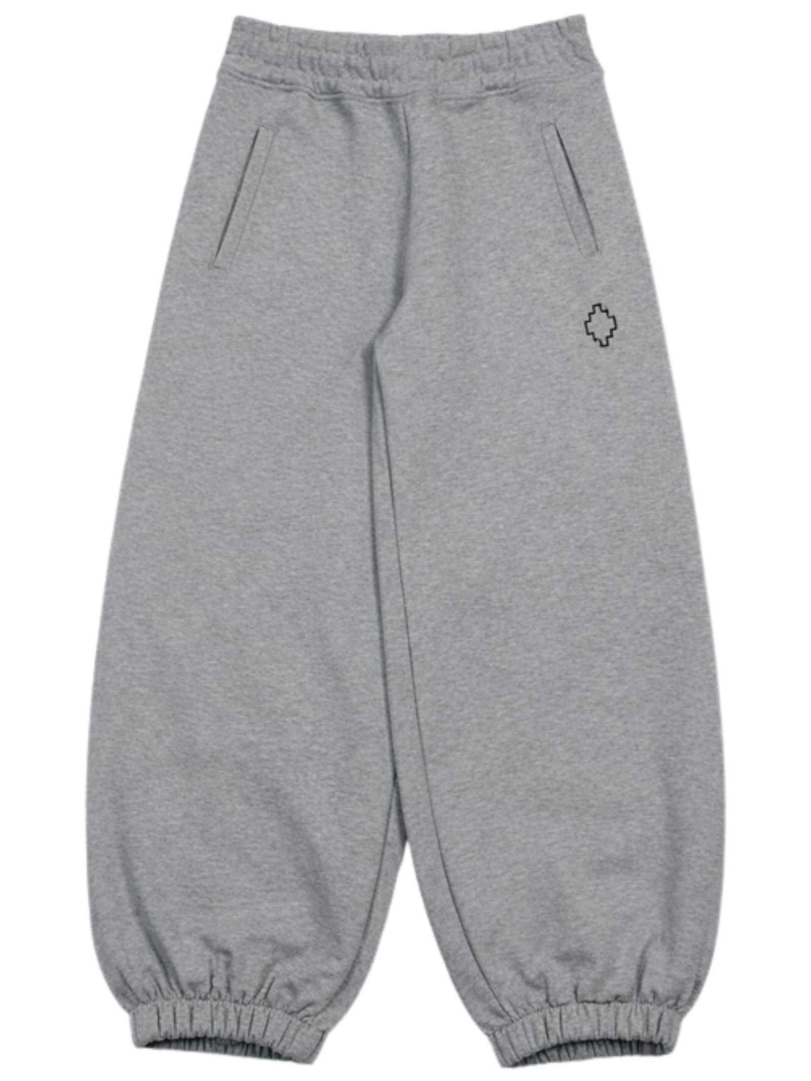Marcelo Burlon Kids pantalone di colore grigio, stampa logo a contrasto nero con glitter, modello con elastico in vita, due tasche laterali, caviglie con elastico, vestibilità ampia. Composizione: 100% cotone. Made in Italy