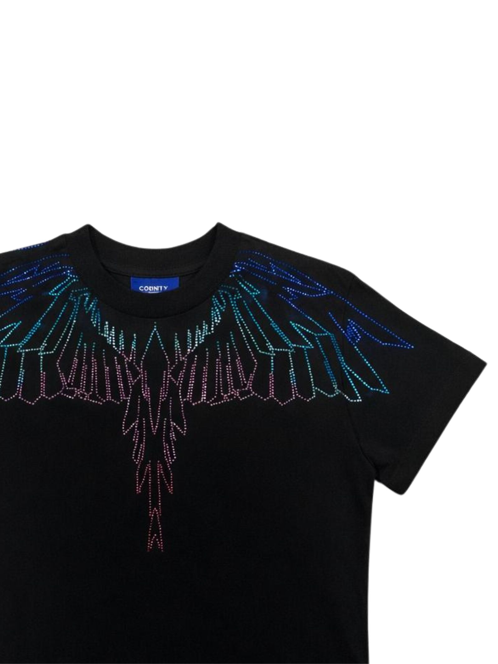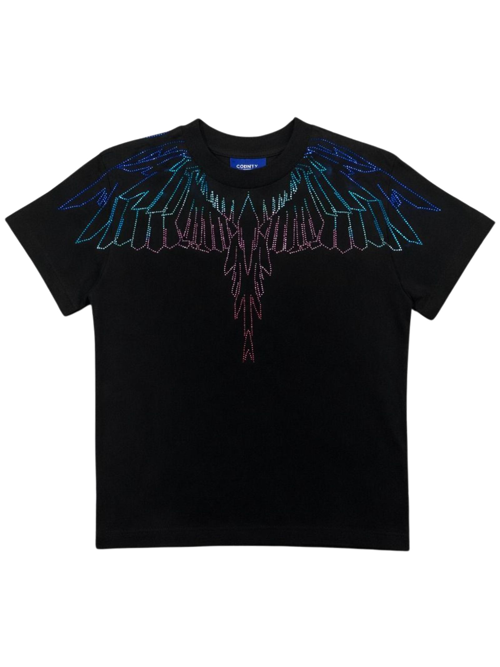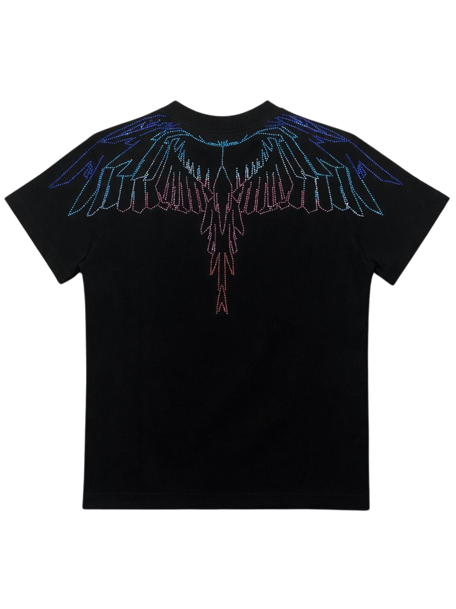 Marcelo Burlon Kids t-shirt di colore nero, modello girocollo, mezza manica, stampa in strass a contrasto multicolor su entrambi i lati, orlo dritto, vestibilità regolare. Composizione: 100% cotone. Made in Italy