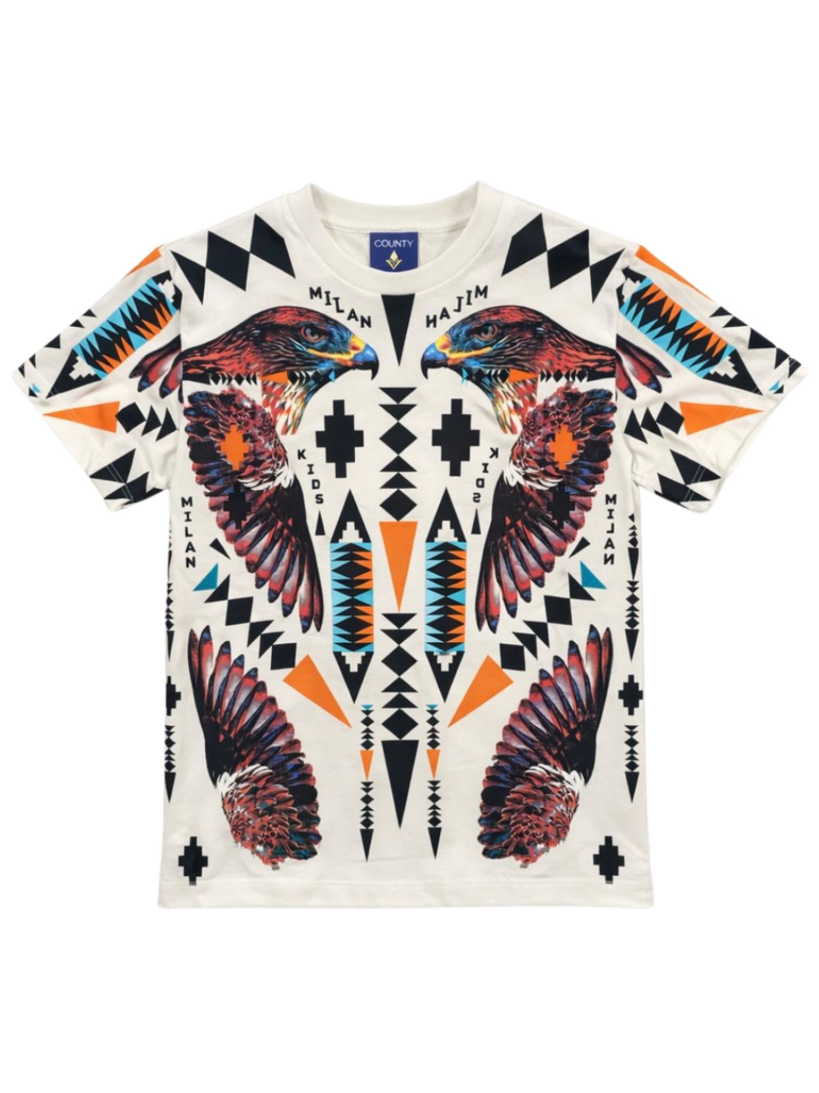 Marcelo Burlon Kids t-shirt di colore panna, modello girocollo, stampa su tutta la superficie a contrasto multicolor, orlo dritto, vestibilità regolare. Composizione: 100% cotone. Made in Italy