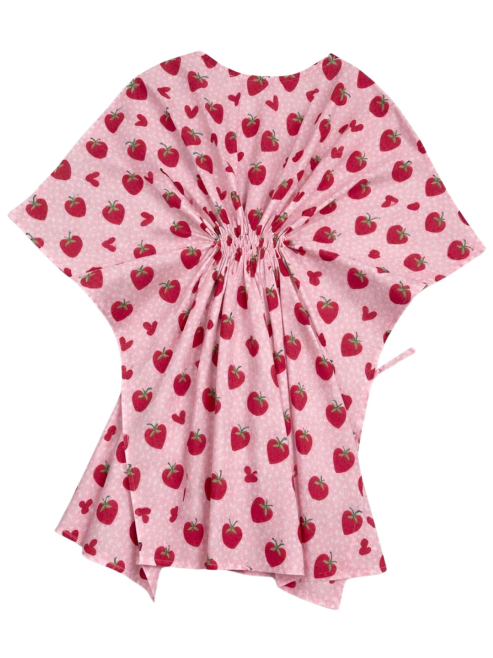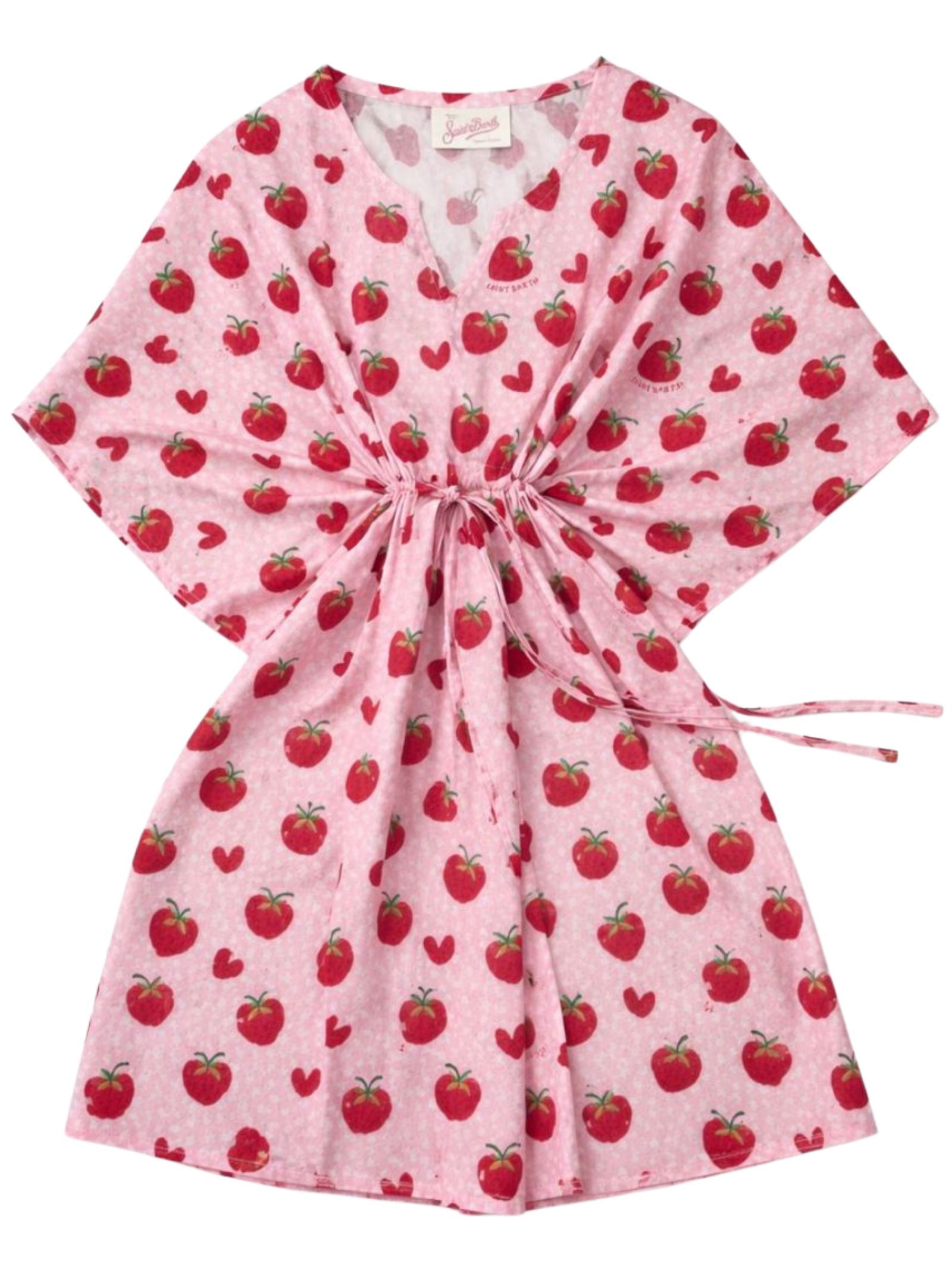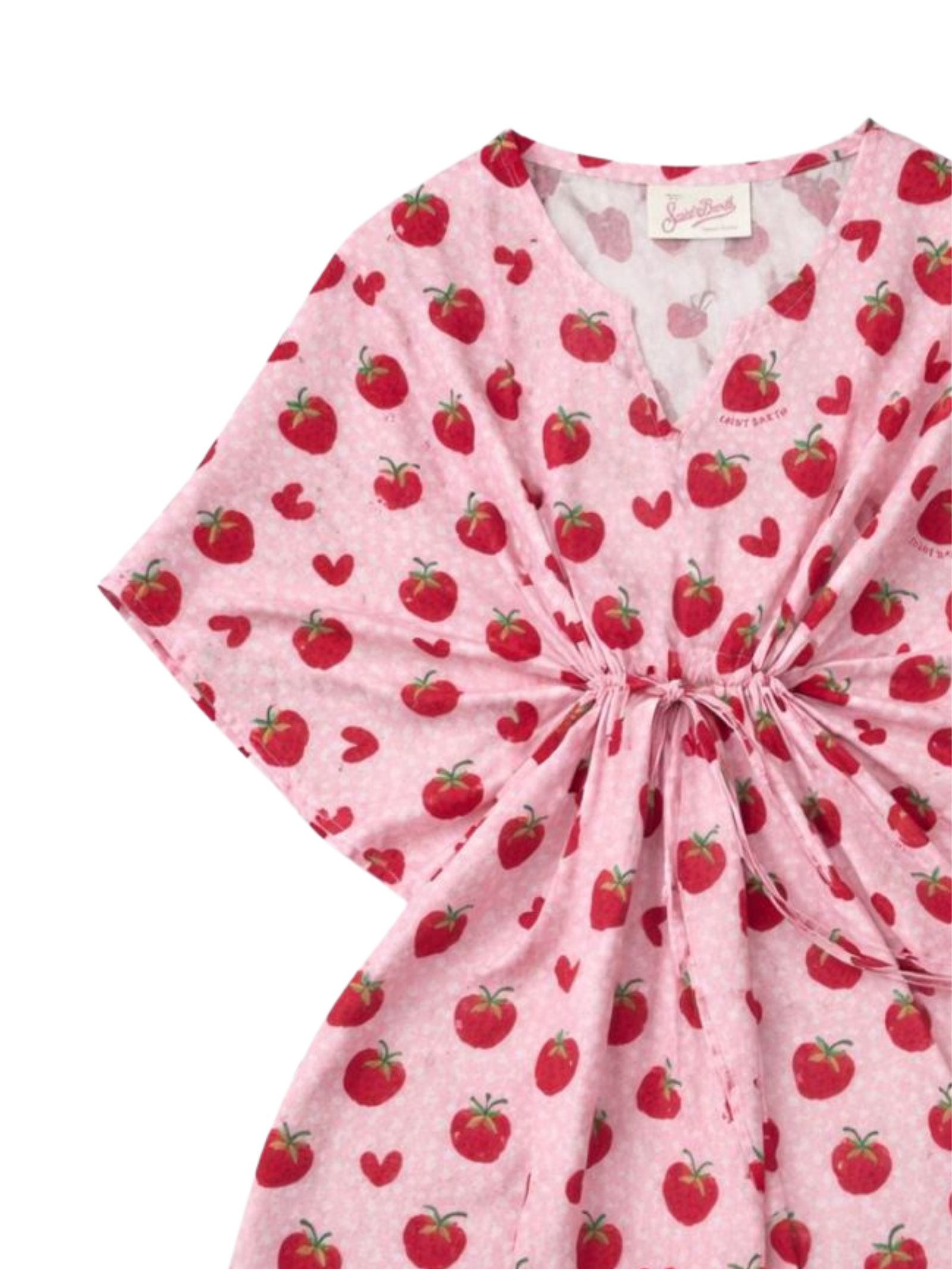 MC2 Saint Barth Kids abito caftano di colore rosa in fantasia fragole a contrasto all-over, design pull on, senza fodera, scollo rotondo con apertura, spacchi laterali, laccetto in vita. Composizione: cotone 100%