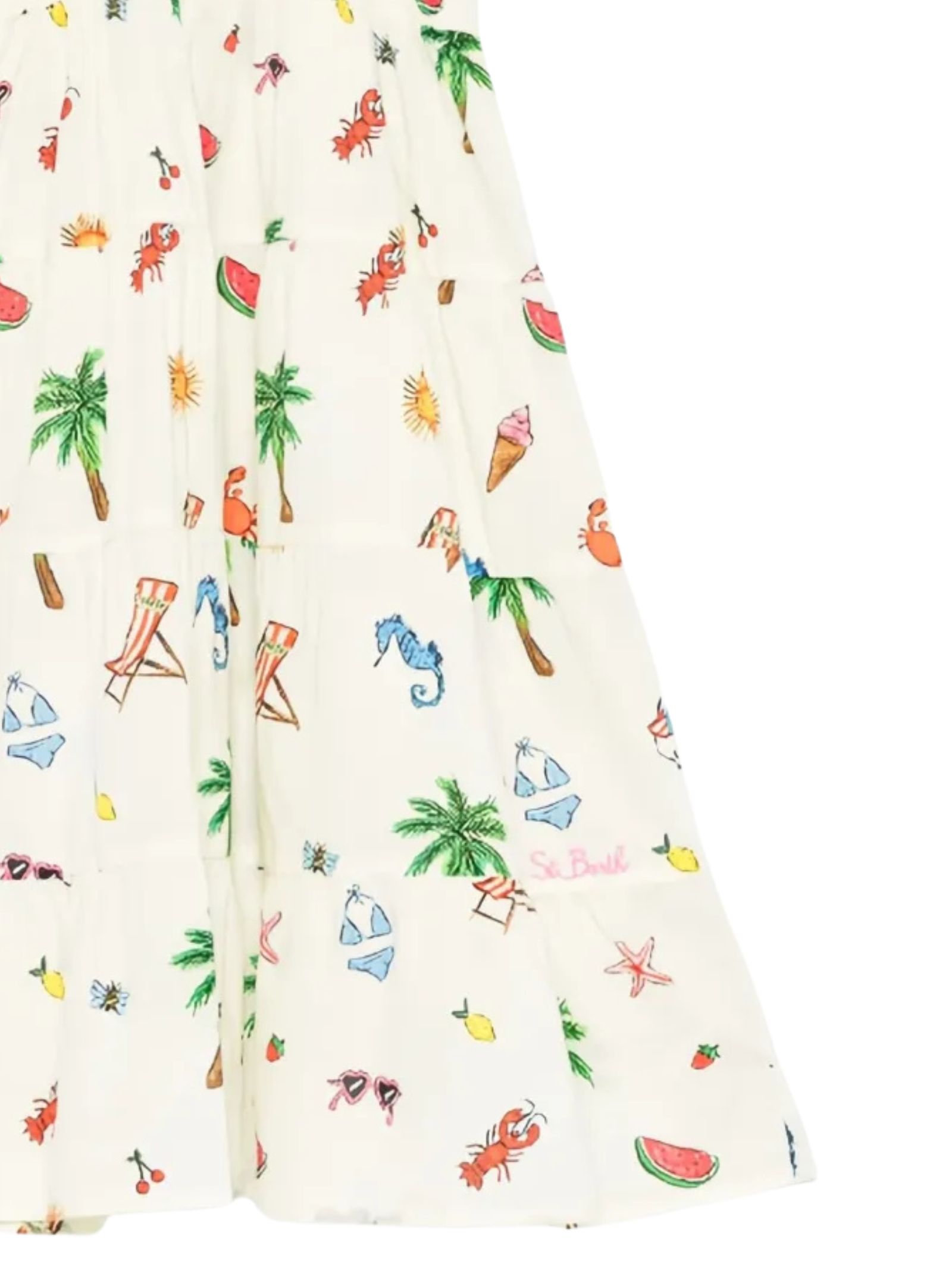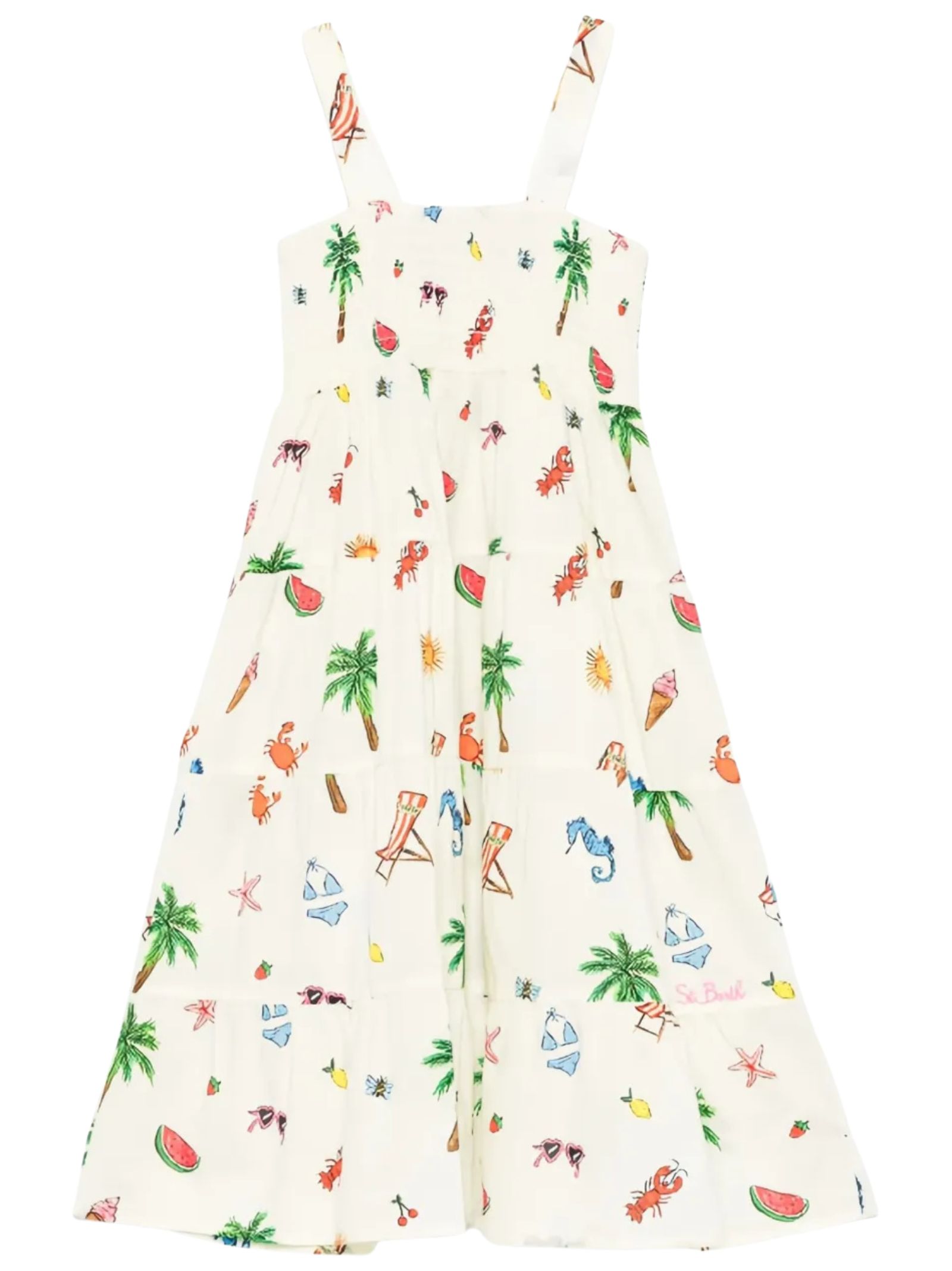 MC2 Saint Barth Kids abito di colore sabbia con stampe multicolor su tutta la superficie, modello con scollo quadrato, inserto con punto smock, orlo svasato con volant, ricamo logo. Composizione: 100% cotone