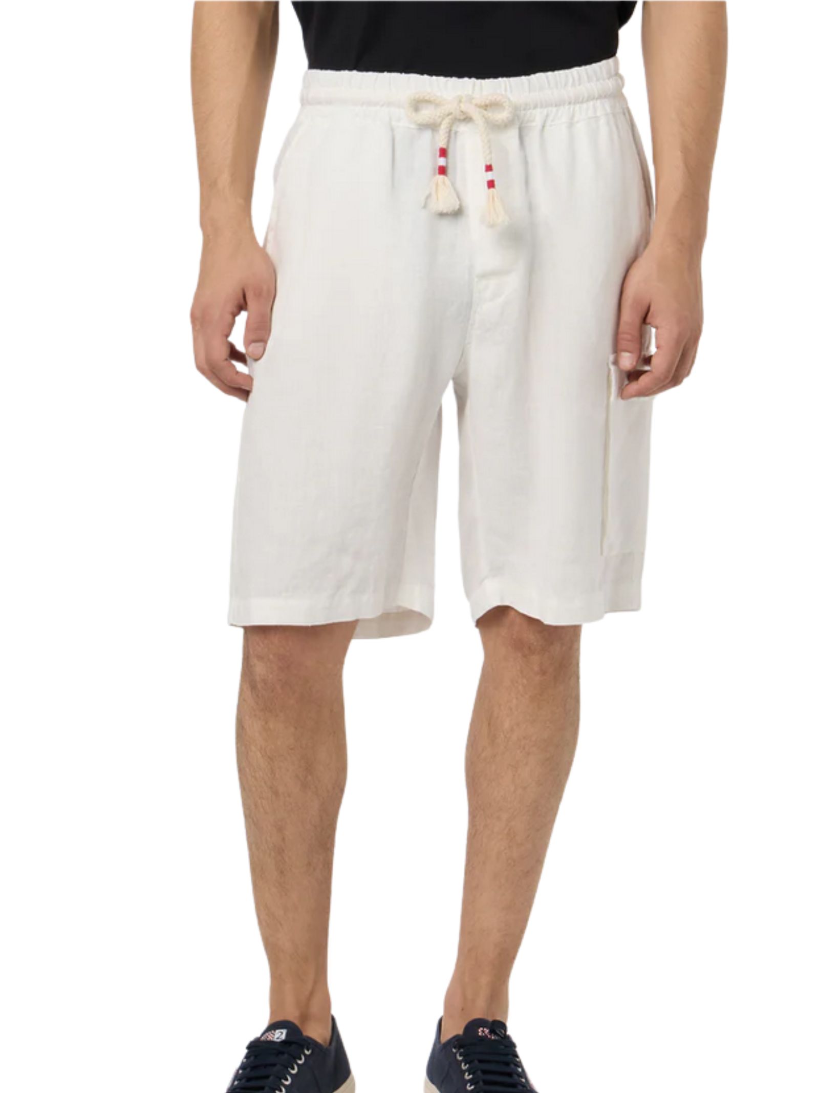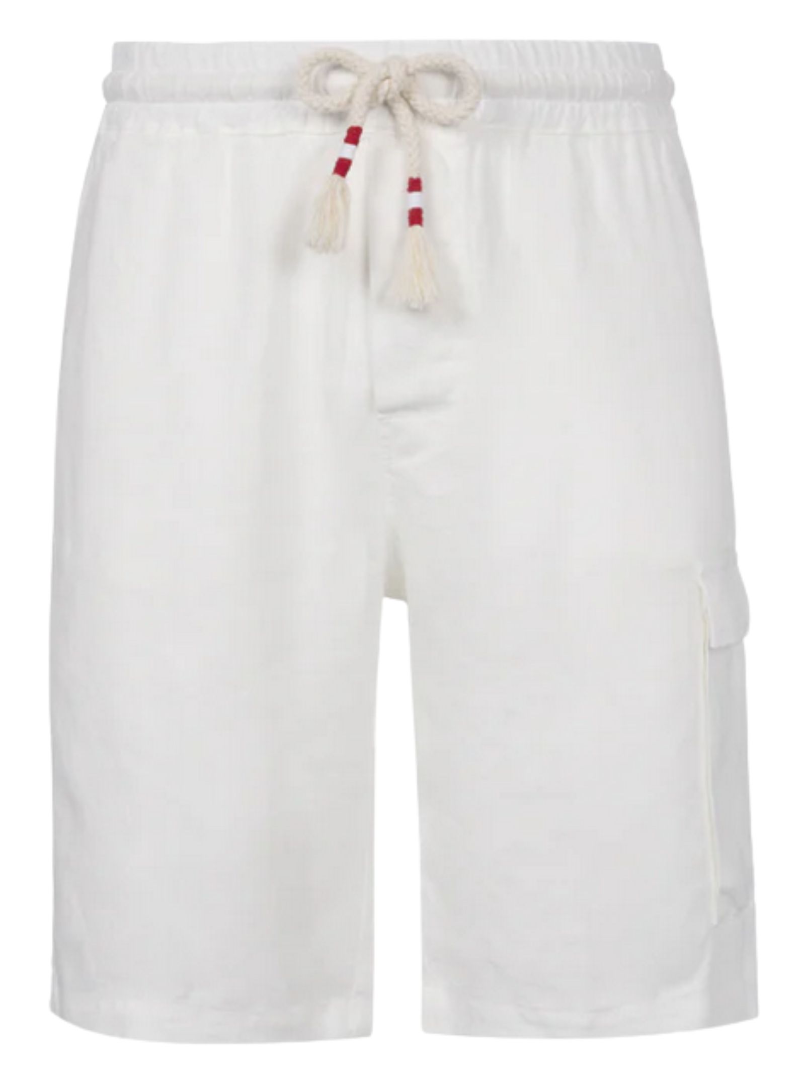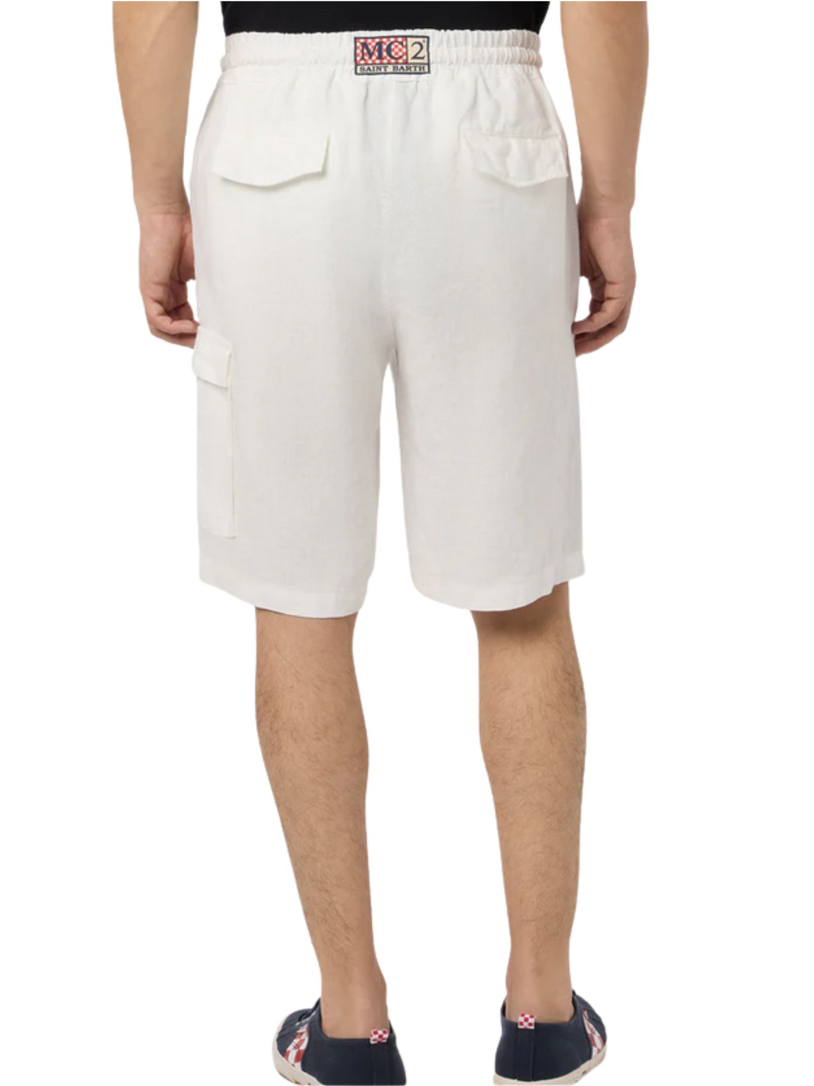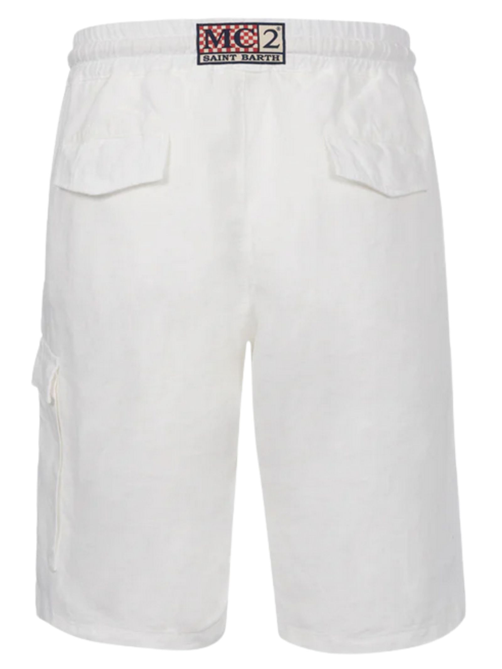 MC2 Saint Barth Kids bermuda di colore bianco, realizzato in lino, modello con elastico in vita con coulisse a contrasto, due tasche laterali, due tasche a toppa con bottoni sul retro, un tascone laterale applicato, patch con logo posteriore, vestibilità regolare. Composizione: 100% LINO. Made in Italy