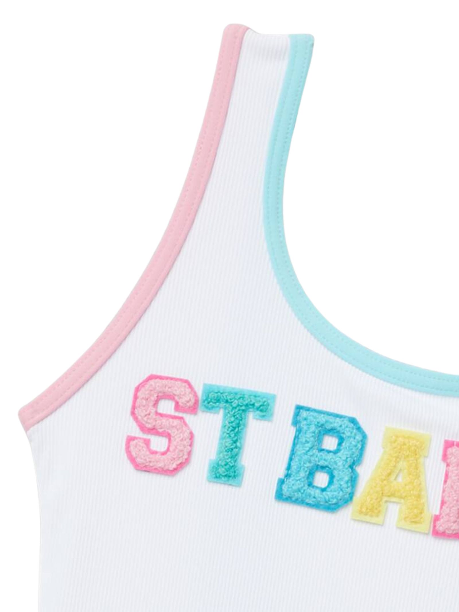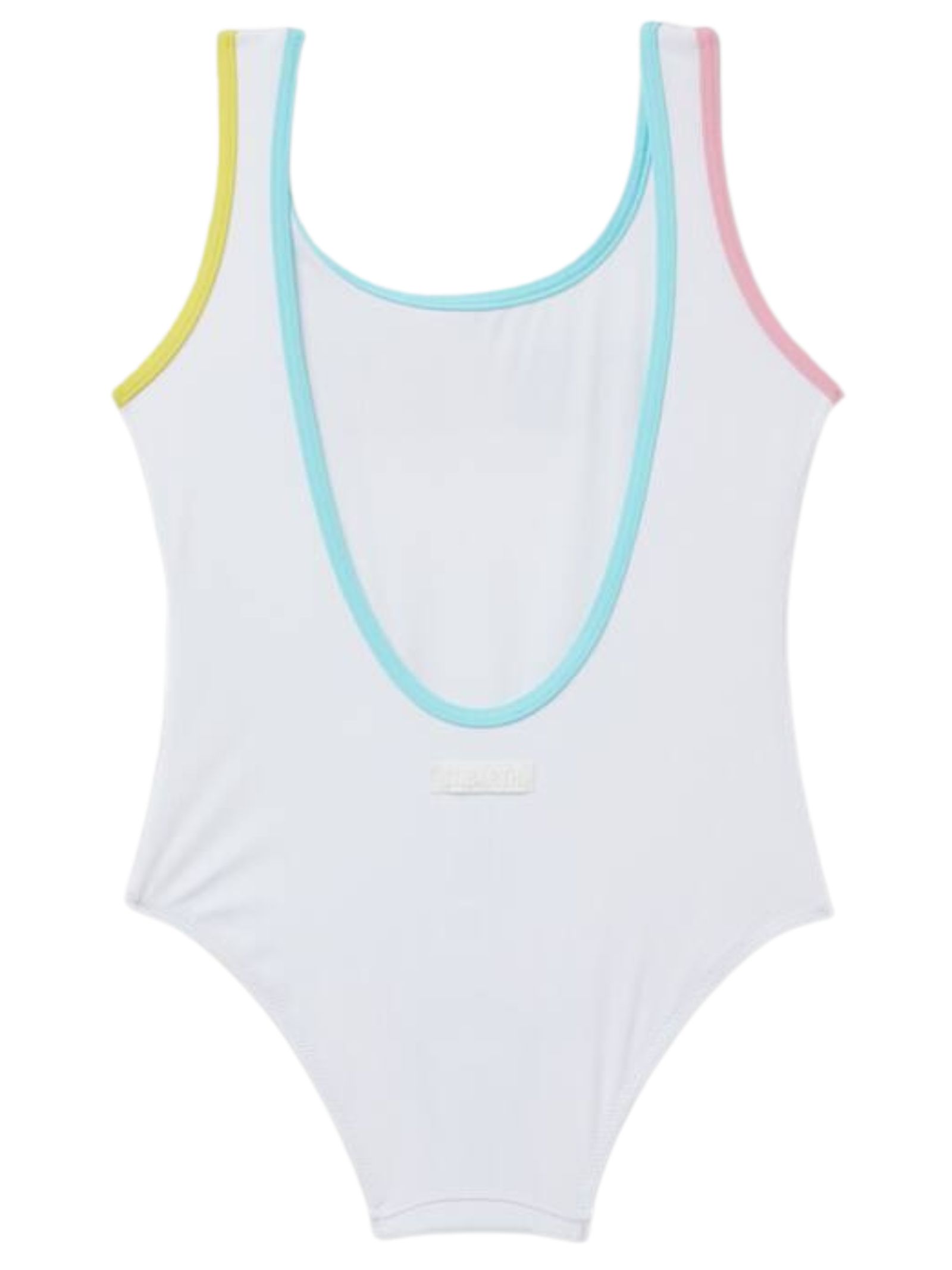MC2 Saint Barth Kids costume da bagno di colore bianco, logo e bordi a contrasto multicolor, modello intero, parte superiore con bretelle, patch con logo centrale in lettering multicolor in rilievo. Composizione: 90% poliammide 10% elastan. Made in Italy