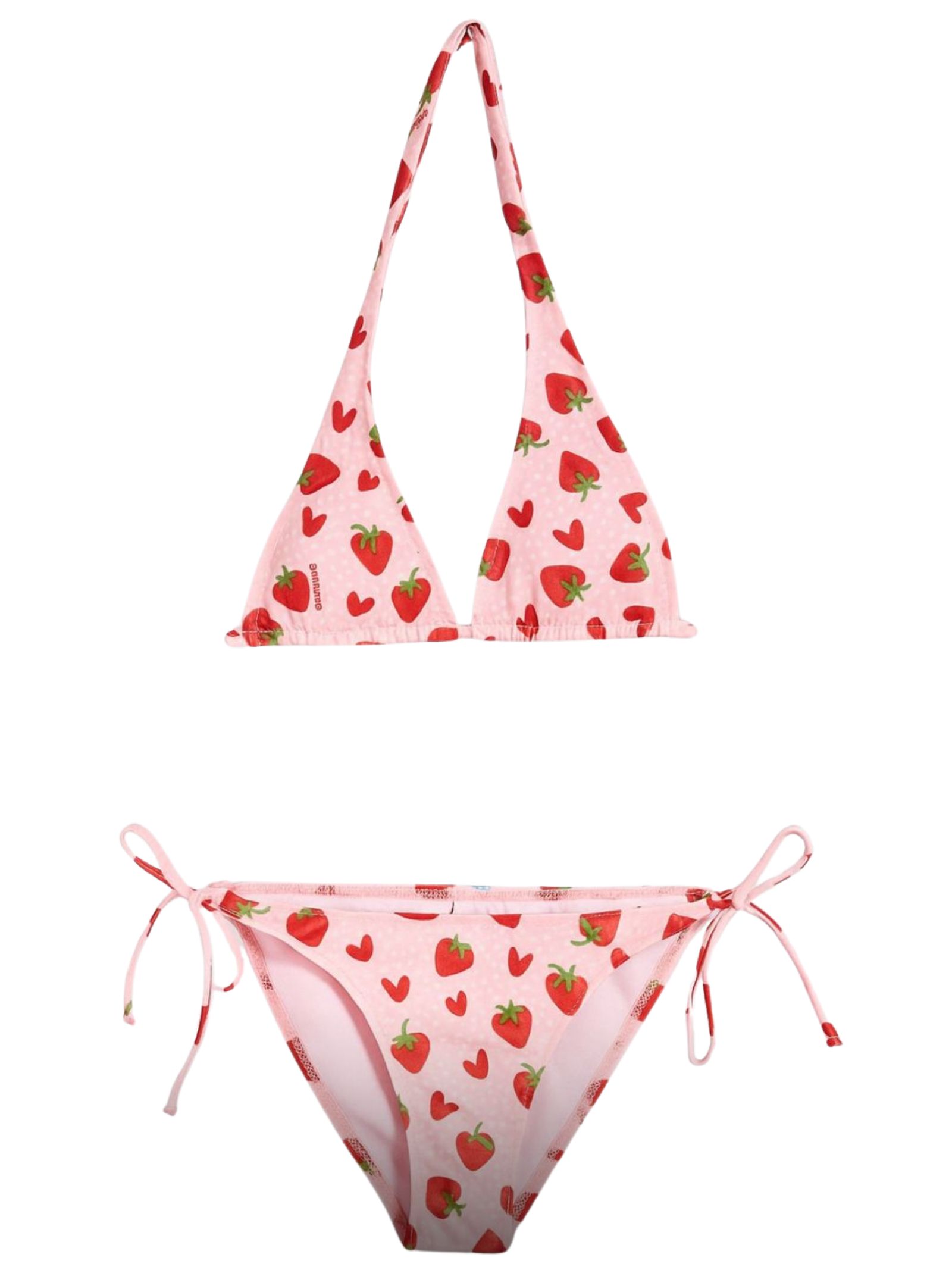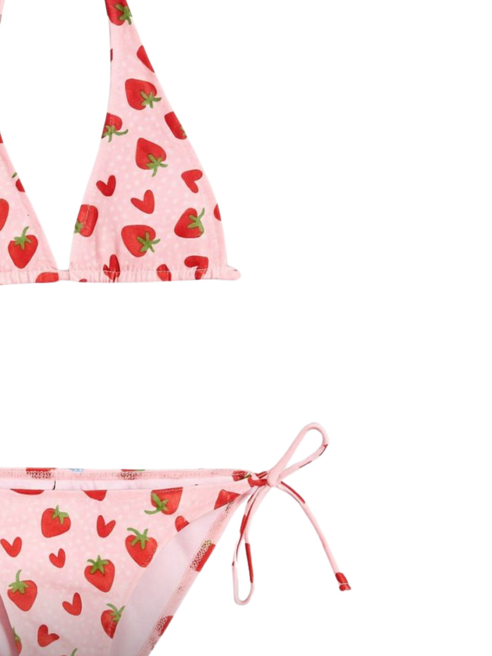 MC2 Saint Barth Kids costume da bagno di colore rosa, stampa fragole a contrasto rosso, modello due pezzi, parte superiore bikini con bretelle regolabili, slip classico con laccetti, patch con logo applicato sul retro. Composizione: 90% poliammide 10% elastan. Made in Italy