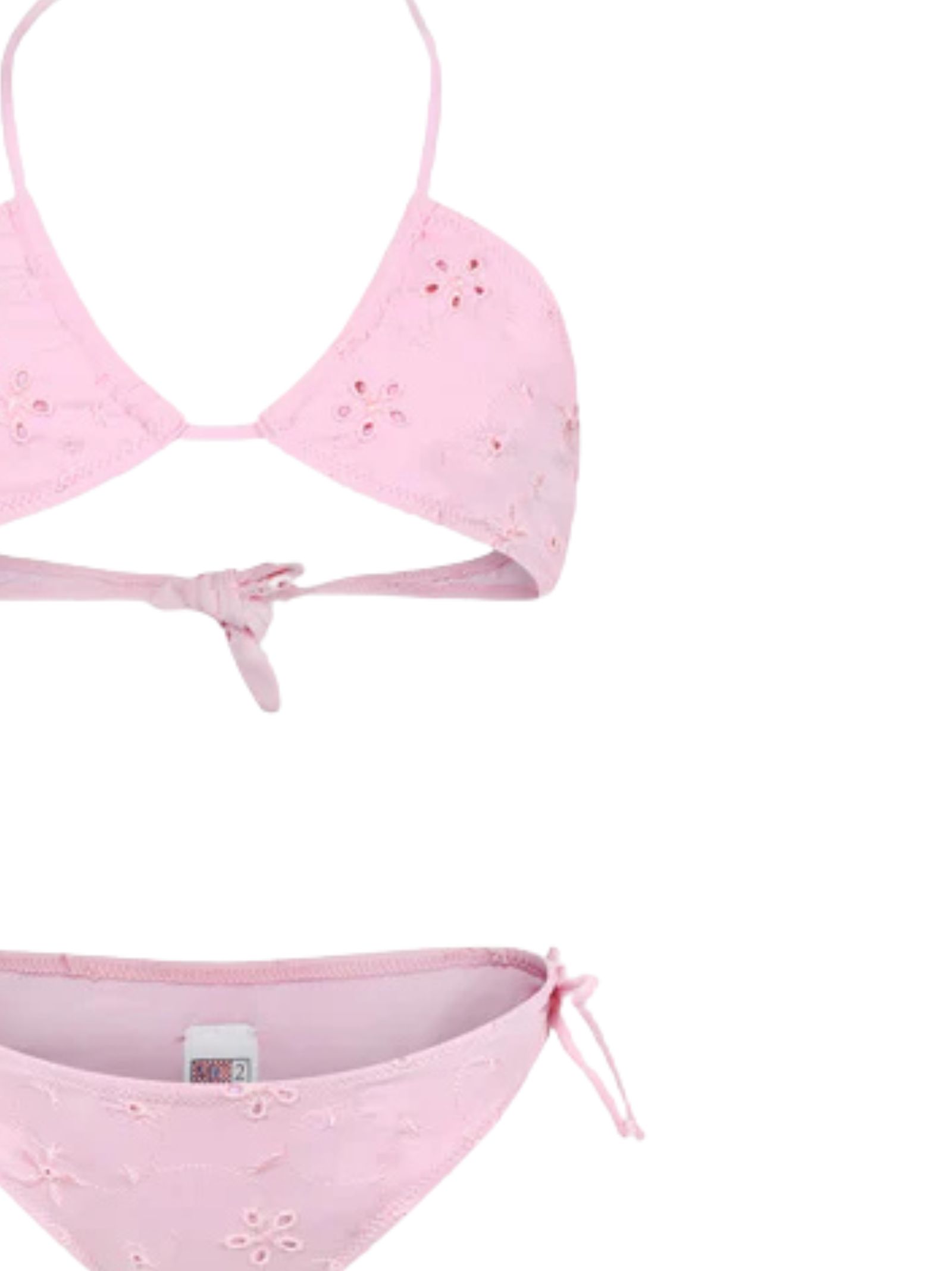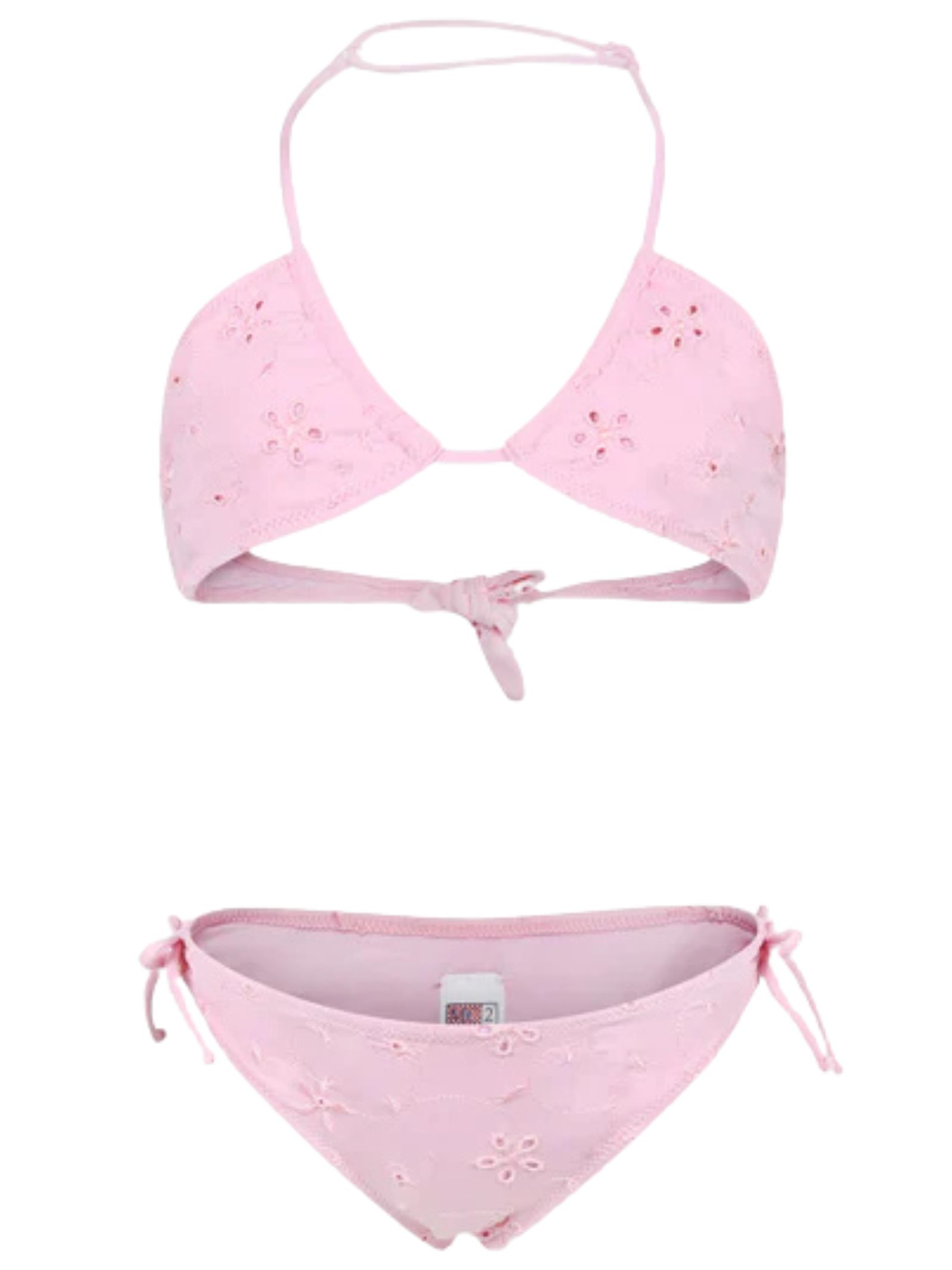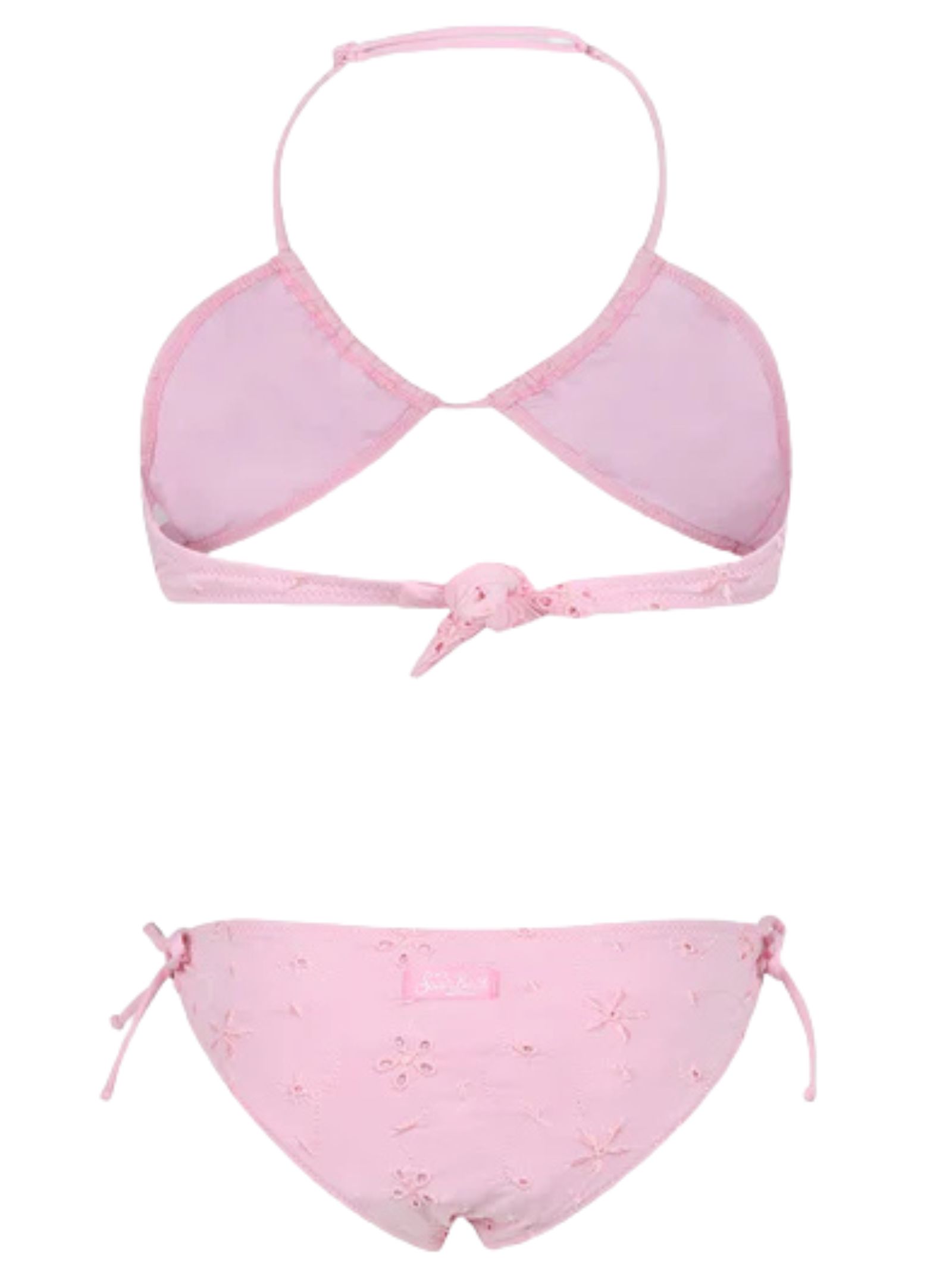 MC2 Saint Barth Kids costume da bagno di colore rosa, caratterizzato da ricamo fiori traforati, modello due pezzi, parte superiore a triangolo con laccetto regolabile, slip classico con nodi laterali, patch con logo applicato. Composizione: 90% poliammide 10% elastan. Made in Italy