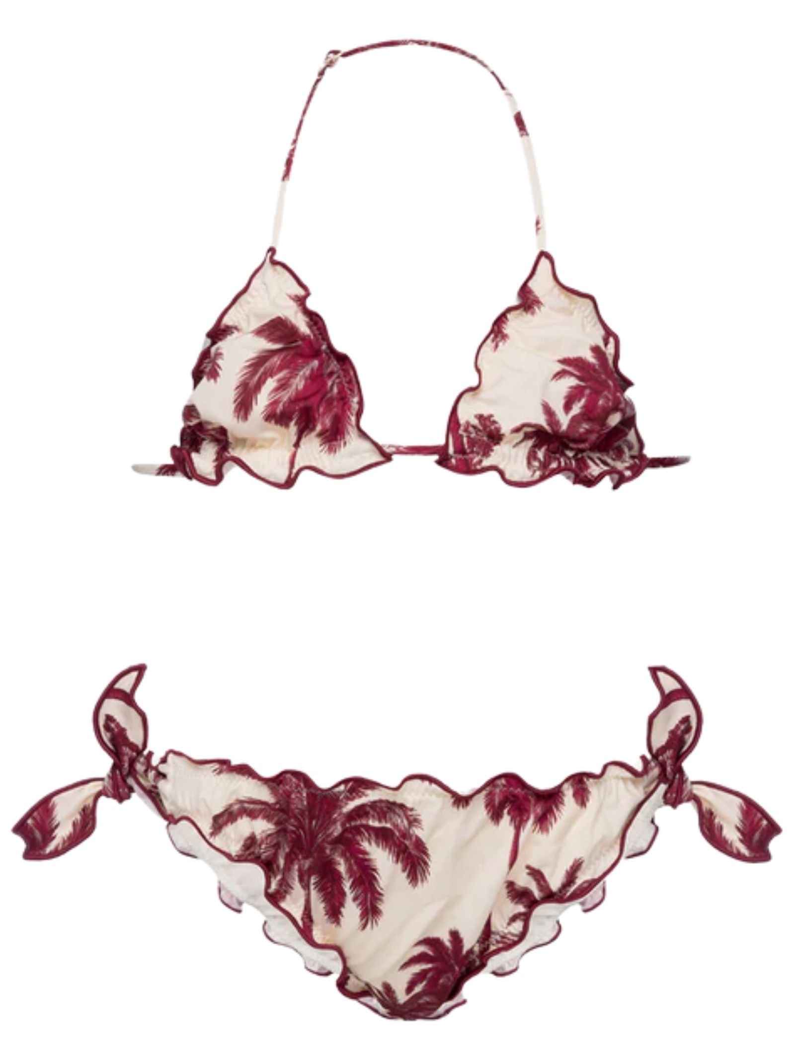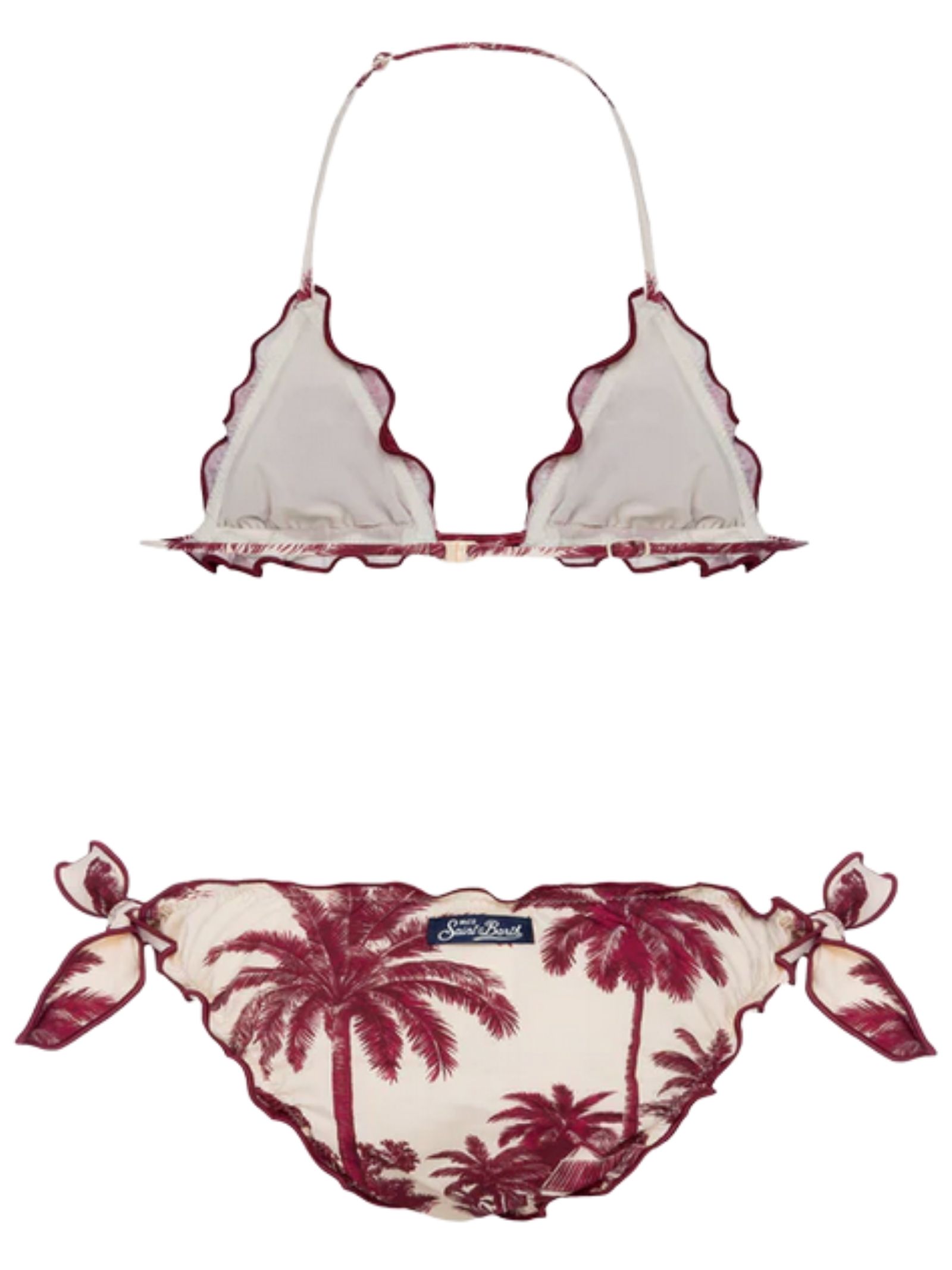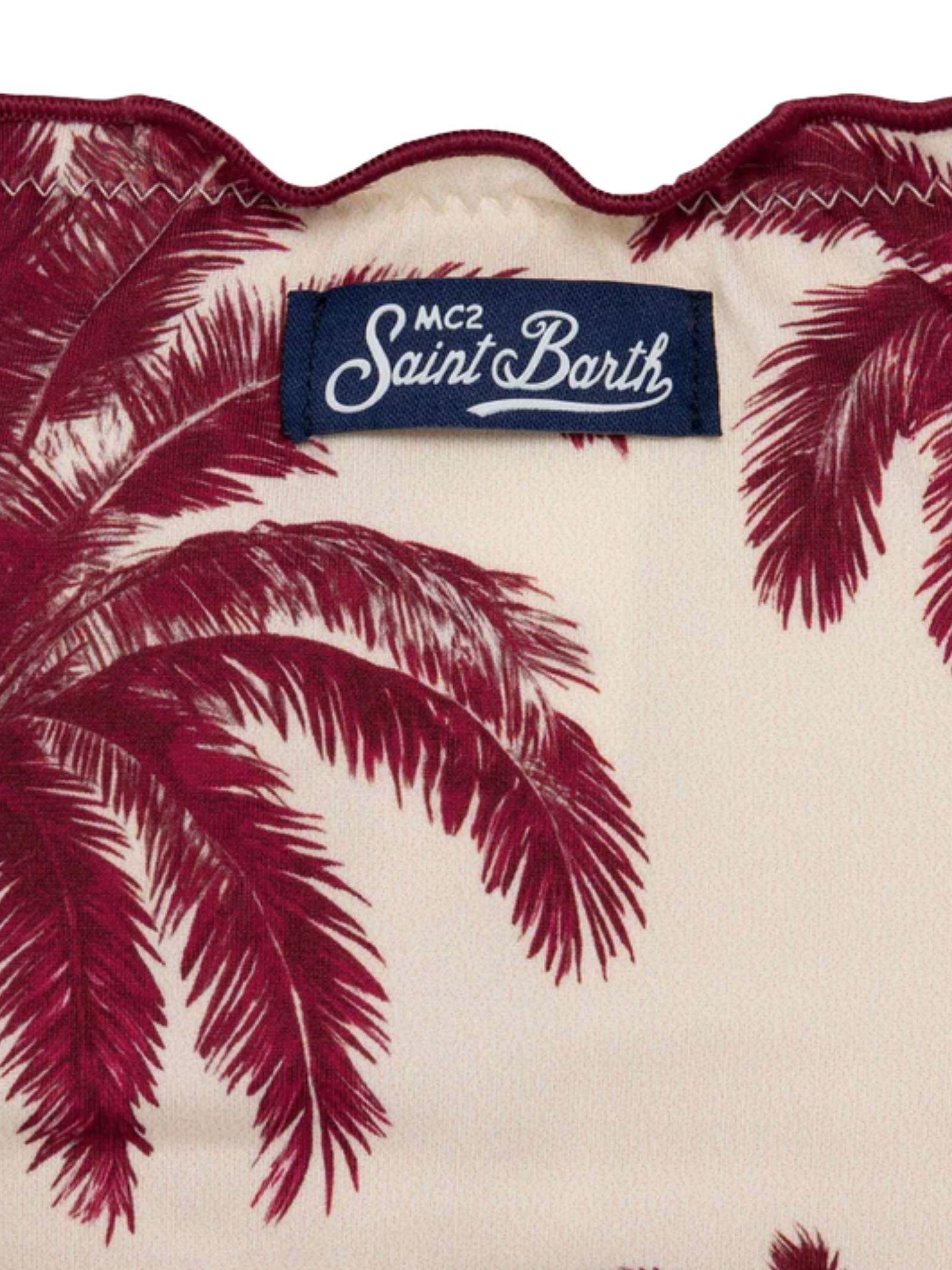 MC2 Saint Barth Kids costume da bagno di colore sabbia con stampa all-over palme a contrasto bordeau, modello due pezzi, parte superiore a triangolo con bretelle regolabili, slip classico con nodi, patch con logo applicato. Composizione: 90% poliammide 10% elastan