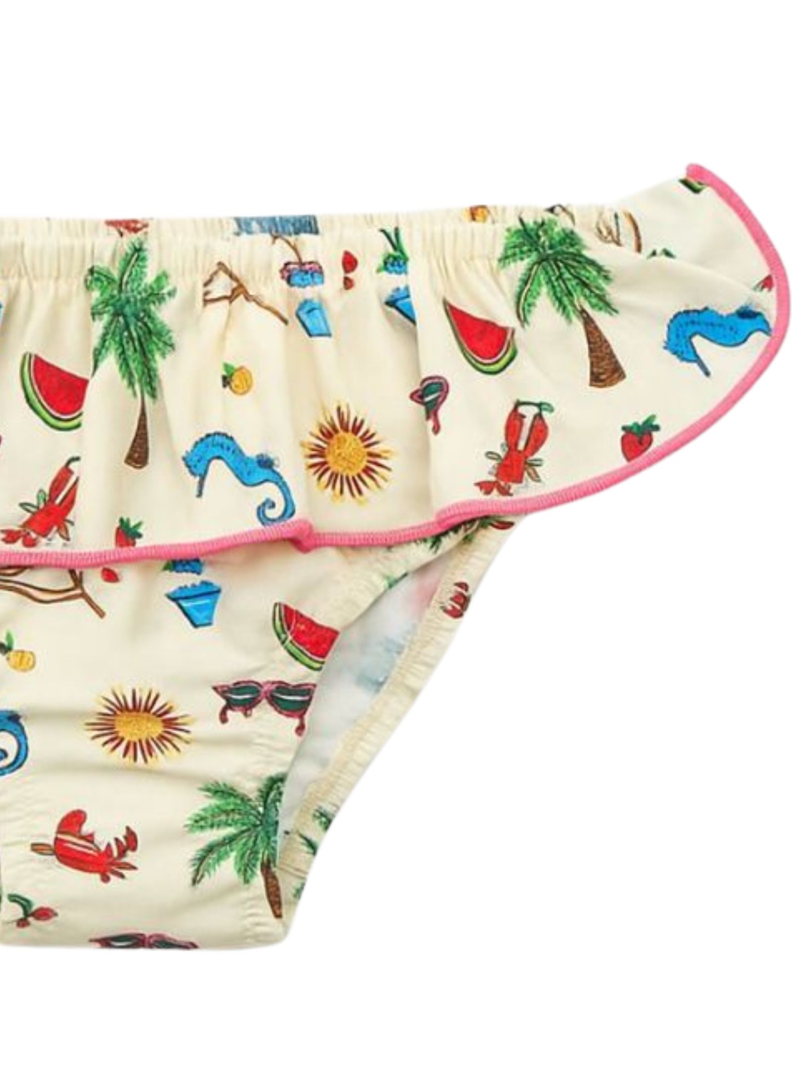 MC2 Saint Barth Kids costume da bagno di colore sabbia, stampe a contrasto multicolor su tutta la superficie, vita elastica con volant, patch con logo applicato sul retro. Composizione: 90% poliammide 10% elastan