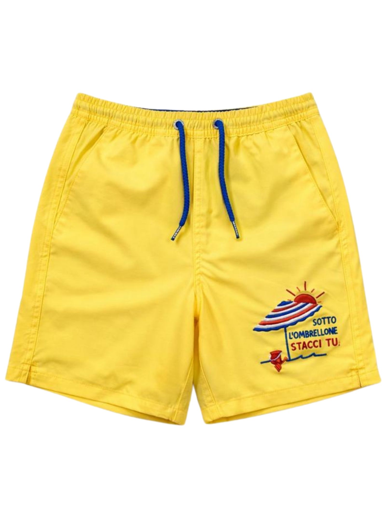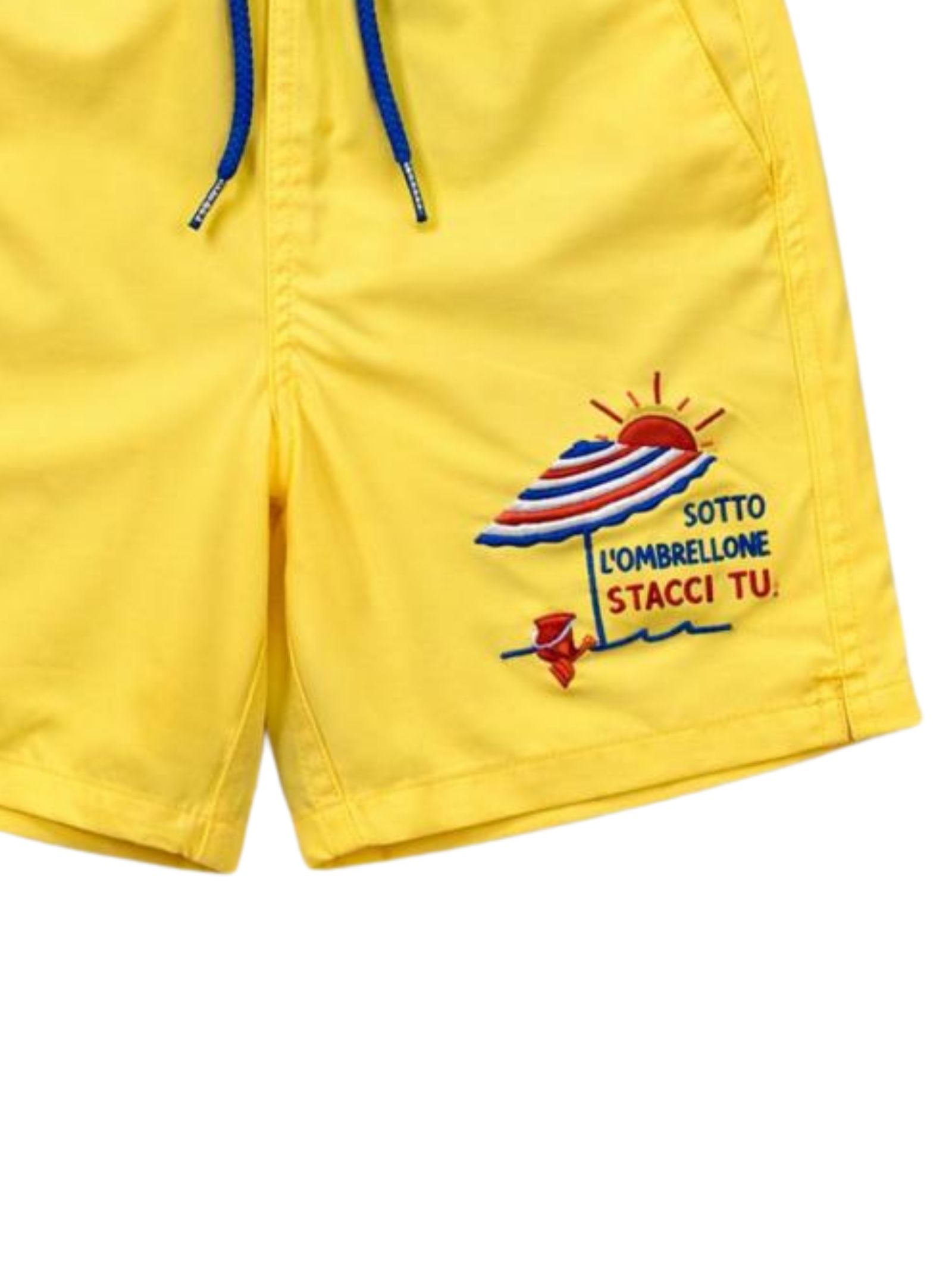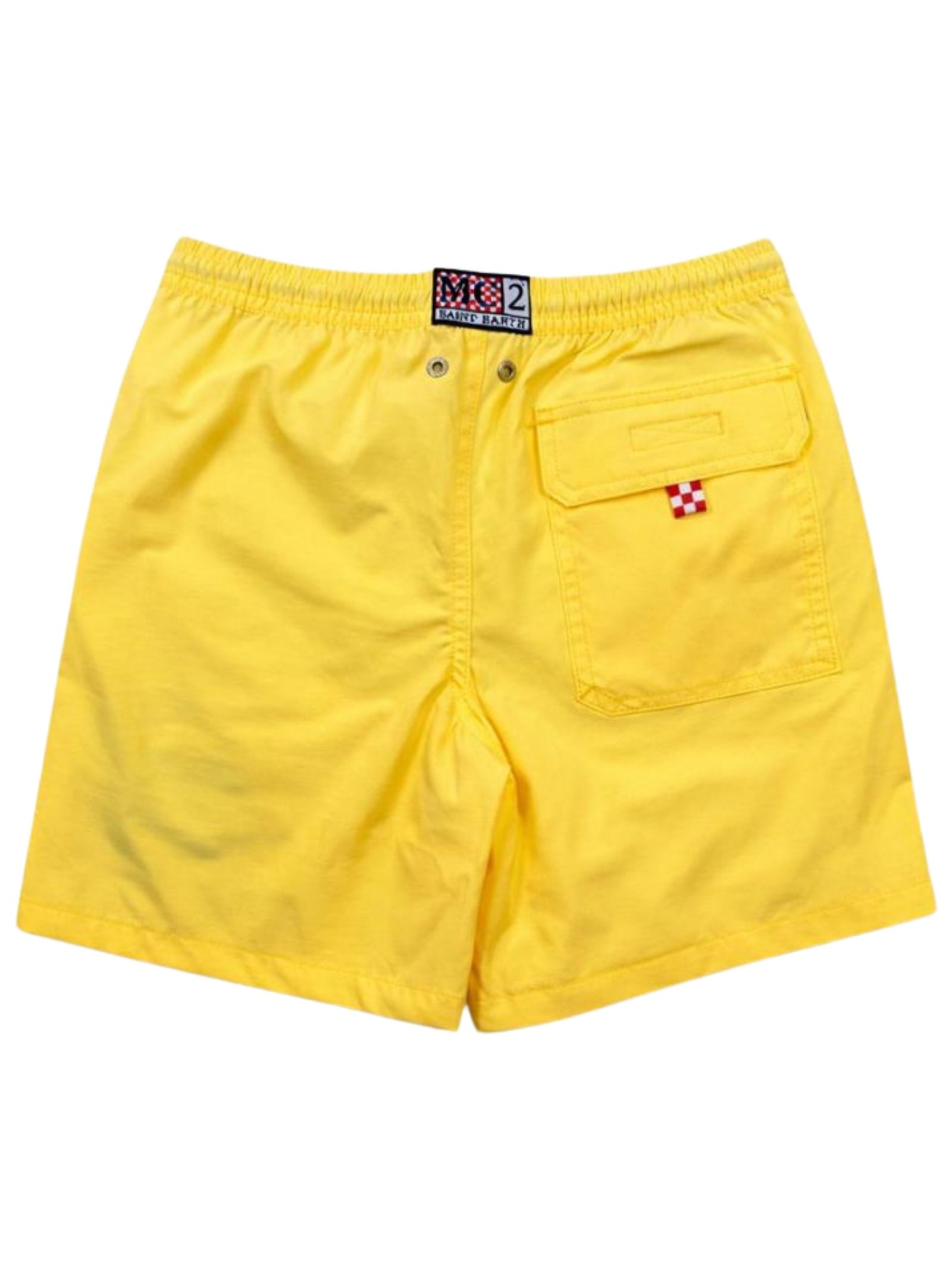MC2 Saint Barth Kids costume da bagno di colore giallo, tessuto ad asciugatura rapida, ricamo sul fronte, vita elasticizzata con coulisse regolabile, fodera interna in rete, due tasche laterali, tasca posteriore applicata con chiusura in velcro, occhielli brandizzati, etichetta esclusiva MC2 Saint Barth sul retro. Composizione: 92% Poliestere 8% elastan