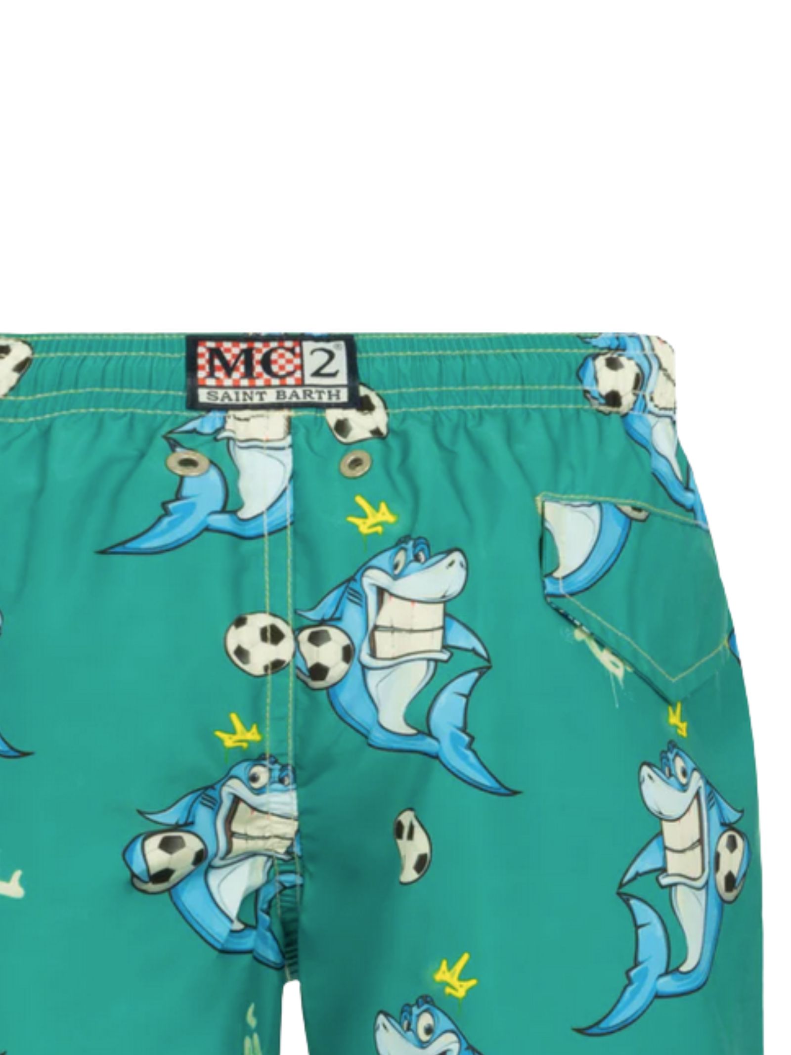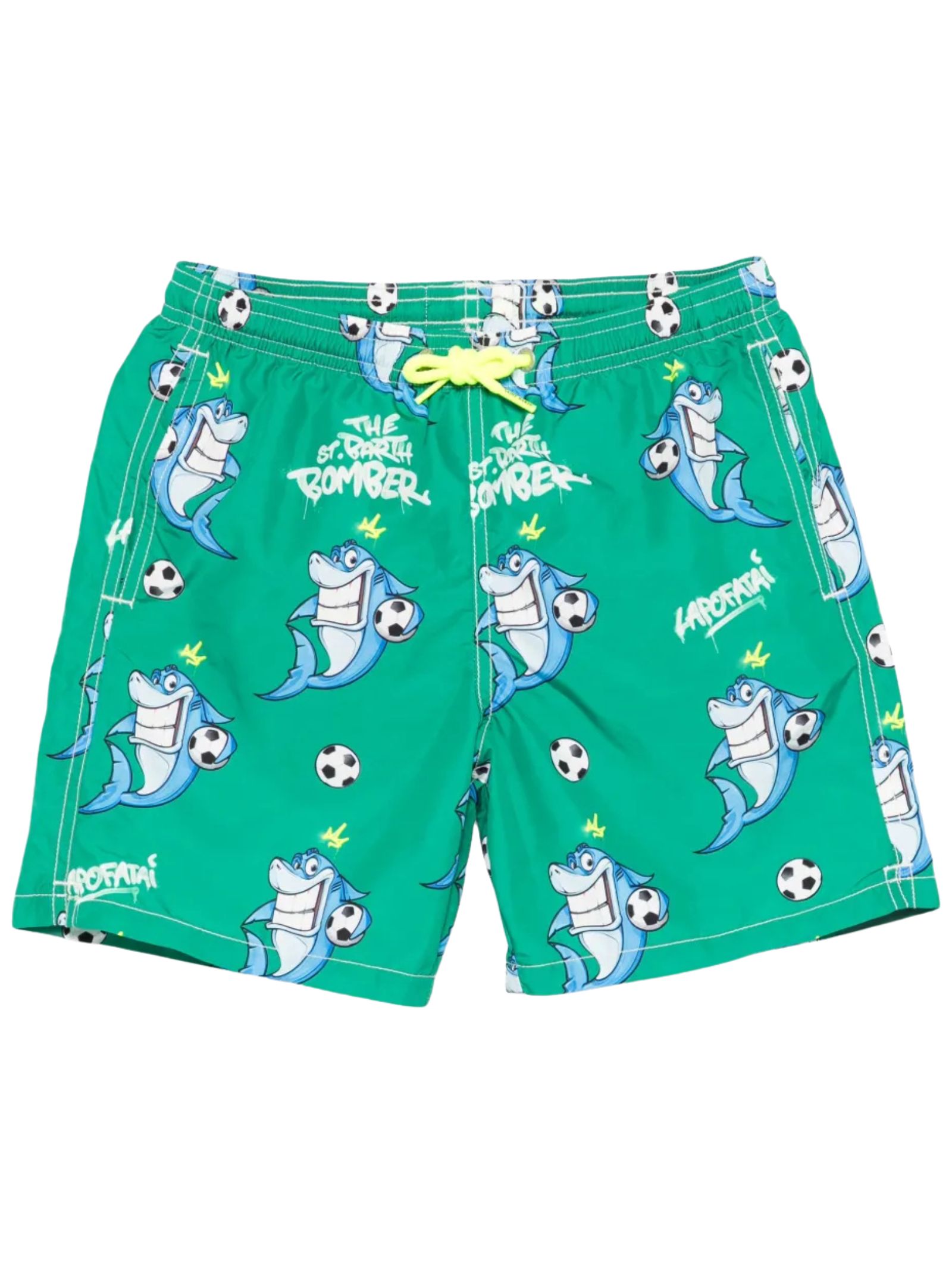 MC2 Saint Barth Kids costume da bagno Jean Lighting Cpt Shark Bomber di colore verde in fantasia squali a contrasto, vita con coulisse elasticizzata, logo sul retro, due tasche laterali a filetto e tasca posteriore applicata. Composizione: 100% poliestere