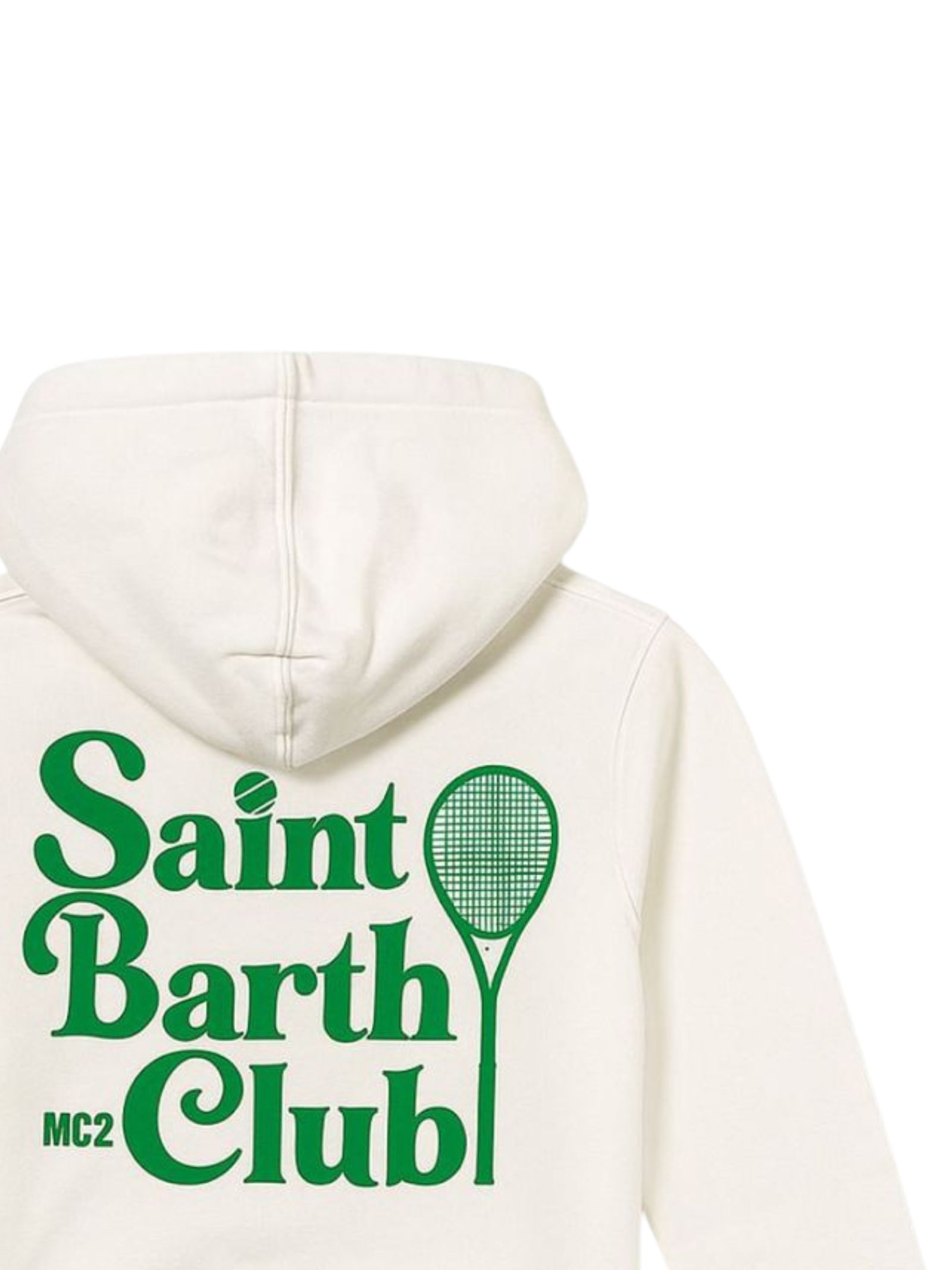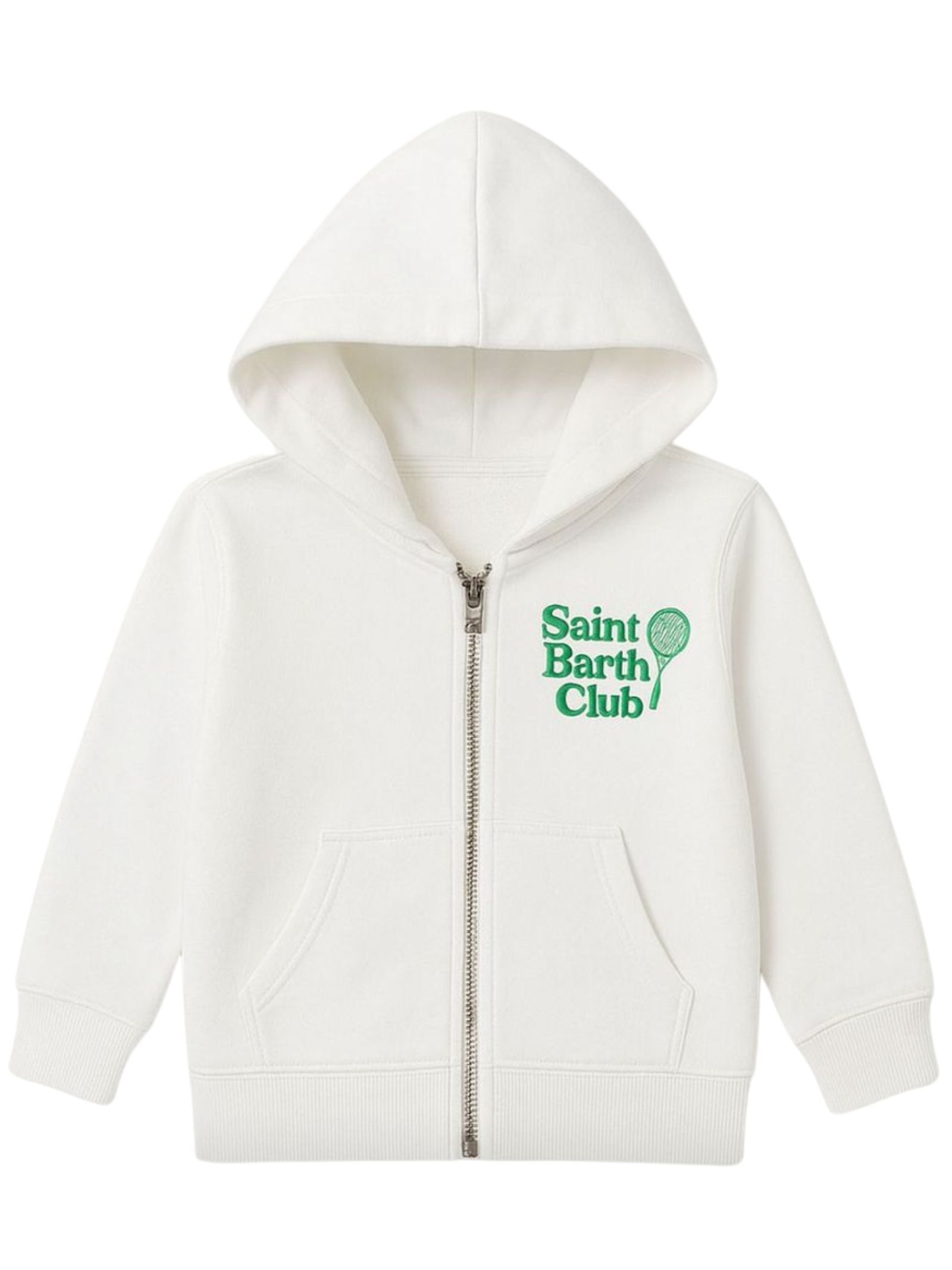 MC2 Saint Barth Kids felpa di colore bianco, modello con cappuccio, manica lunga, zip centrale, maxi stampa sul retro e sul petto a contrasto verde con logo, due tasche laterali, orli a costine, vestibilità regolare. Composizione: 100% cotone