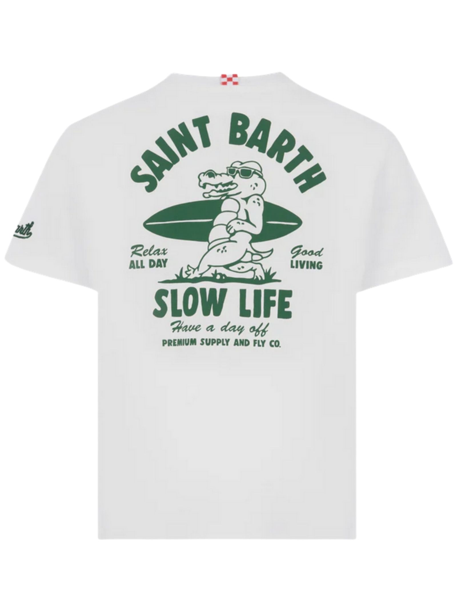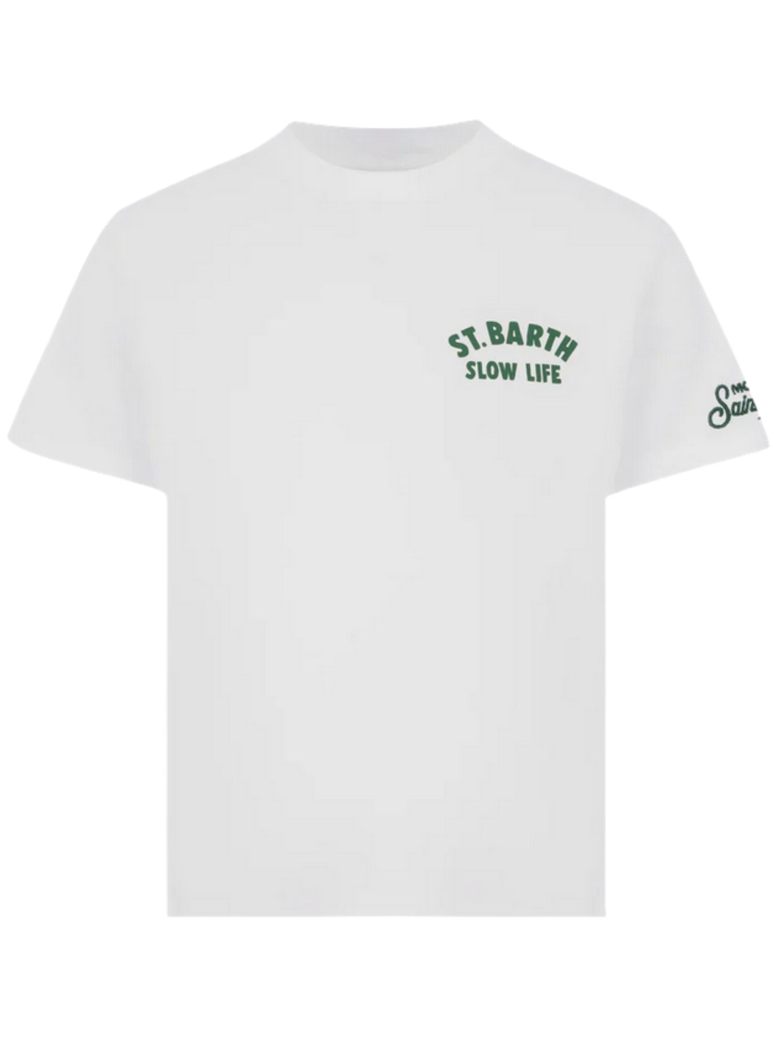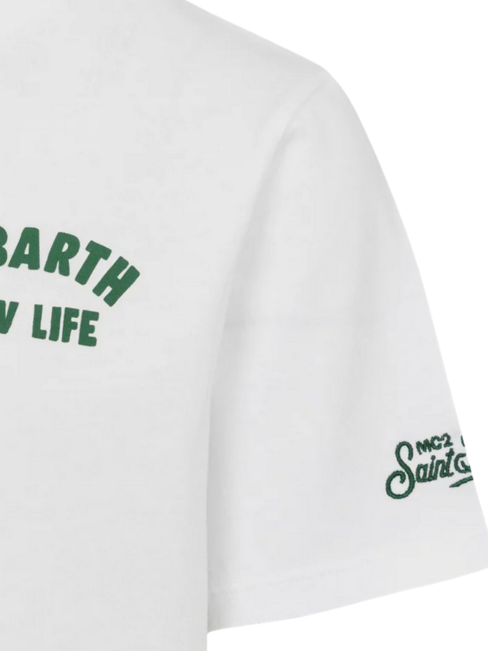 MC2 Saint Barth Kids t-shirt di colore bianco, realizzata in cotone, design girocollo, mezza manica, ricamo sul petto e sul retro a contrasto verde, vestibilità regolare. Composizione: 100% cotone