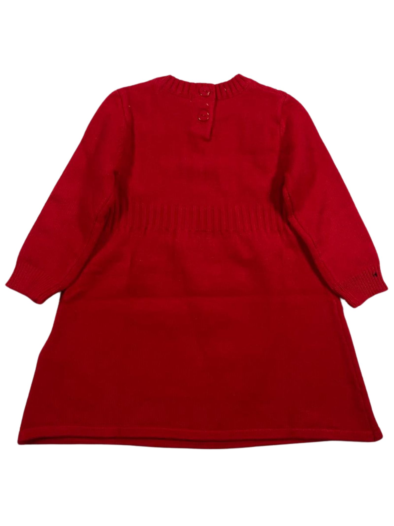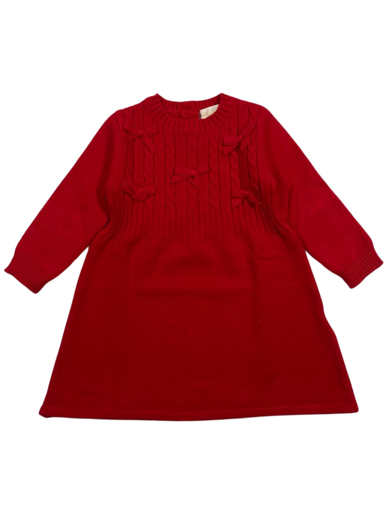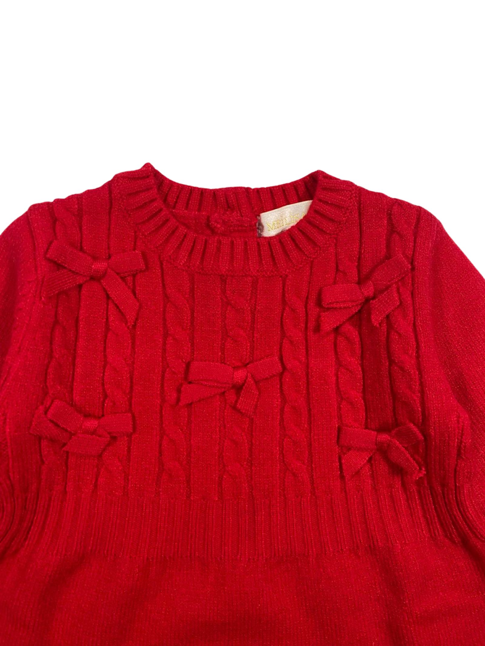Meilisa Bai Kids abito realizzato a maglia di colore rosso, design manica lunga, girocollo, parte superiore a coste intrecciate, applicazione fiocchetti, modello svasato, apertura con bottoni sul retro, vestibilità regolare. Composizione: 50% viscosa 28% poliestere 22% nylon. Made in Italy