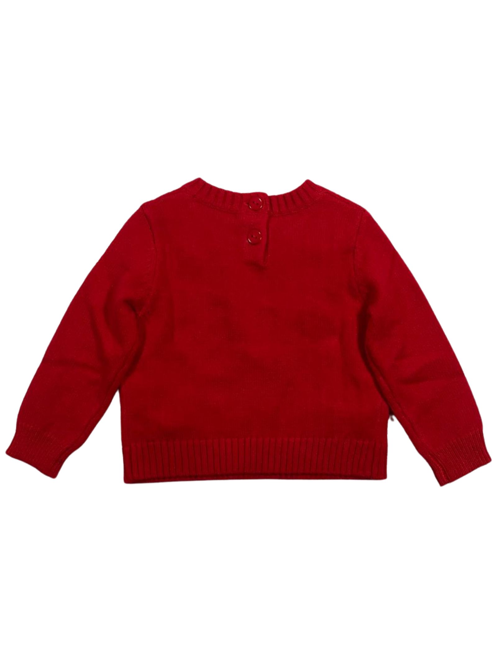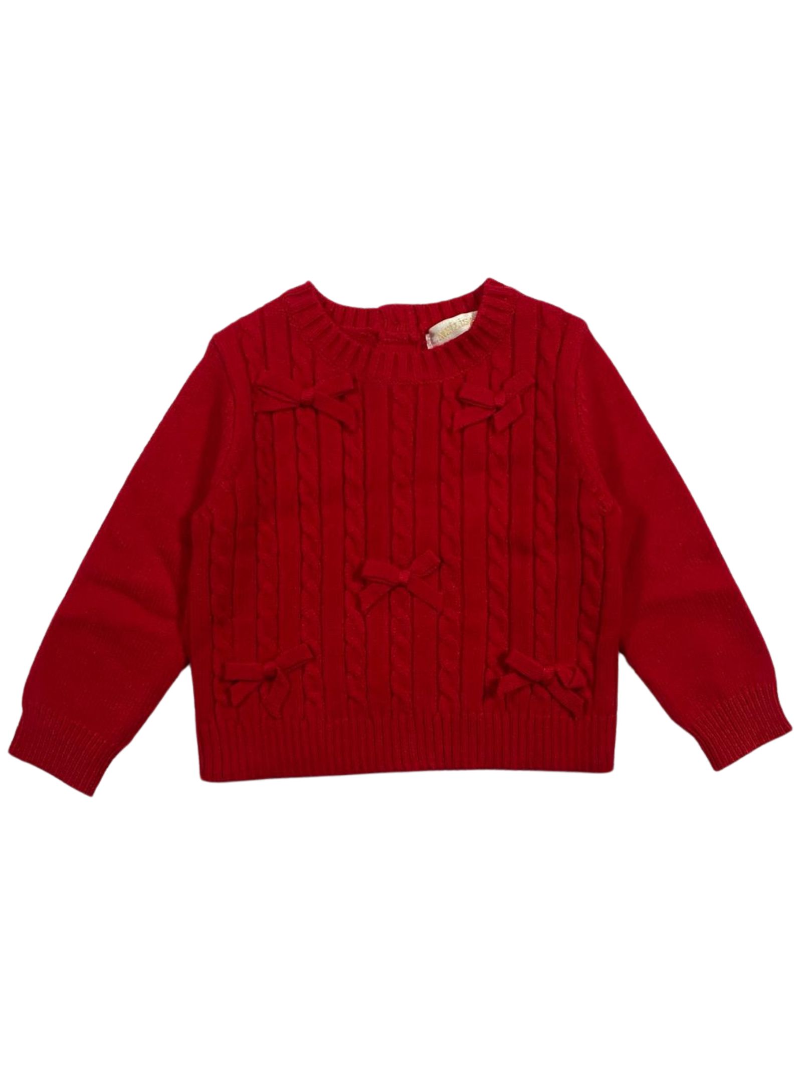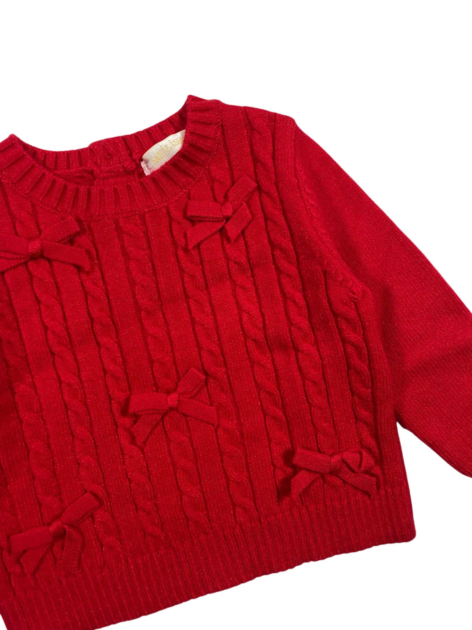 Meilisa Bai Kids maglione realizzato a maglia di colore rosso, design manica lunga, girocollo, parte superiore a coste intrecciate, applicazione fiocchetti, apertura con bottoni sul retro, vestibilità regolare. Composizione: 50% viscosa 28% poliestere 22% nylon. Made in Italy