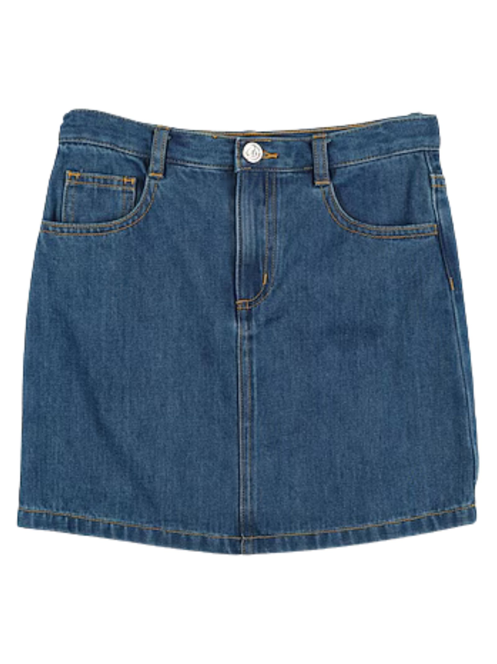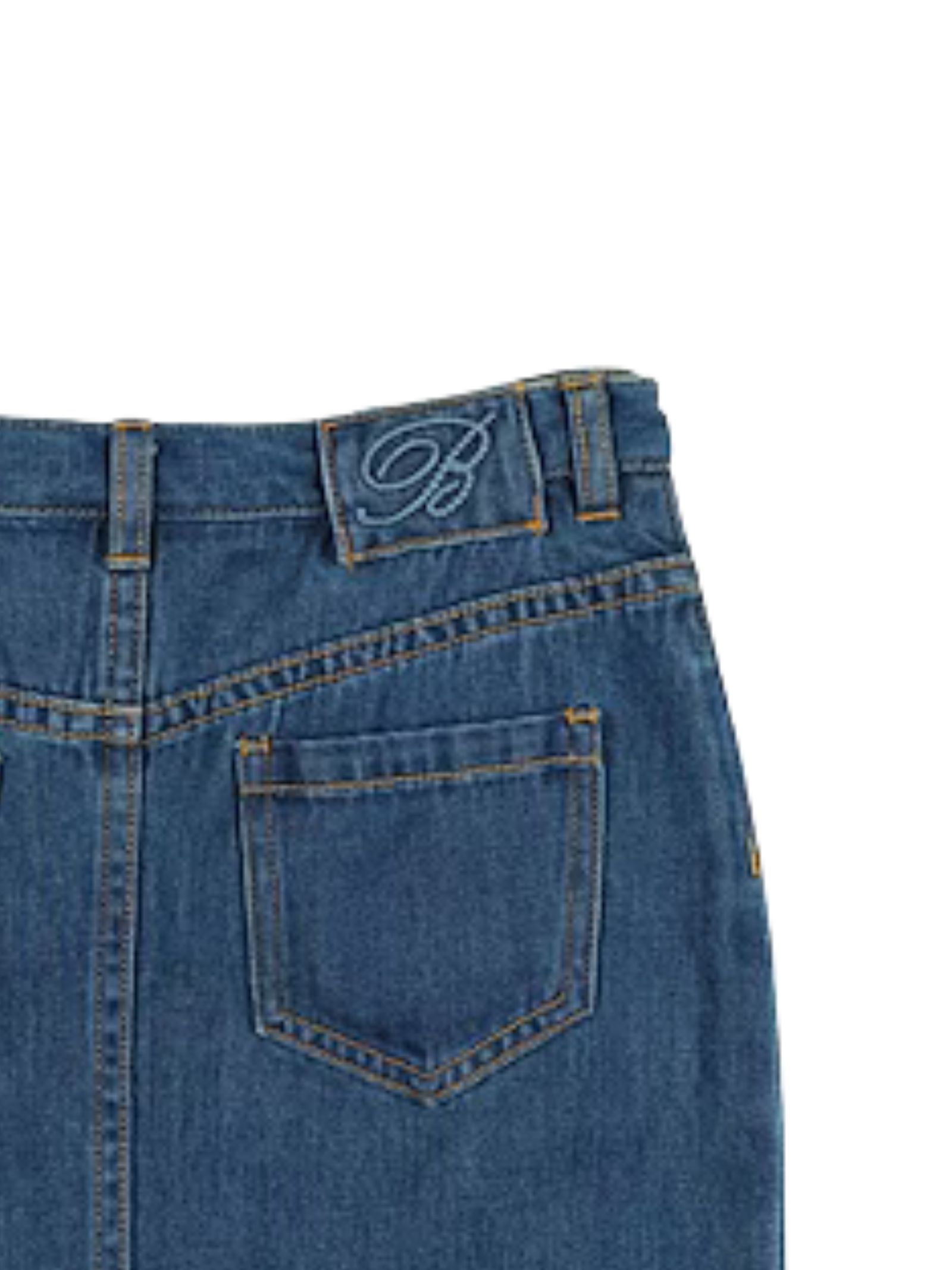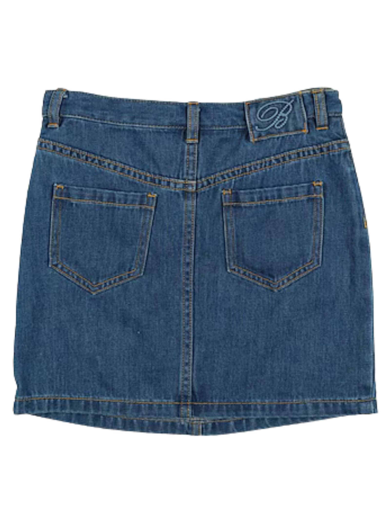Miss Blumarine Kids gonna in jeans di colore blu, chiusura con bottone e zip, design 5 tasche, ricamo logo sul retro, taglio dritto, vestibilità regolare. Composizione: 100% cotone. Made in Italy