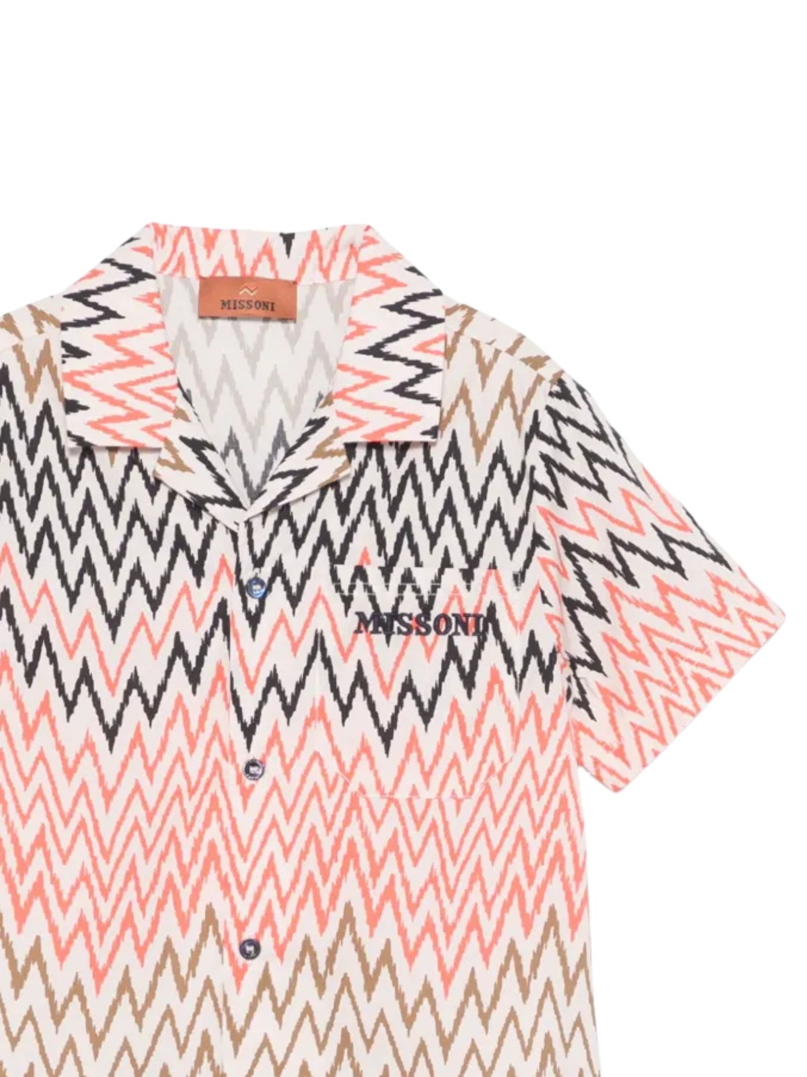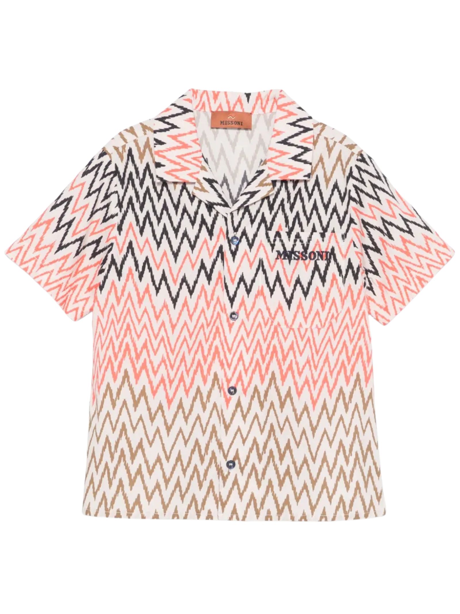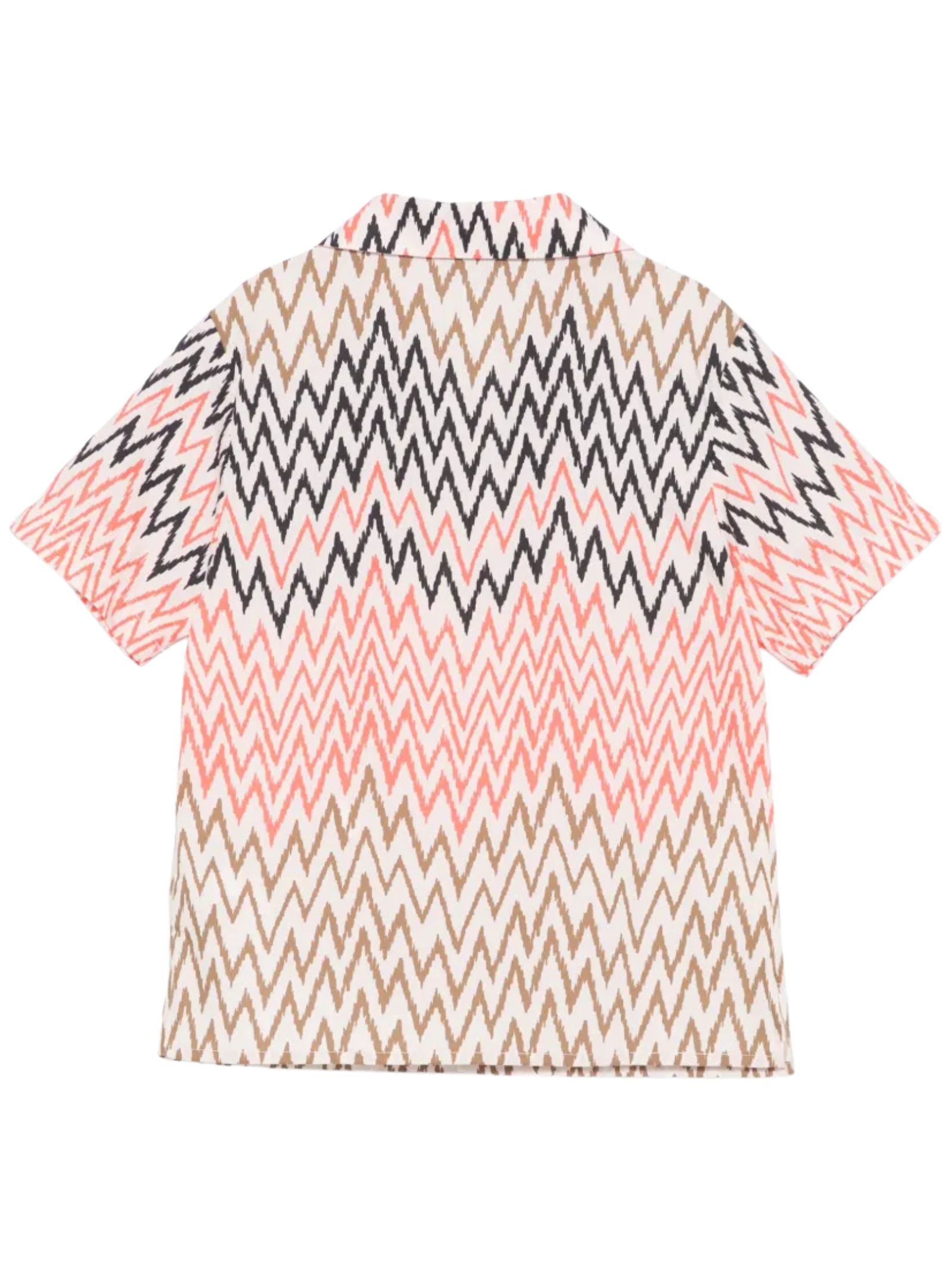 Missoni Kids camicia in fantasia zigzag multicolor, colletto revers, mezza manica, una tasca sul petto, ricamo logo a contrasto, vestibilità regolare. Composizione: 100% cotone. Made in Italy
