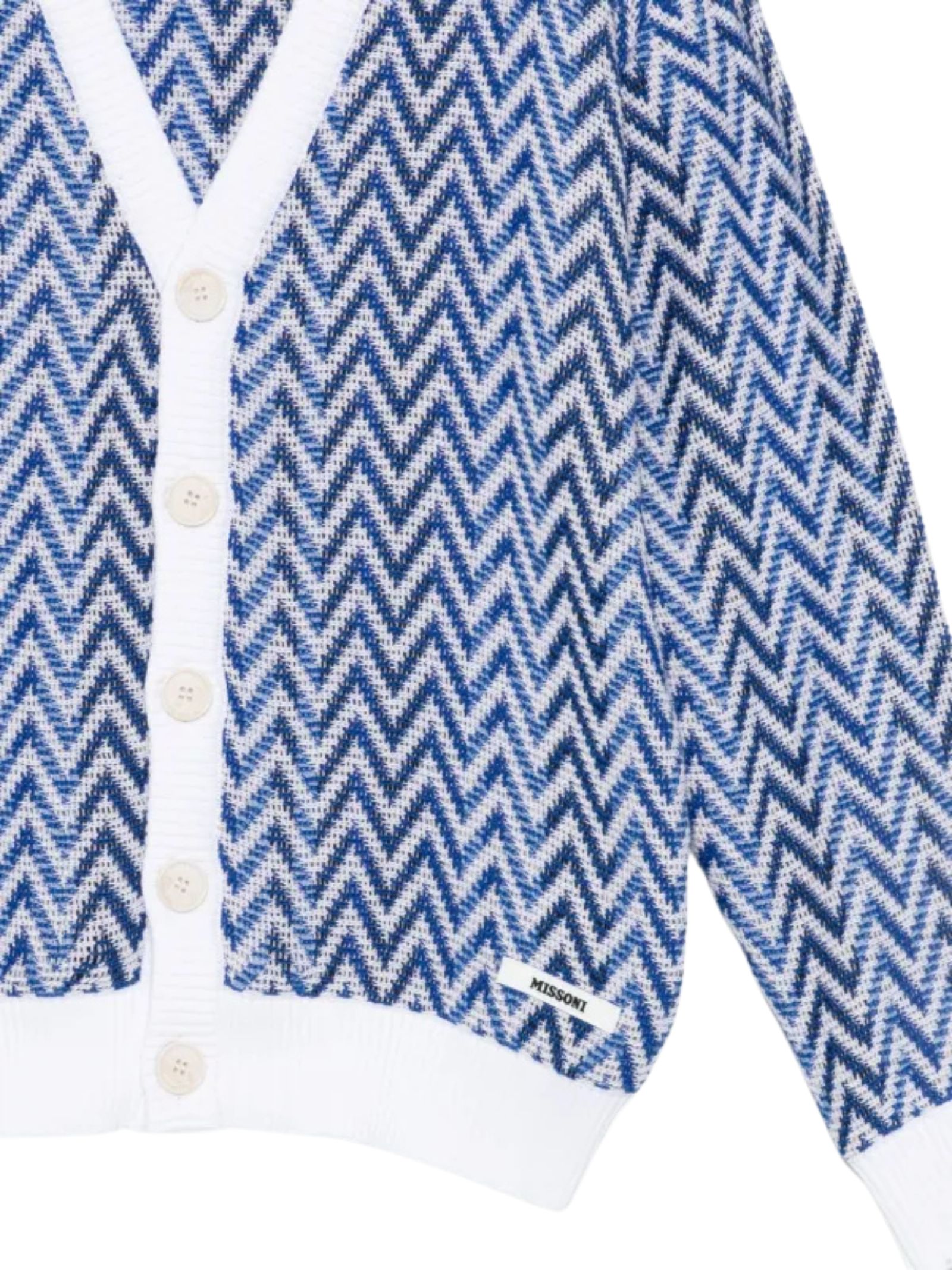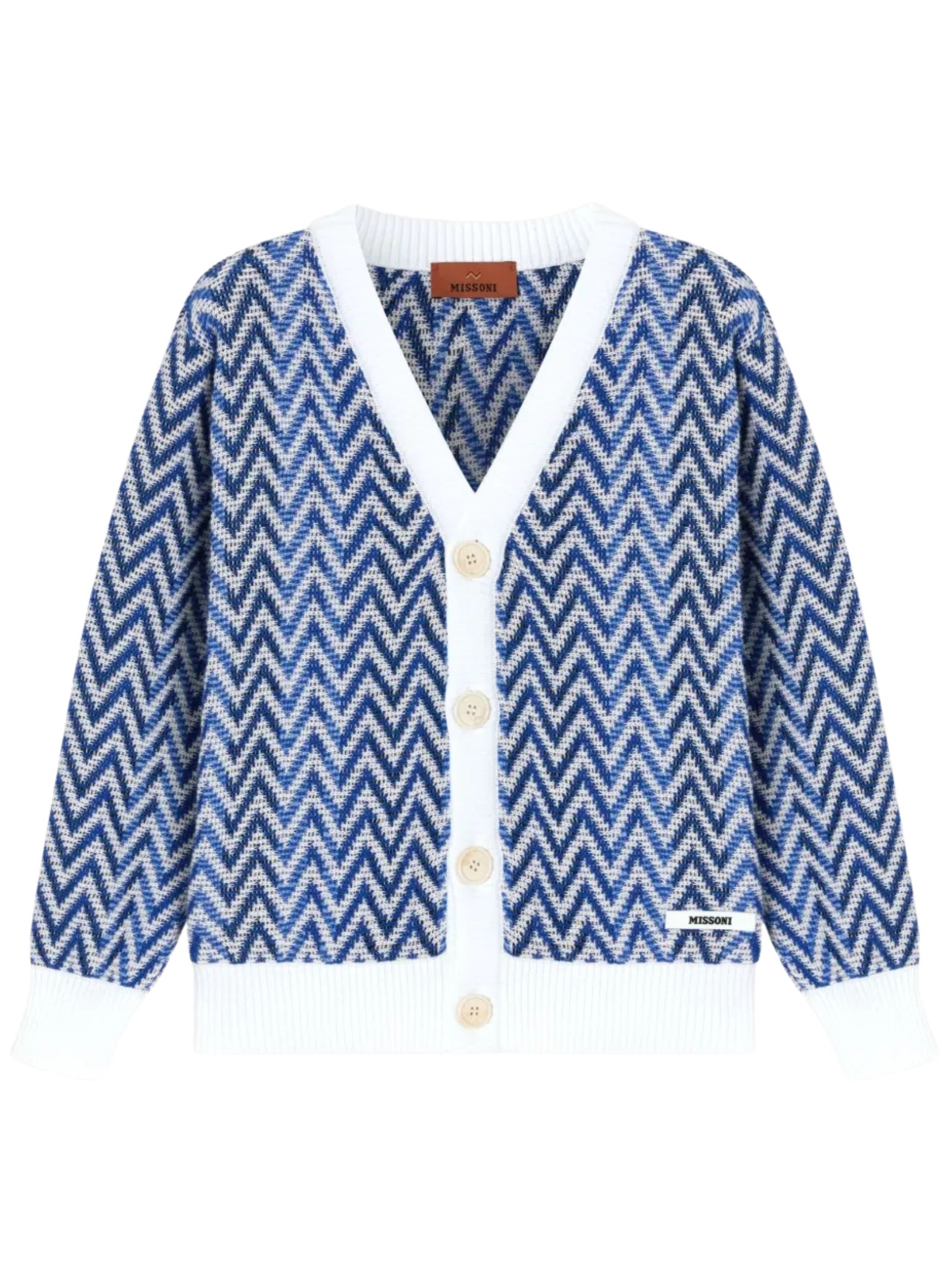 Missoni Kids cardigan in fantasia zig zag di colore blu, modello con scollo a V, maniche lunghe, apertura con bottoni, orli a costine, vestibilità regolare. Composizione: 100% Cotone. Made in Italy