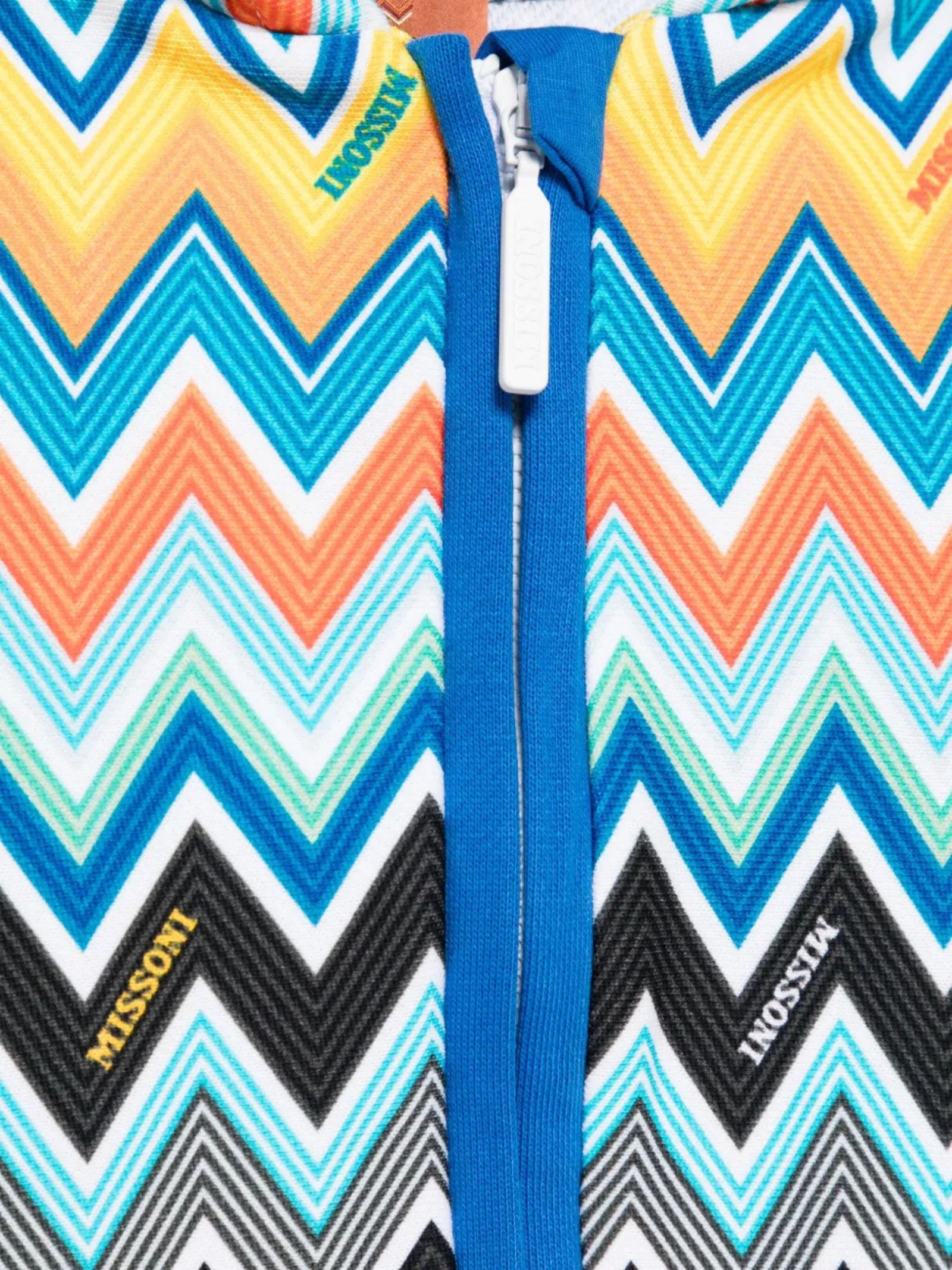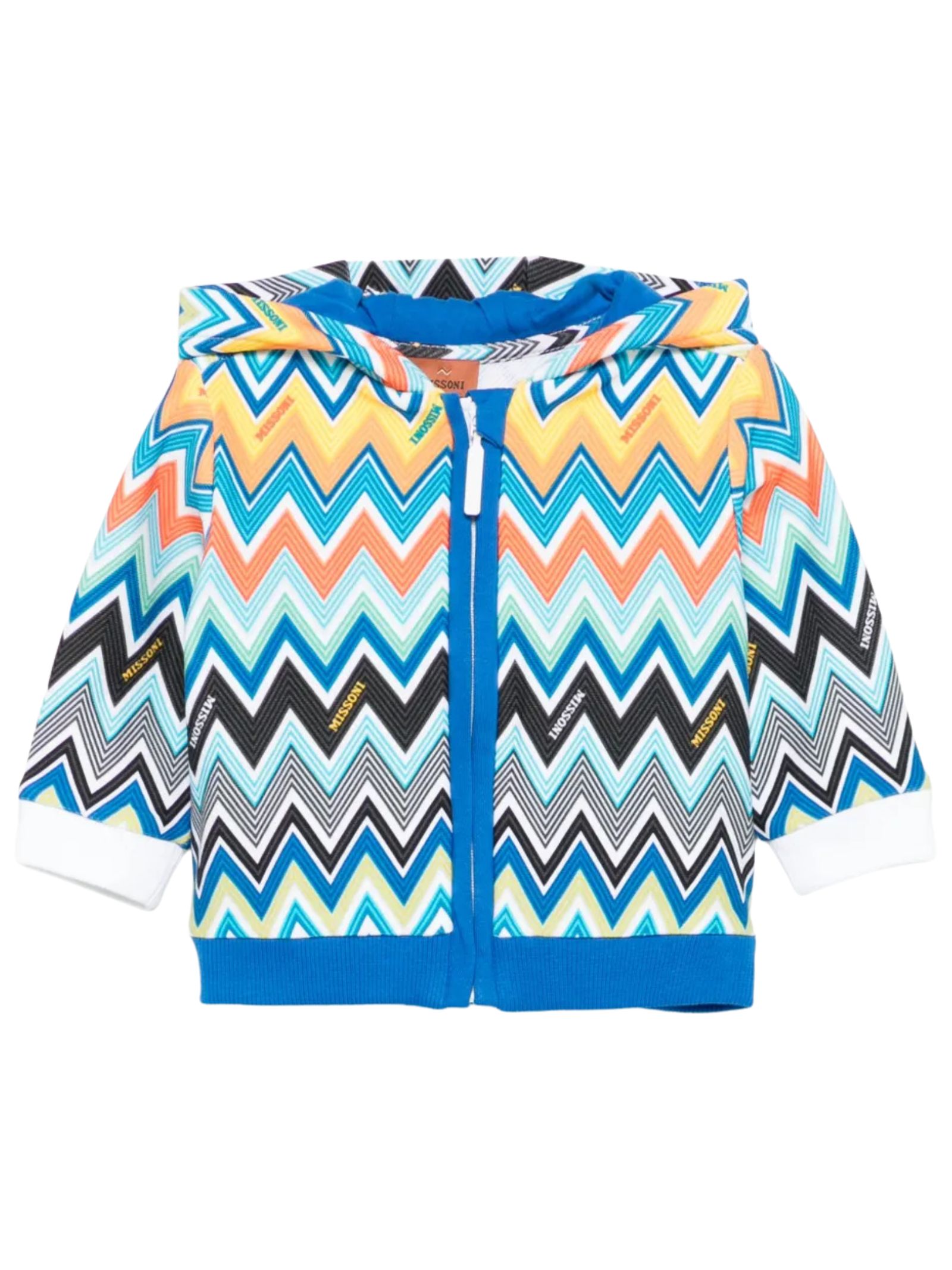 Missoni Kids felpa di colore blu in fantasia zigzag multicolor su tutta la superficie, modello con cappuccio, manica lunga, orli a coste. Composizione: 100% cotone