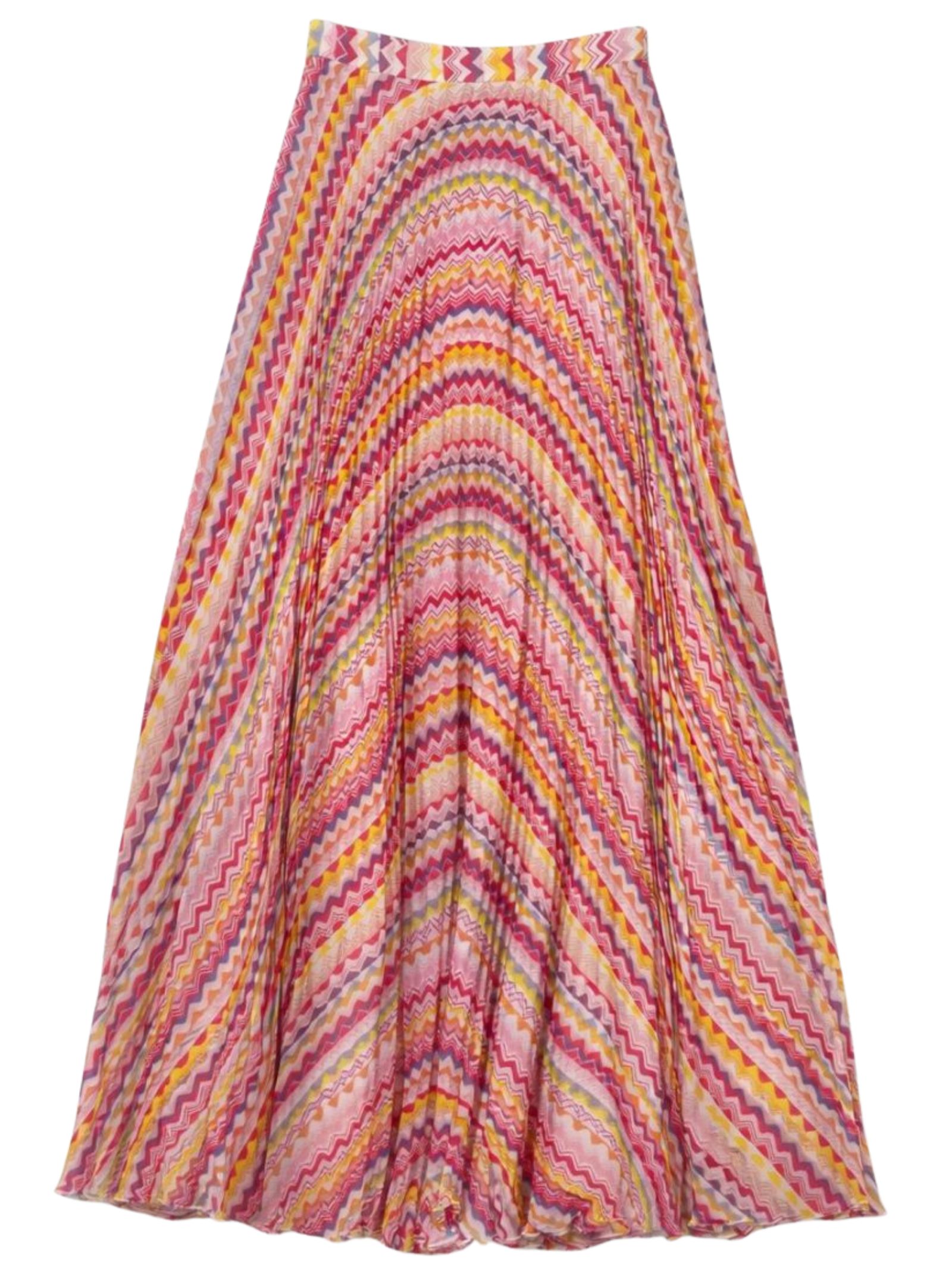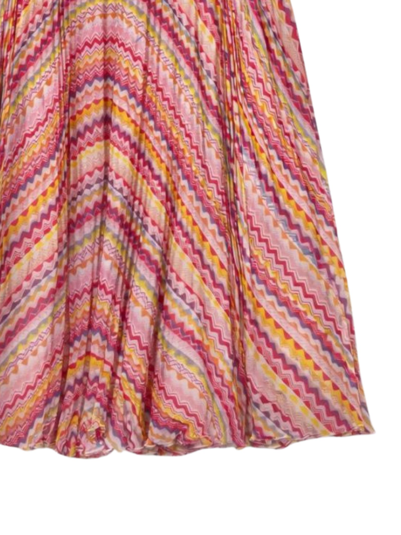 Missoni Kids gonna in fantasia multicolor, vita regolare, plissettata, design lungo, zip laterale, vestibilità regolare. Composizione: 100% poliestere. Fodera: 100% cotone. Made in Italy