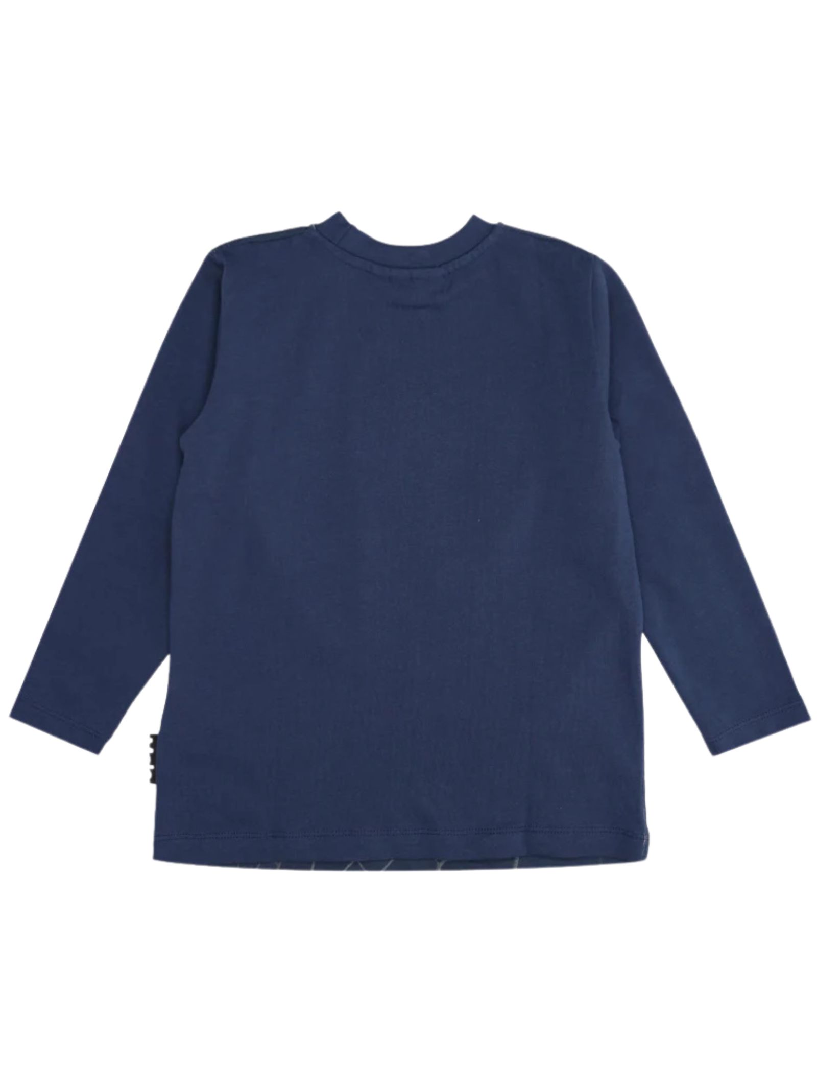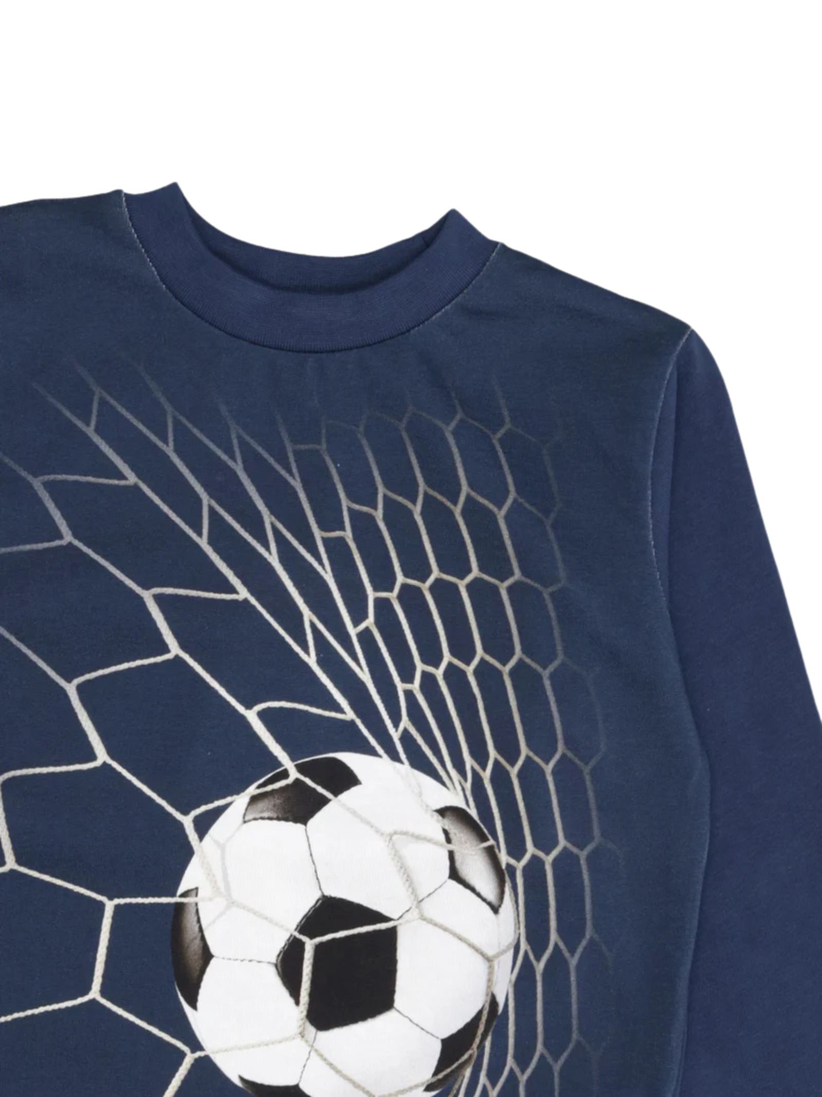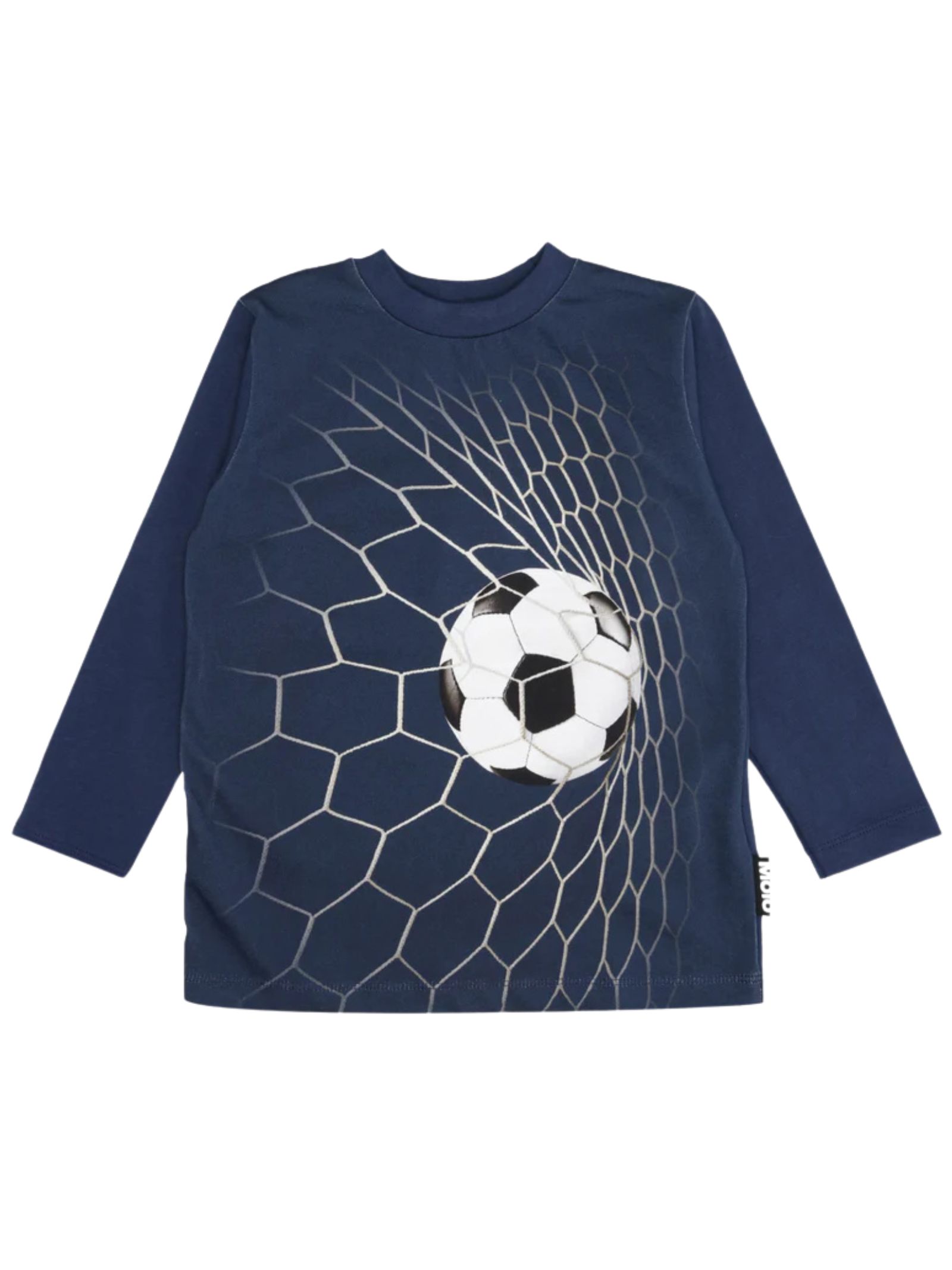 Molo Kids t-shirt Reif di colore blu, realizzata in cotone, girocollo, con maniche lunghe, stampa frontale in motivo ispirato al calcio, orlo dritto. Composizione: 100% cotone