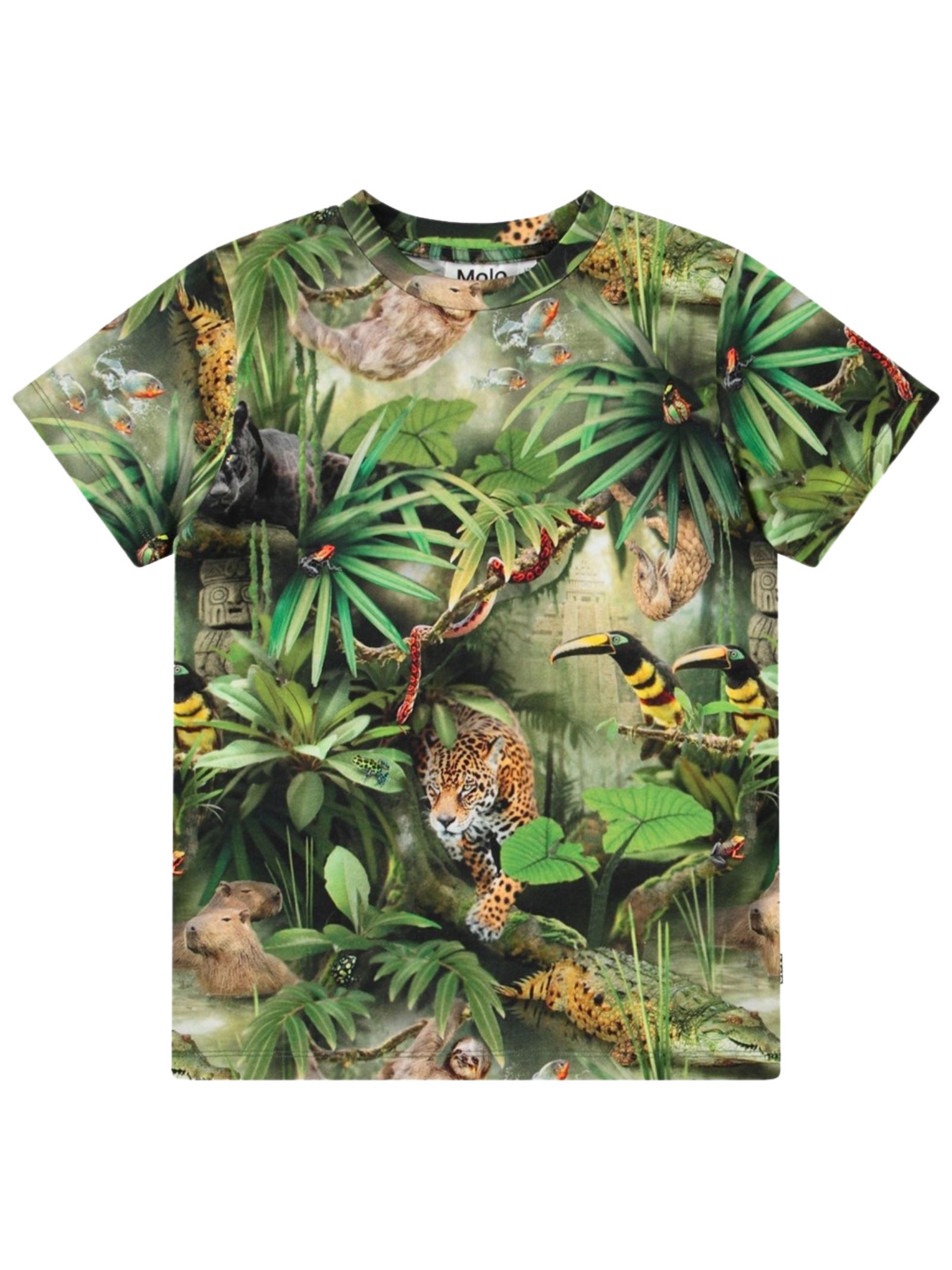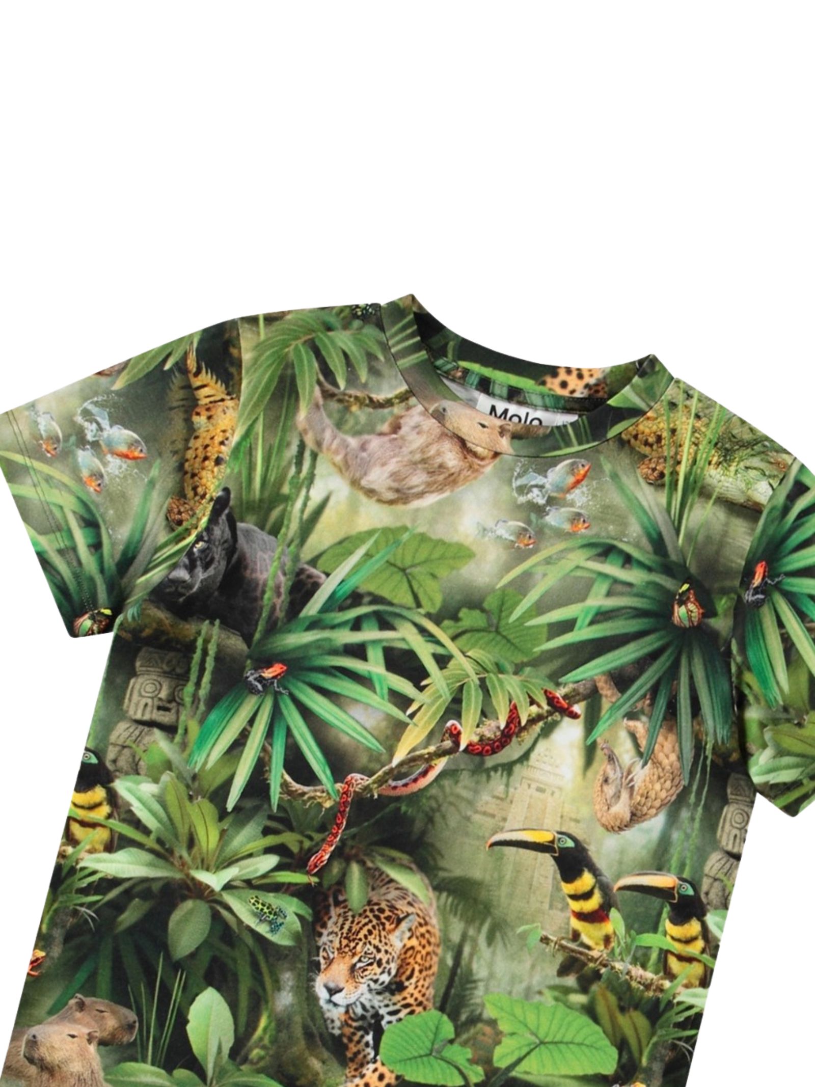 Molo Kids t-shirt di colore verde, stampa fantasia multicolor su tutta la superficie, modello girocollo, mezza manica, vestibilità regolare. Composizione: 100% cotone