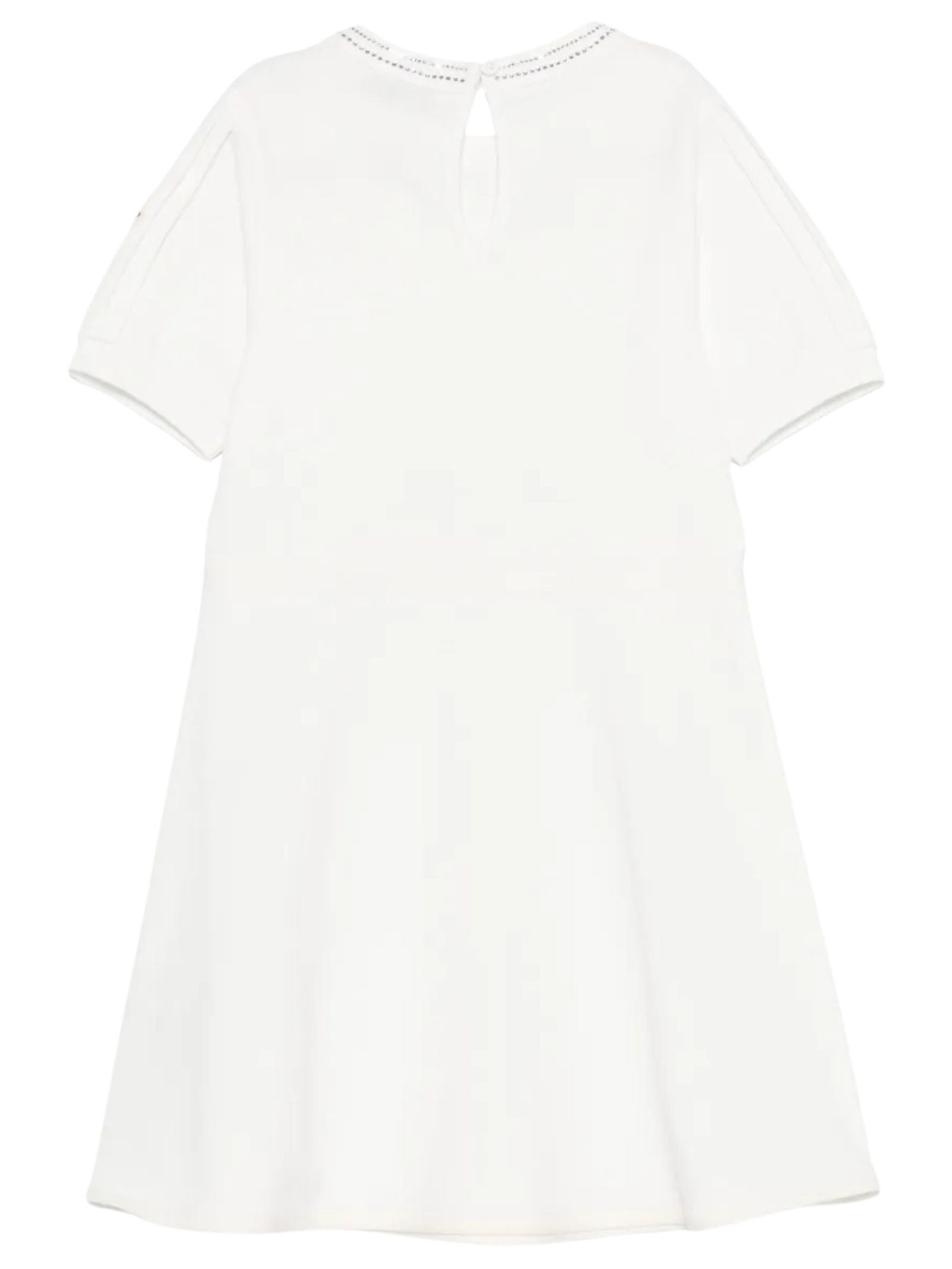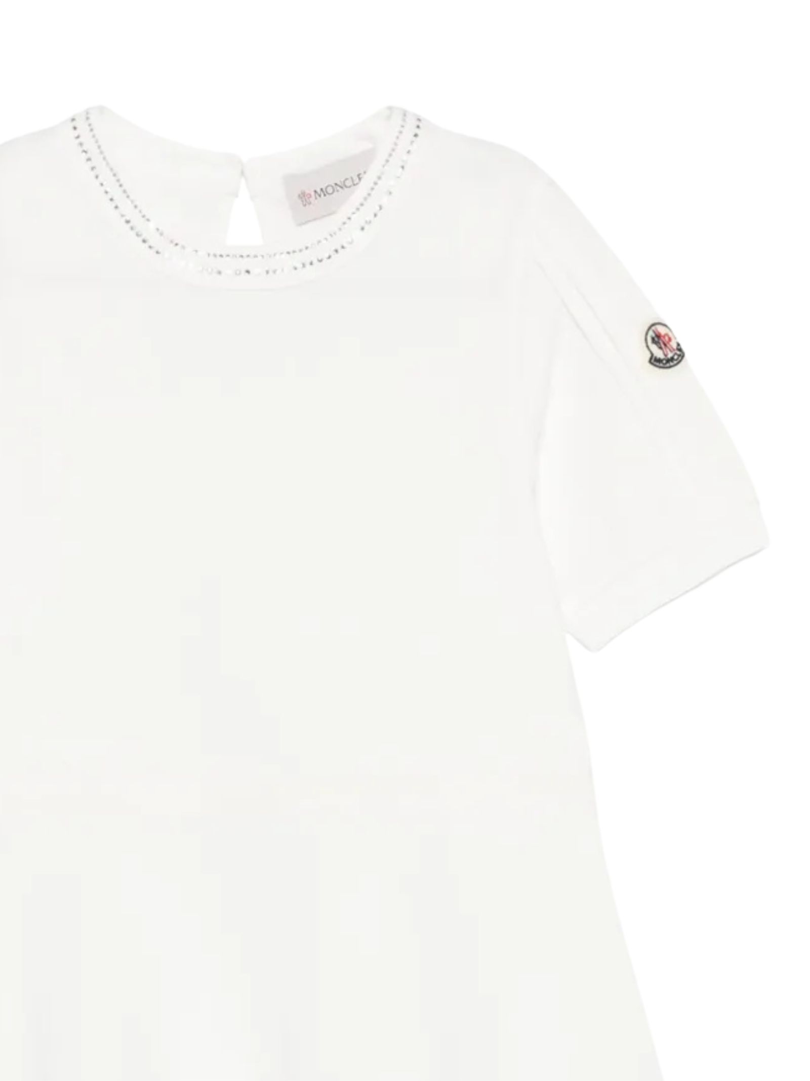 Moncler Kids abito di colore bianco, trama jersey, modello girocollo con applicazione strass, mezza manica, patch con logo sul braccio, design svasato. Composizione: 100% cotone