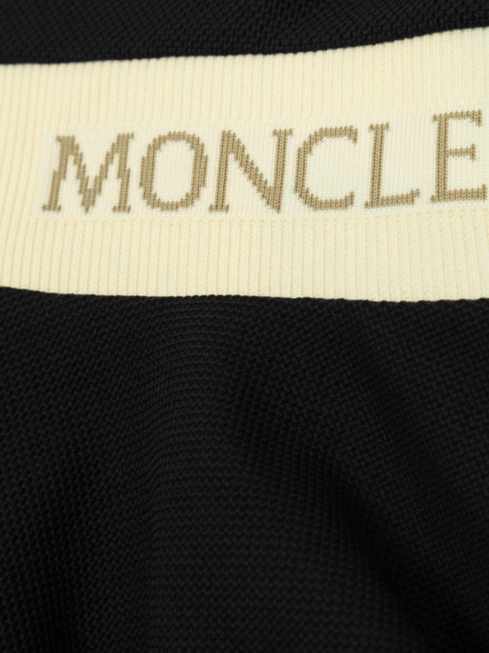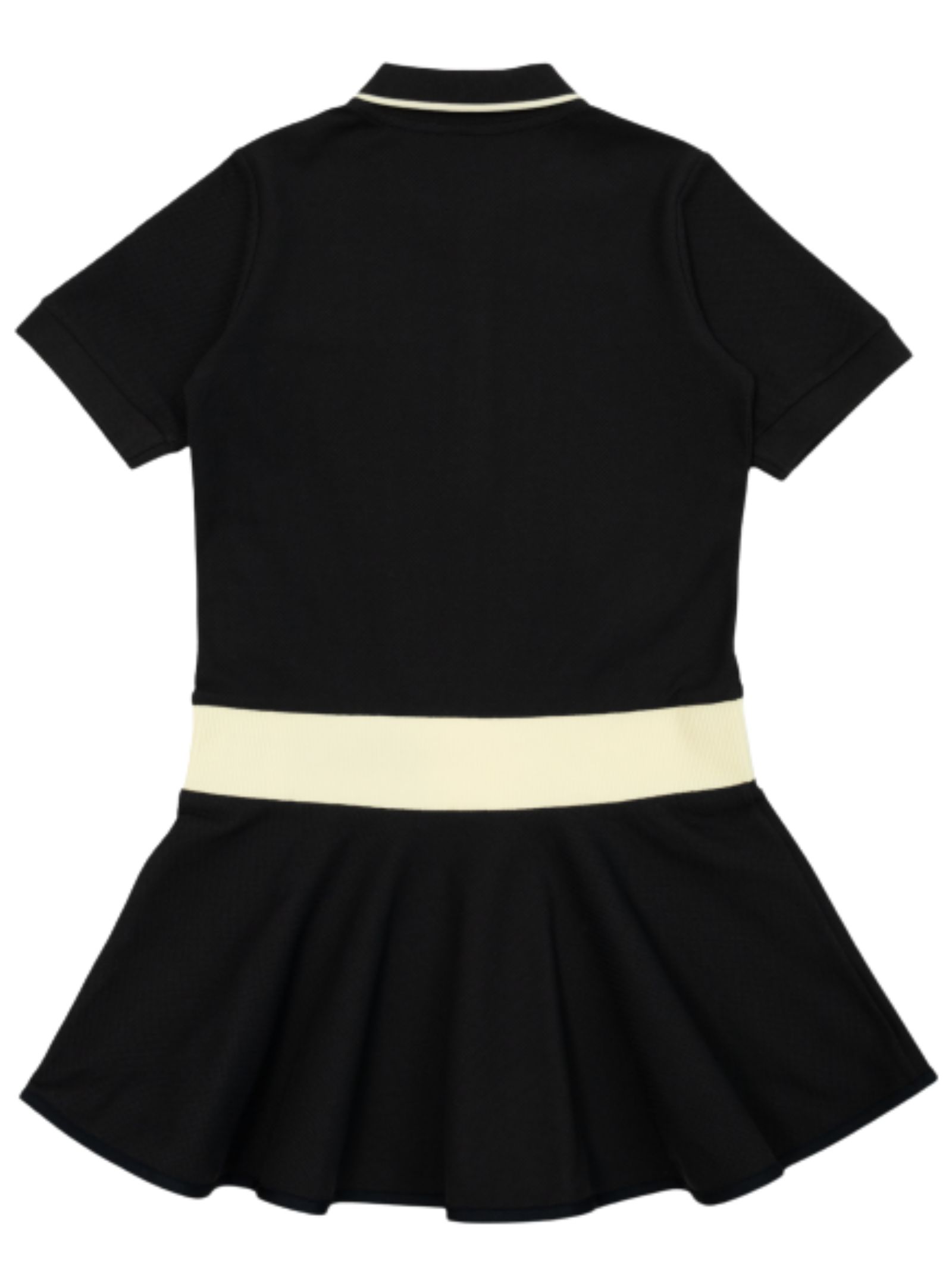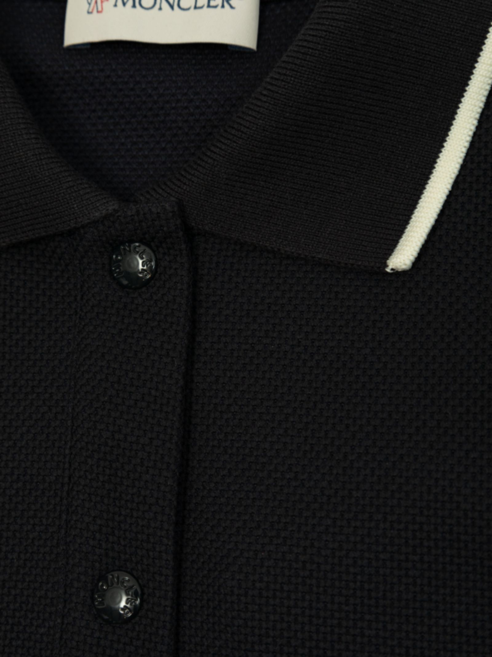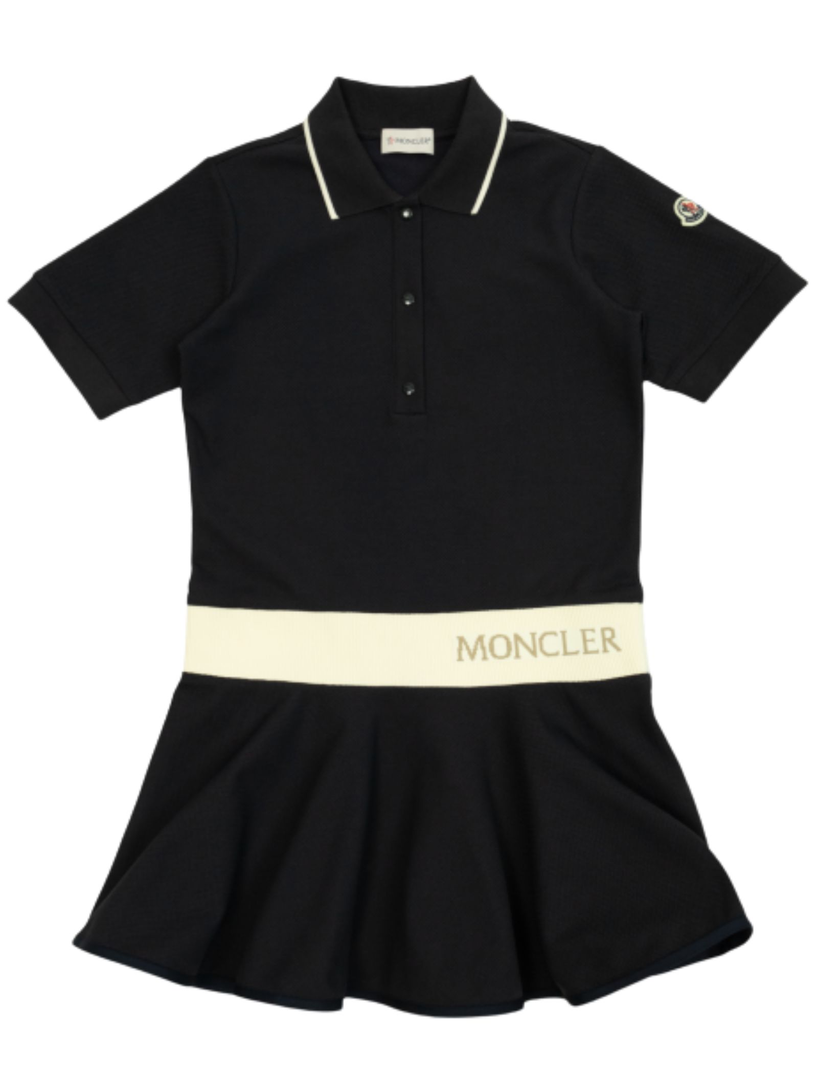 Moncler Kids abito di colore blu, dettagli a contrasto panna, trama jersey, colletto a polo, mezza manica, patch con logo sul braccio, design svasato. Composizione: 58% cotone 38% poliammide 4% elastan