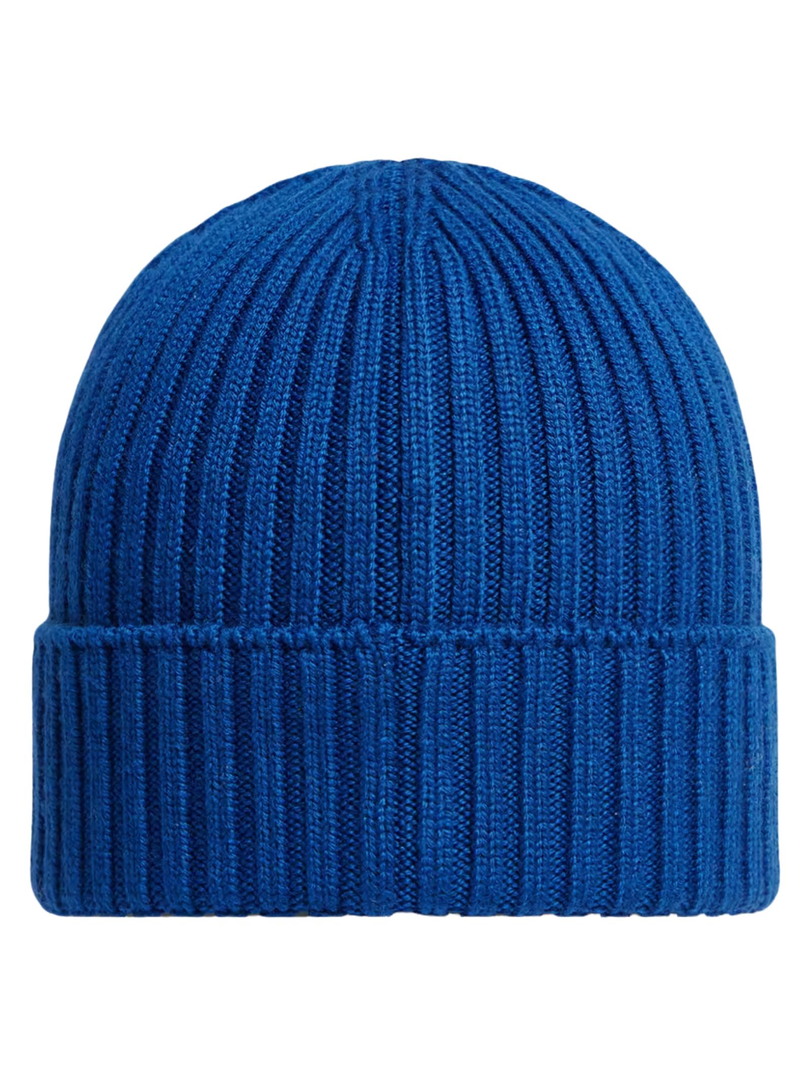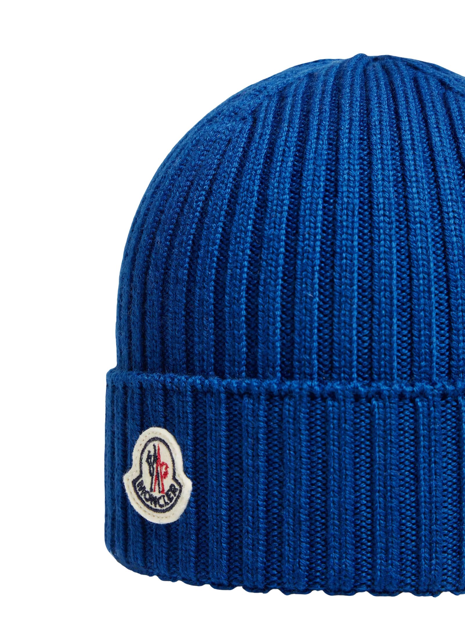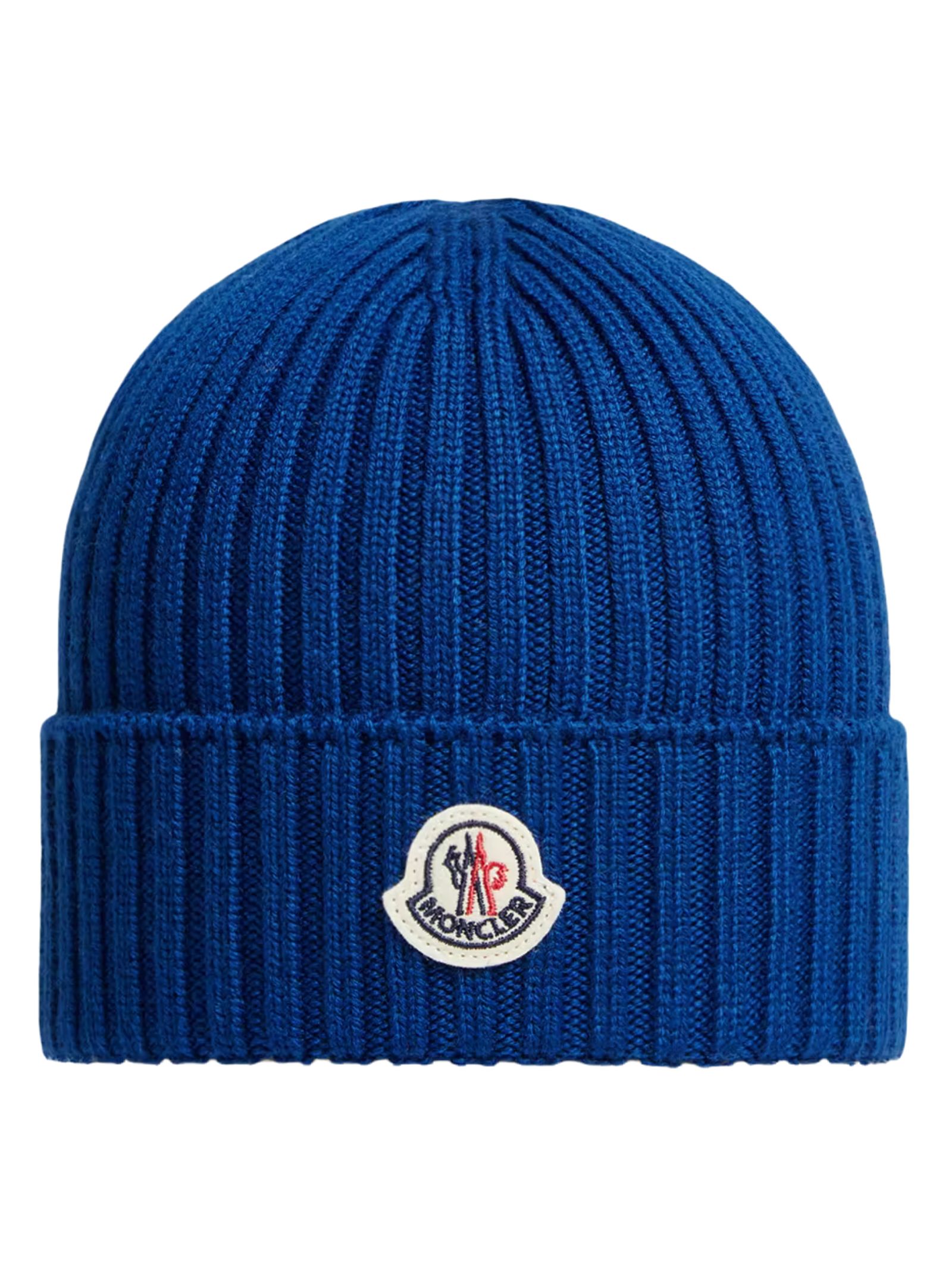 Moncler Kids cappello di colore blu elettrico, modello a cuffia realizzato in morbida lana a costine, risvolto, patch con logo applicato, design aderente. Composizione: 100% lana. Made in Italy