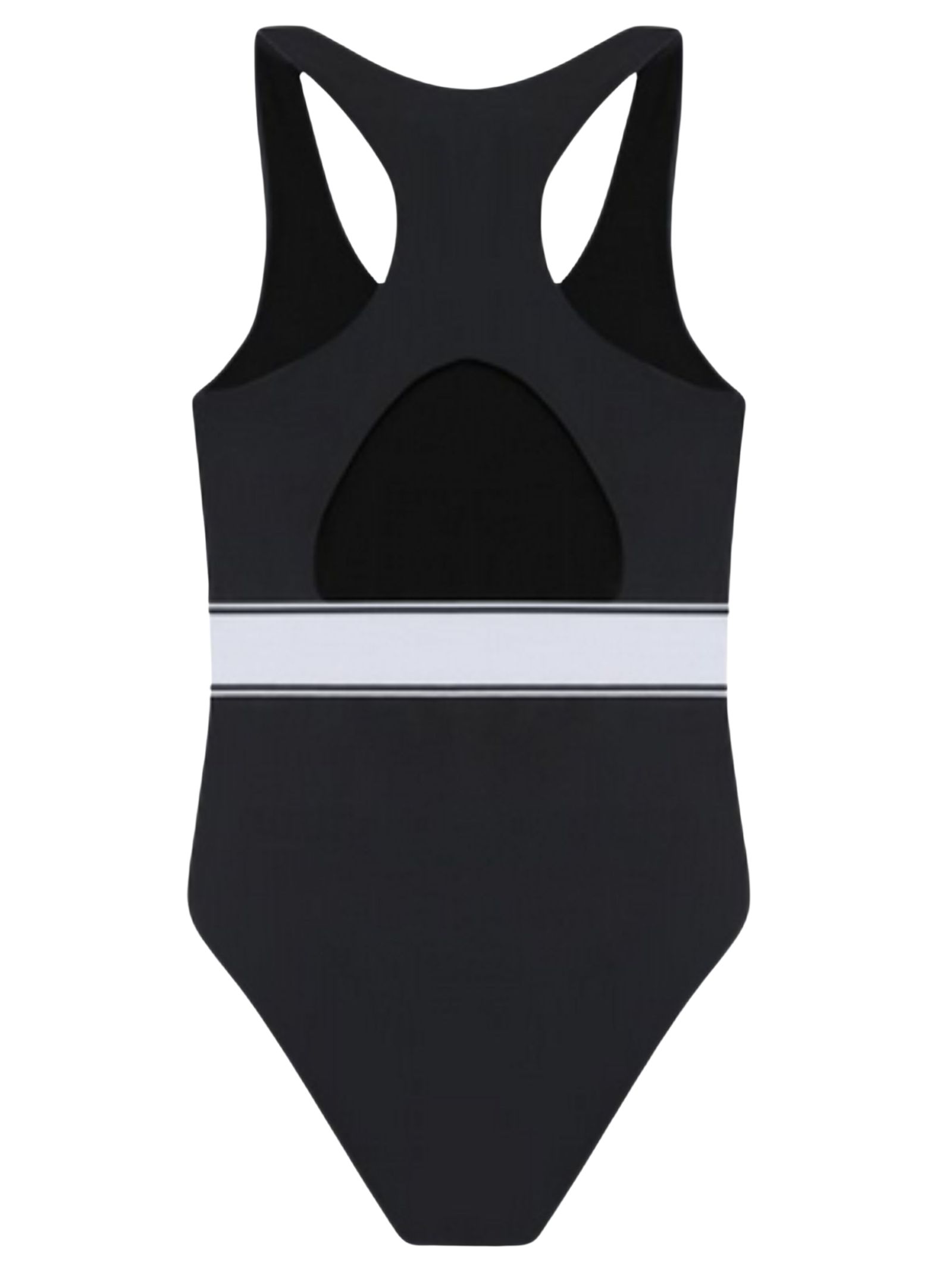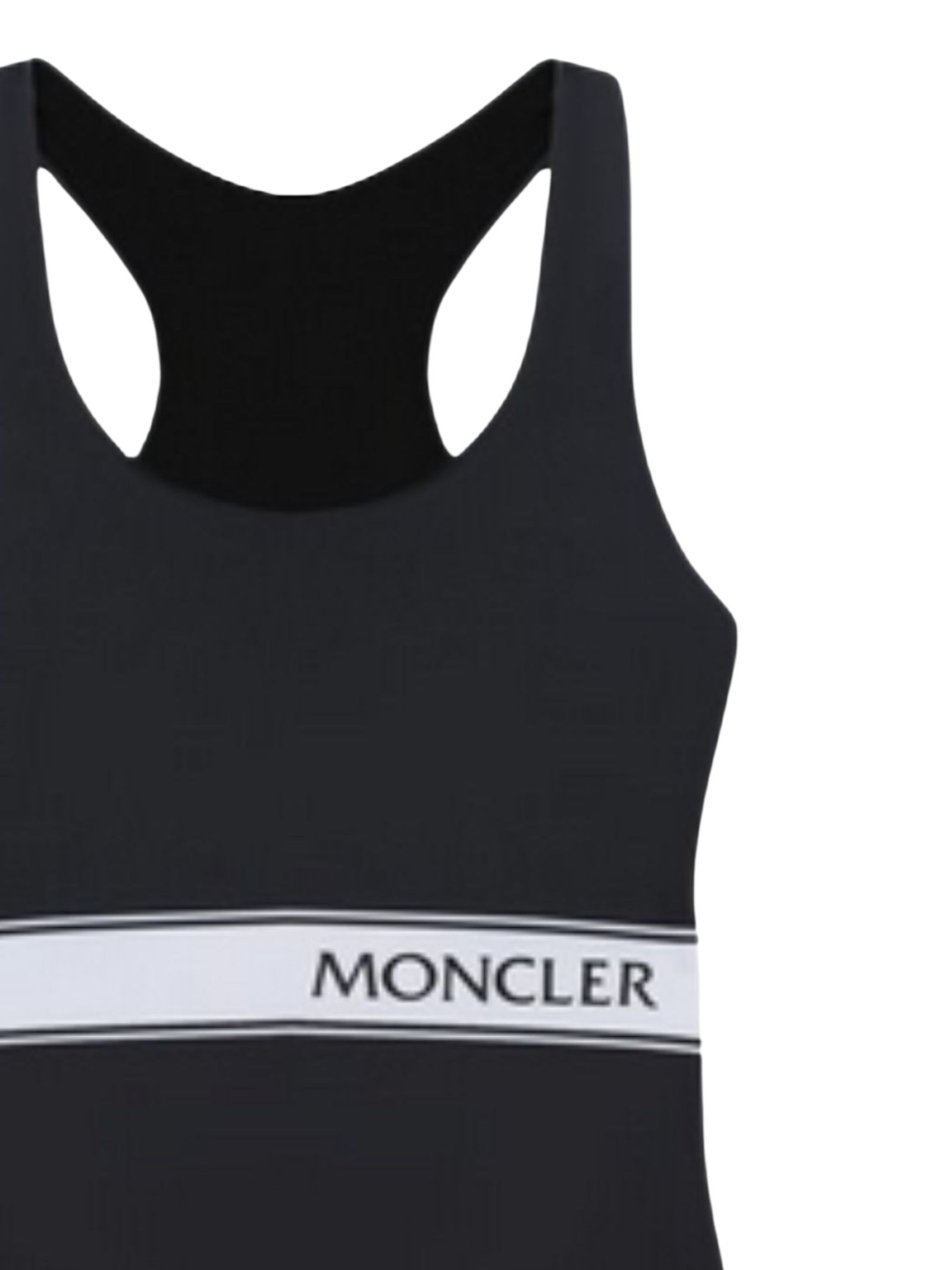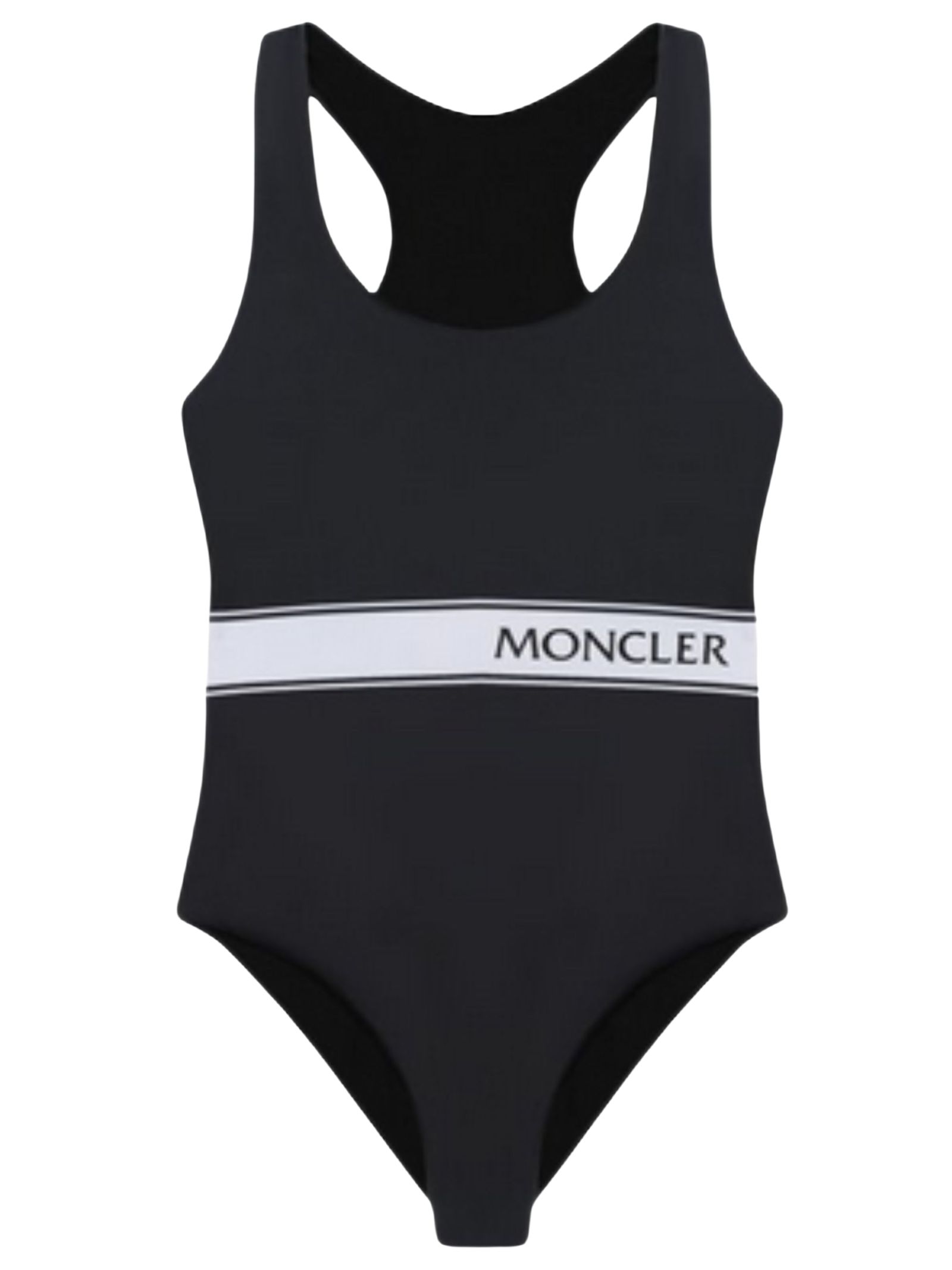 Moncler Kids costume da bagno intero di colore nero con dettagli a contrasto bianco e logo sul davanti, scollo sul retro. Composizione: 82% piliestere 12% elastan