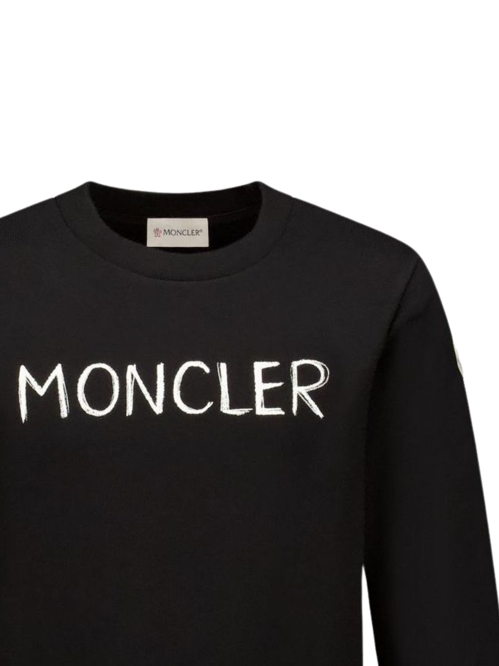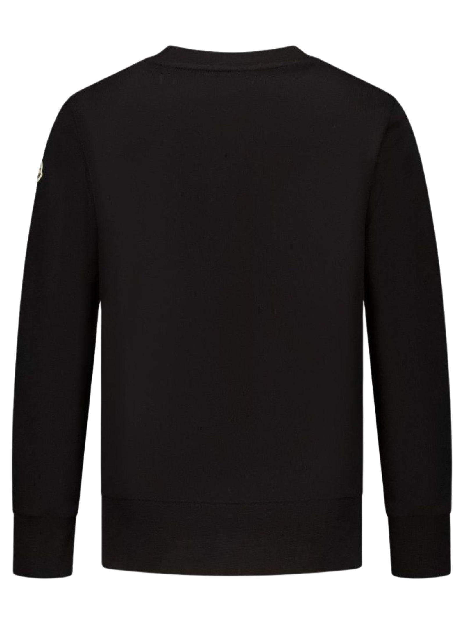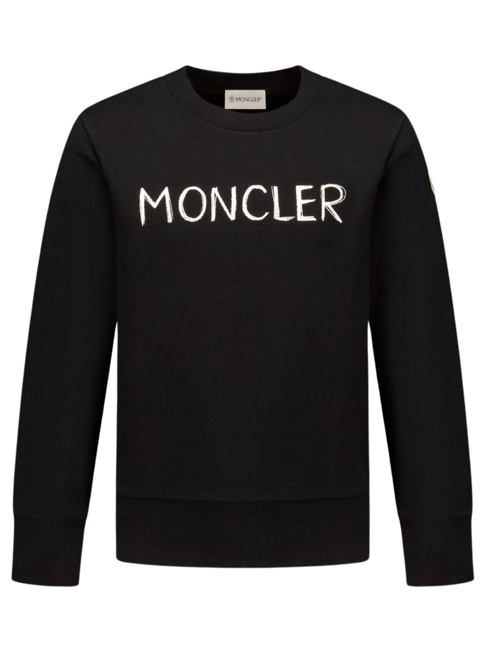Moncler Kids felpa di colore nero, modello girocollo, manica lunga, stampa logo centrale a contrasto bianco, applicazione logo in feltro sul braccio, orli a costine, vestibilità regolare. Composizione: 100% cotone