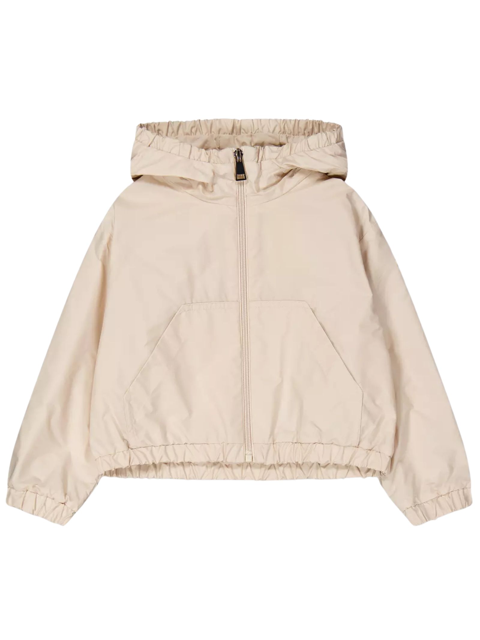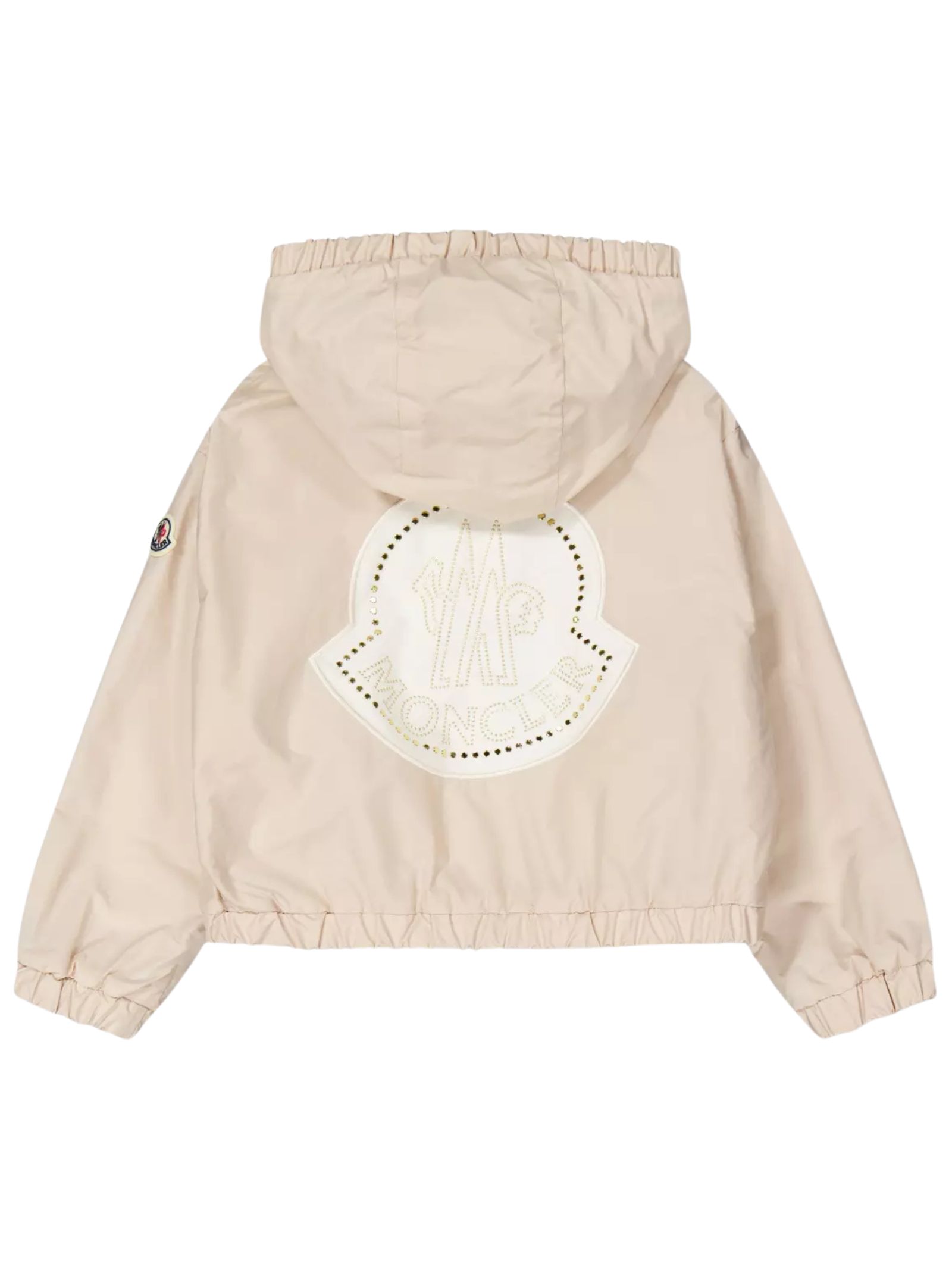 Moncler Kids giubbino Saria di colore rosa chiaro, antivento, maxi logo con borchie applicato sul retro, due tasche laterali, patch con logo sul braccio, chiusura centrale con zip, cappuccio fisso. orlo elastico. Composizione: 100% poliestere
