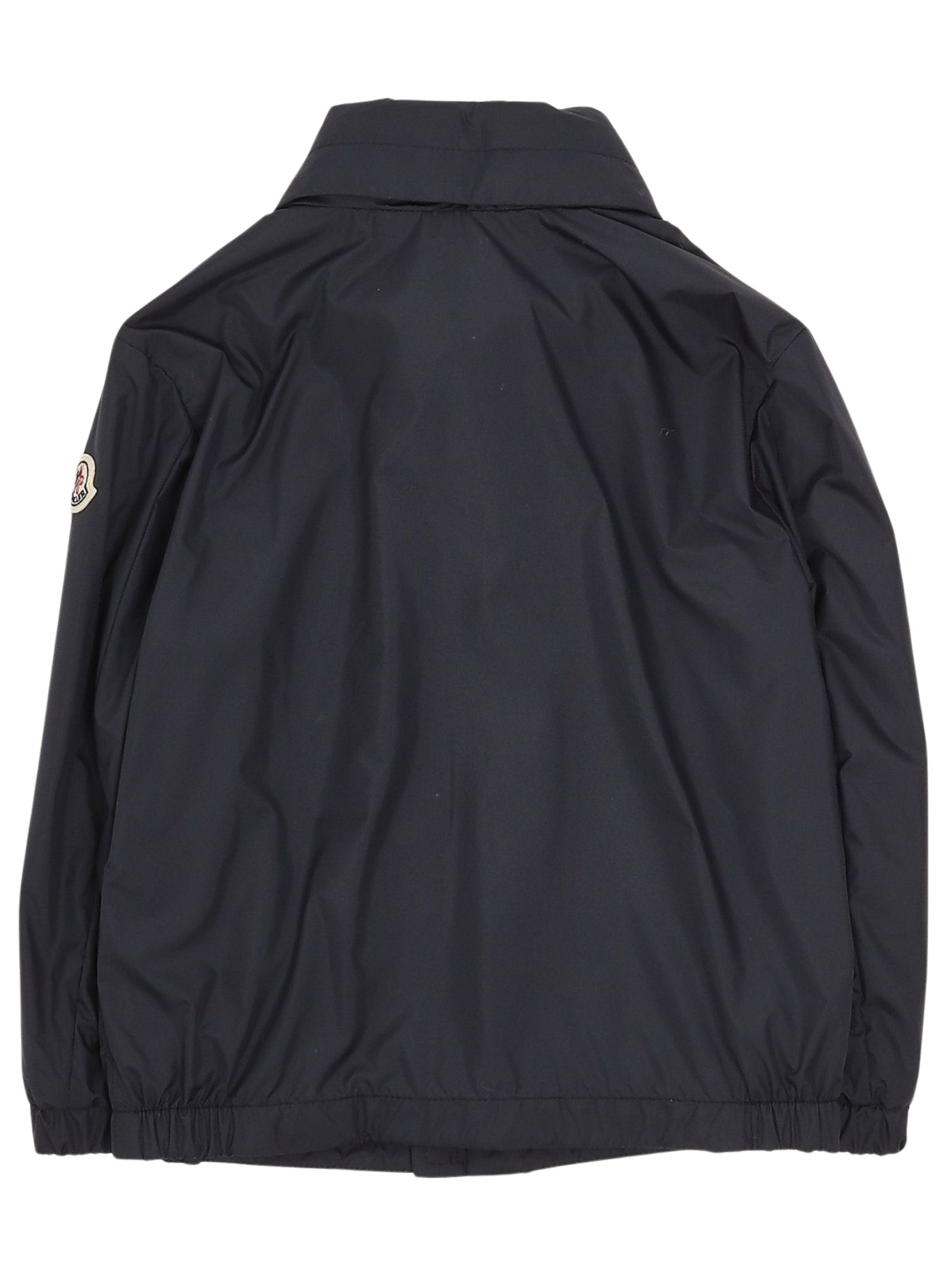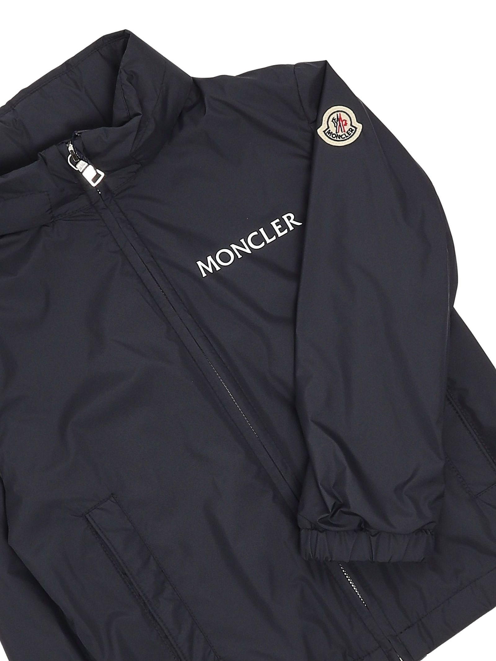 Moncler Kids giubbino Warne di colore blu, antivento, due tasche laterali, patch con logo sul braccio, chiusura centrale con zip, cappuccio fisso richiudibile, stampa logo sul petto, polsi e orlo elastico. Composizione: 100% poliestere. Fodera: 100% cotone