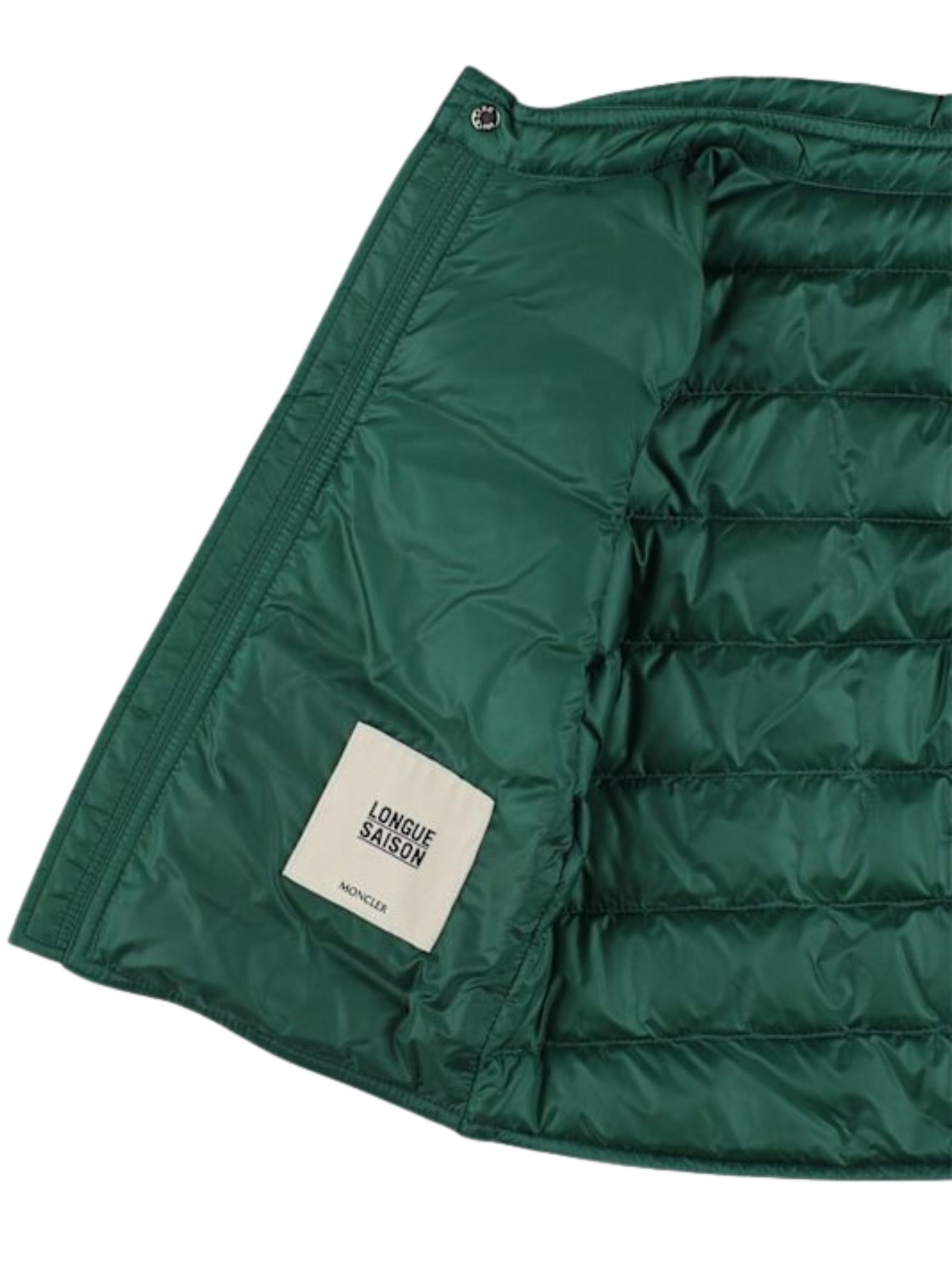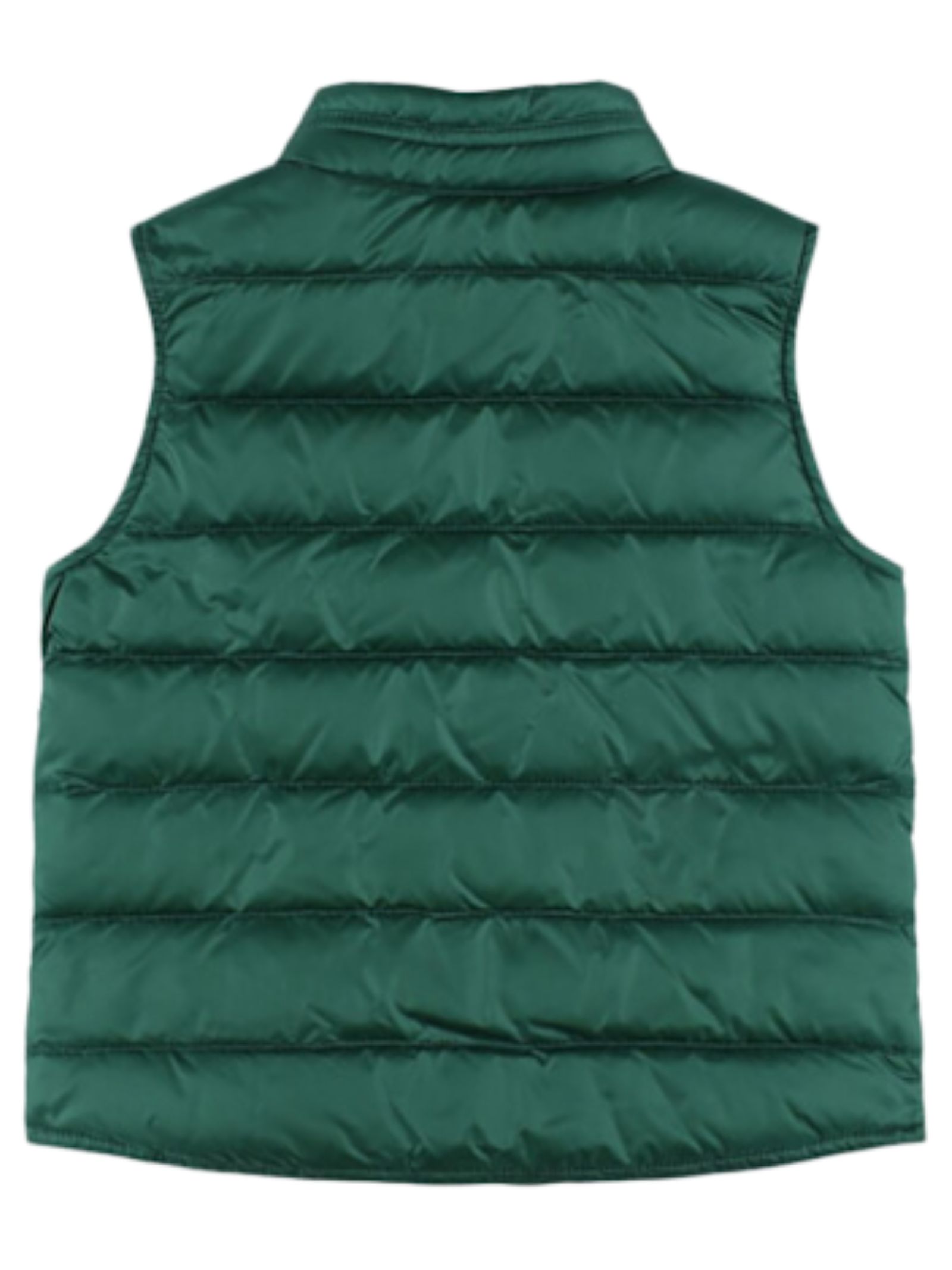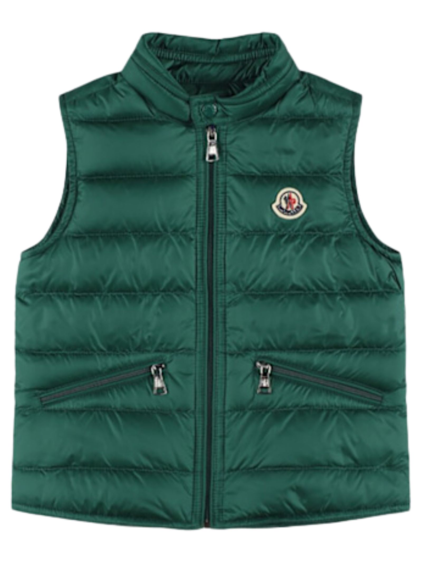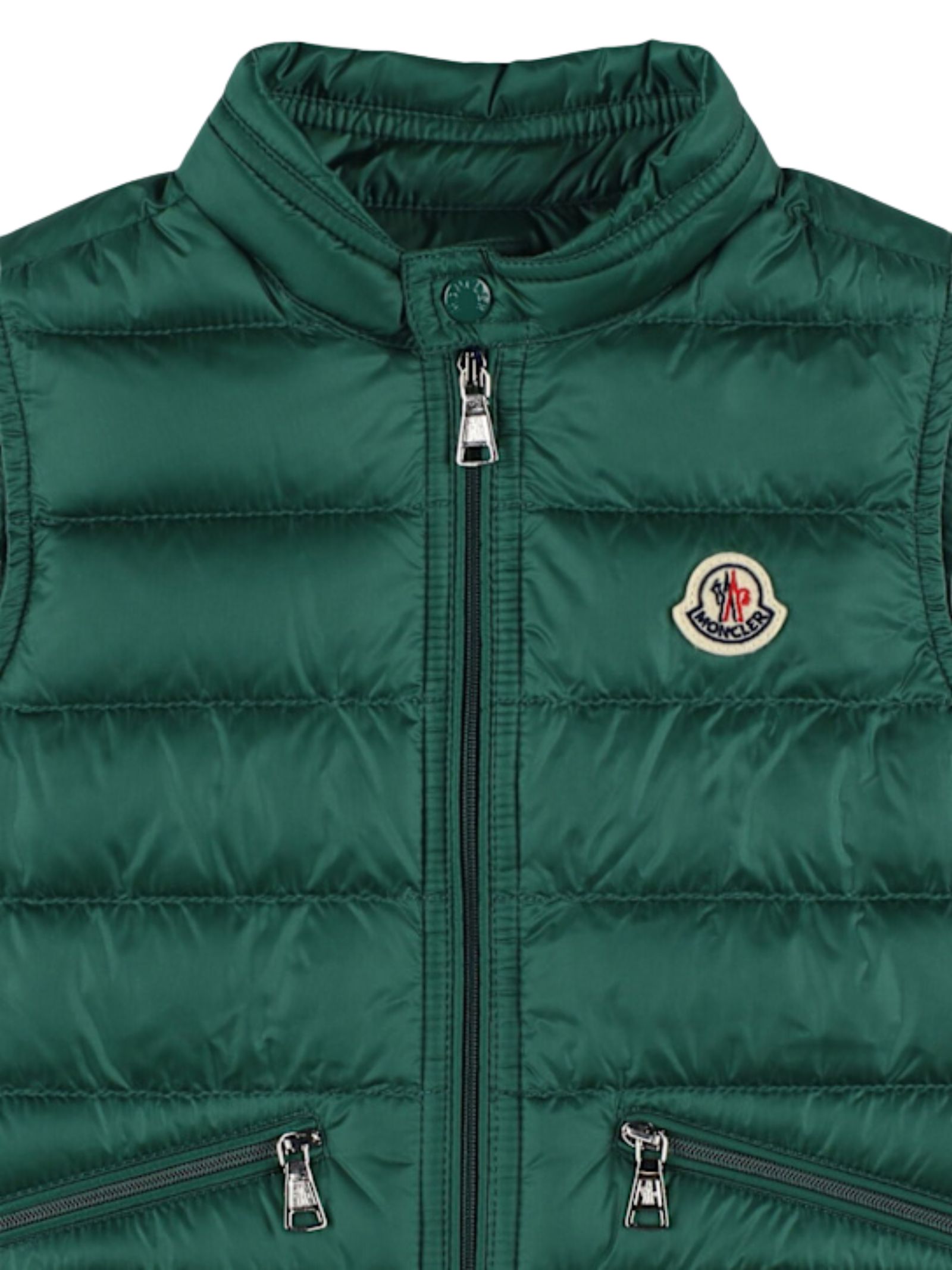 Moncler Kids GUI GILET smanicato di colore verde, realizzato in tessuto longue saison riciclato, fodera riciclata longue saison, imbottitura in piumino, ripiegabile, chiusura al collo con bottone a pressione, chiusura con zip, tasche con zip, contiene parti non tessili di origine animale. Composizione: 100% poliammide. Imbottitura: 90% piumino 10% piuma d'oca