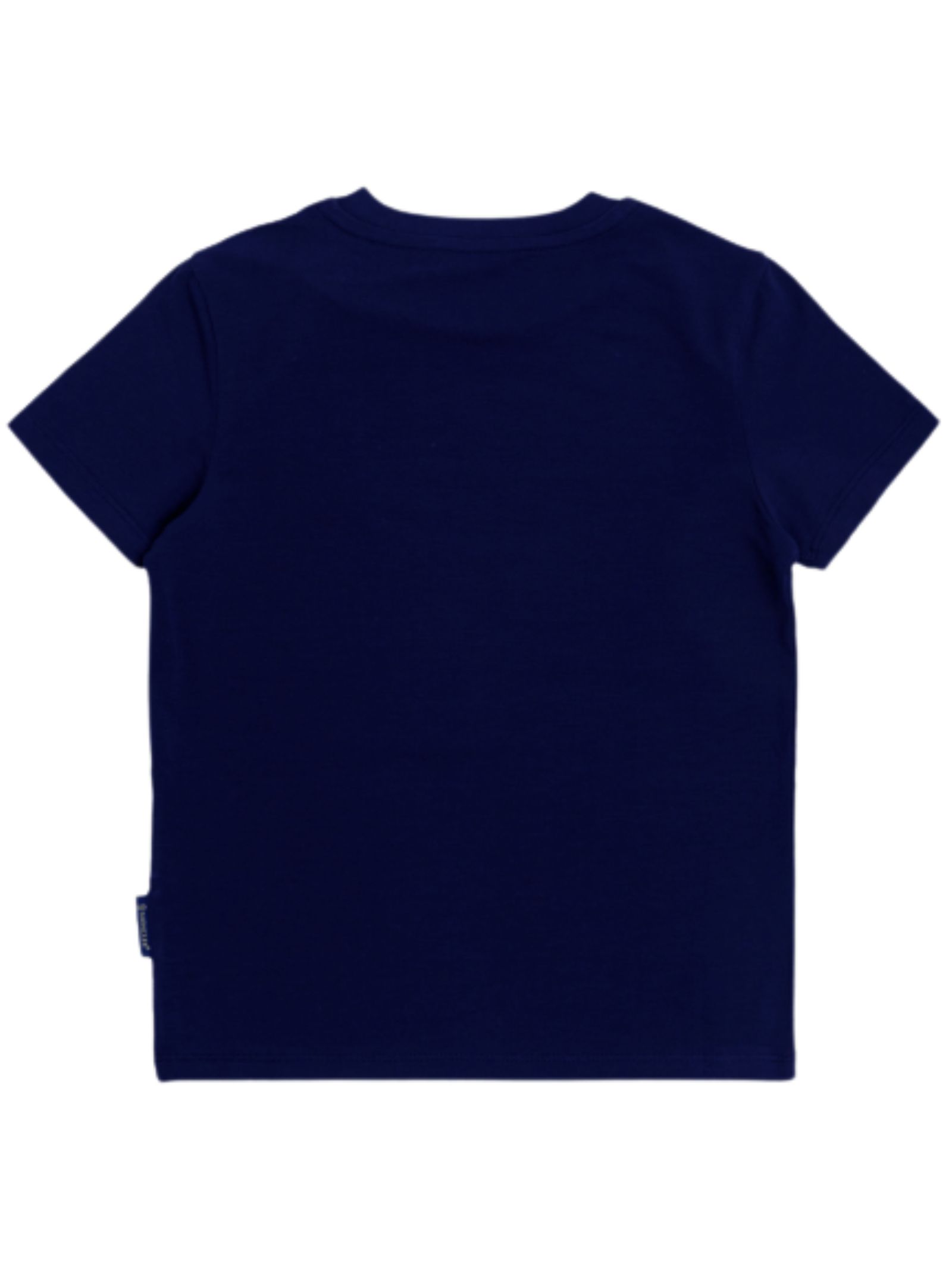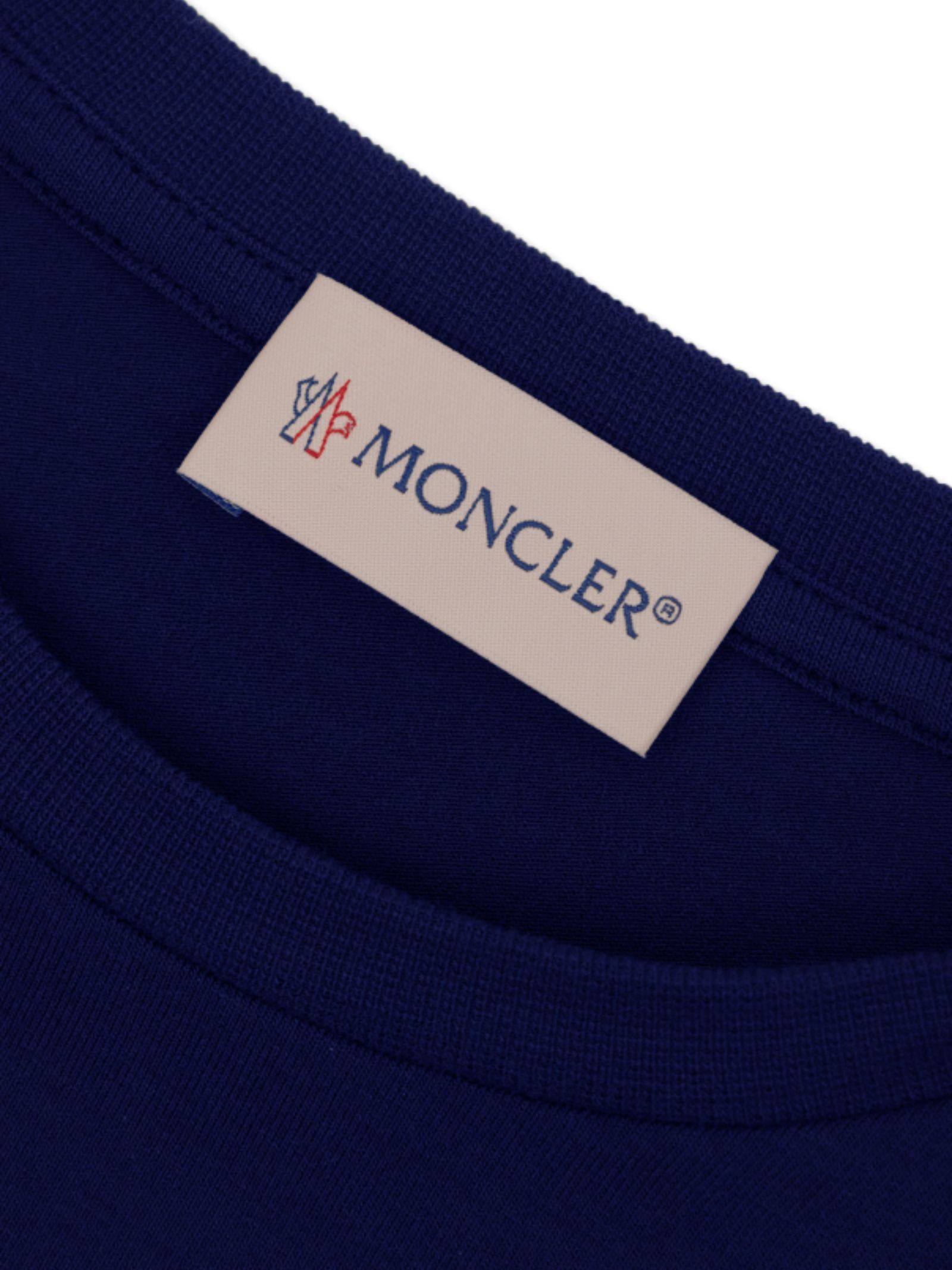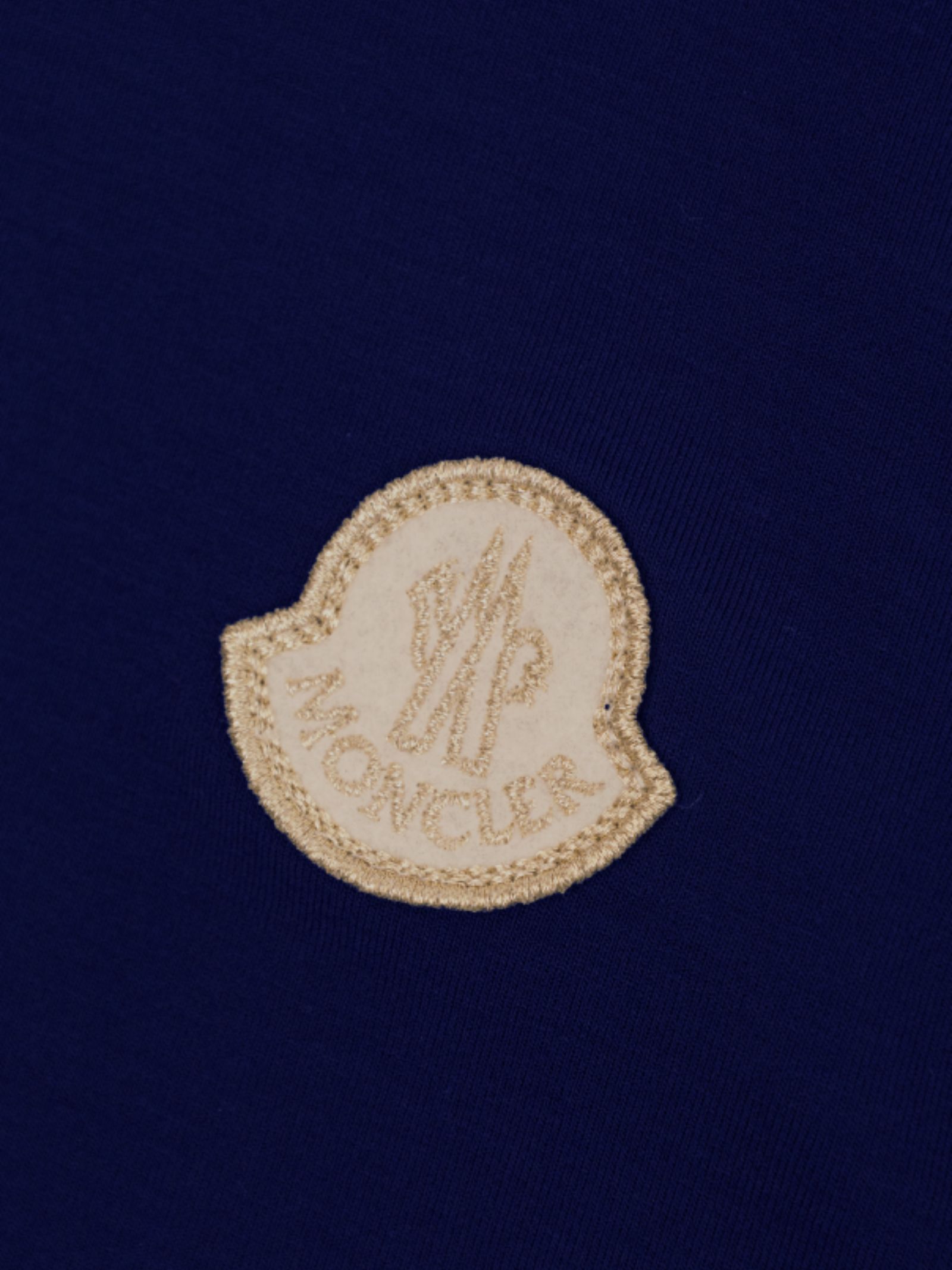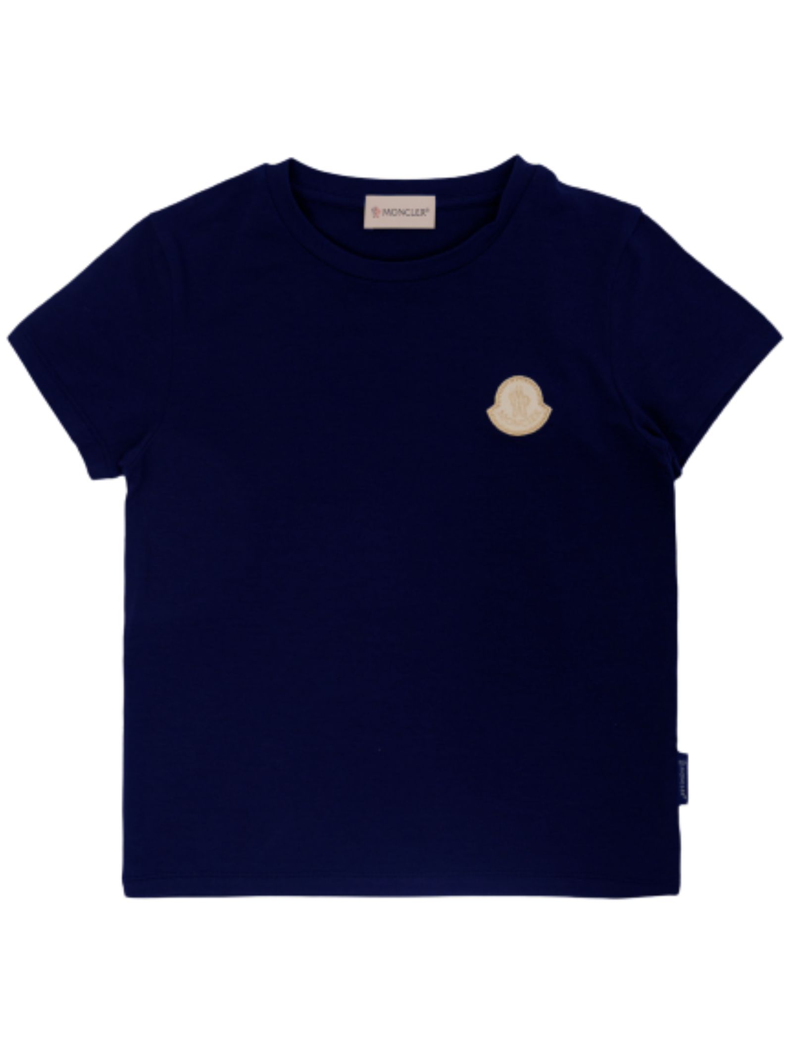 Moncler Kids t-shirt di colore blu navy, modello girocollo, mezza manica, patch con logo sul petto applicato a contrasto oro. design leggermente corto, orlo dritto. Composizione: 96% Viscosa 4% Elastan