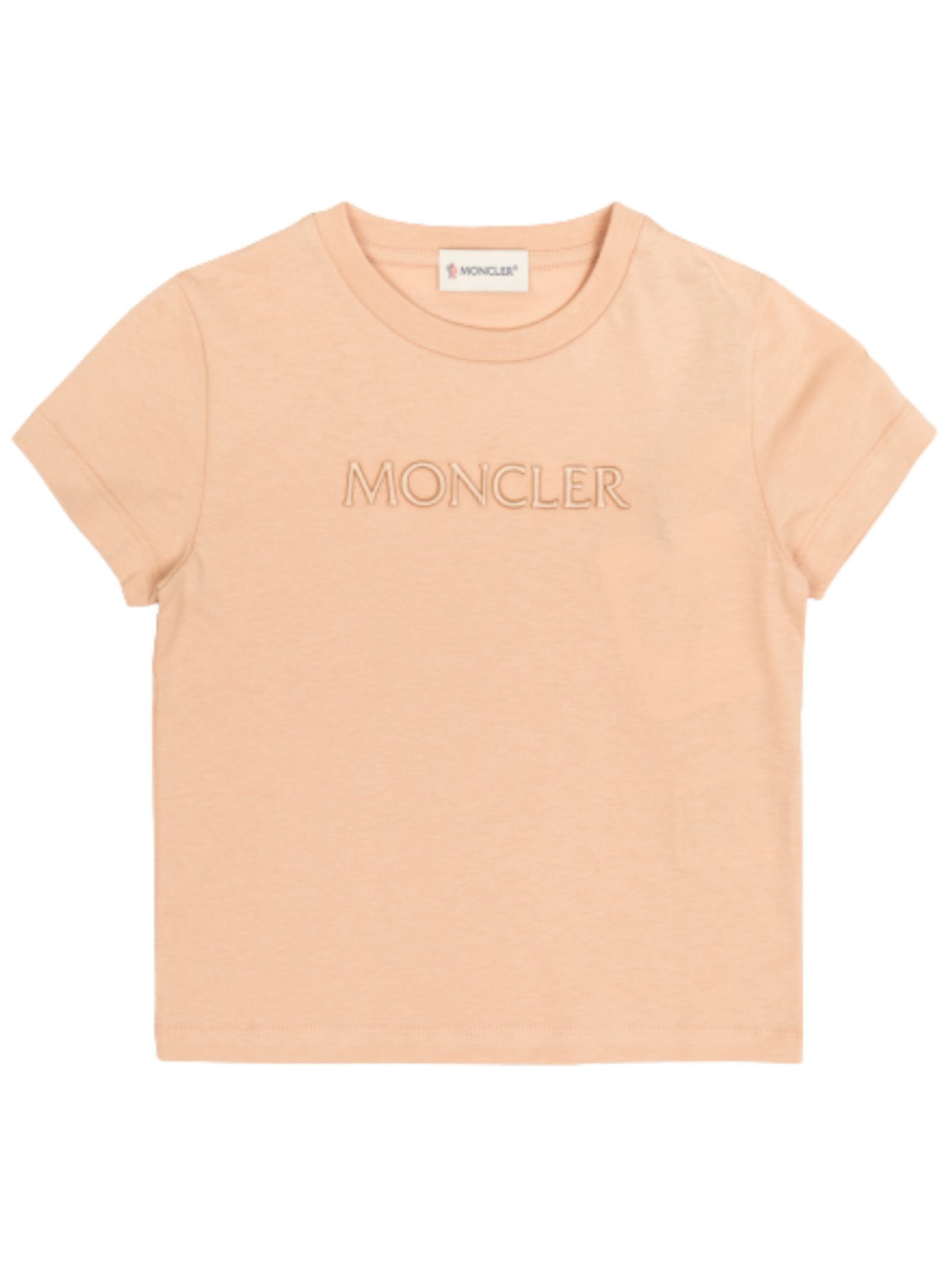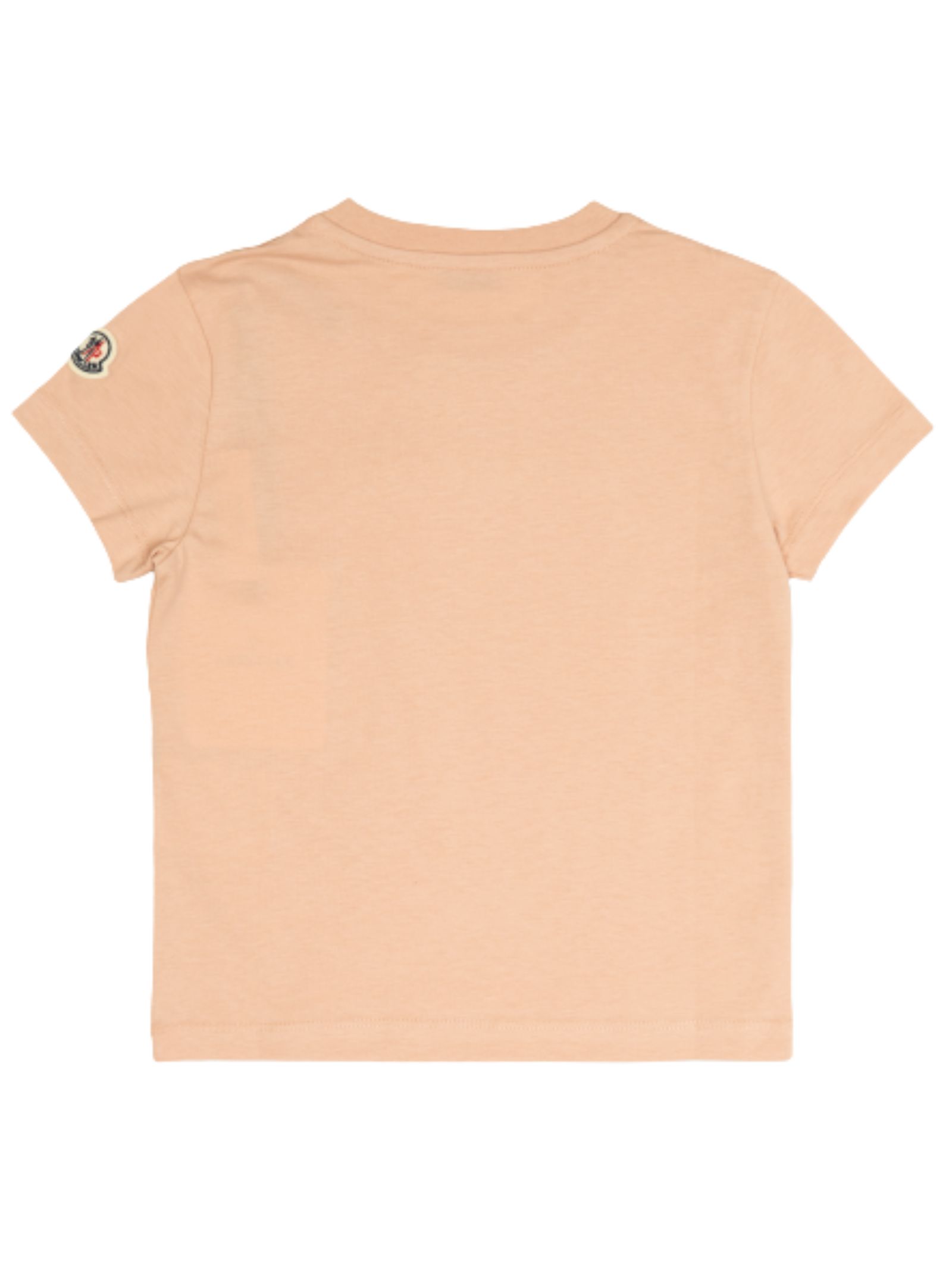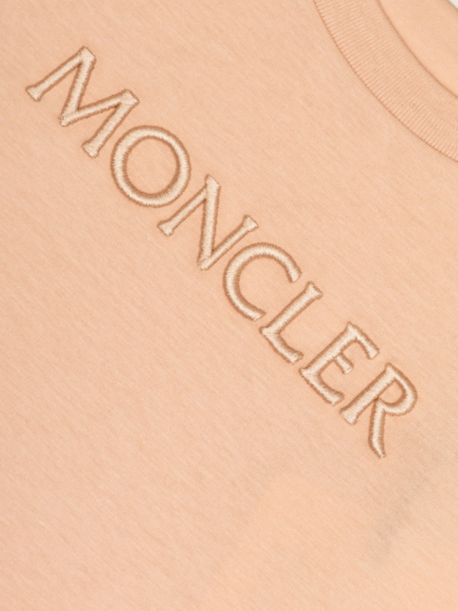 Moncler Kids T-shirt di colore rosa, maniche corte, girocollo a costine, decorata con ricamo logo sulla parte anteriore, vestibilità regolare. Composizione: 100% cotone