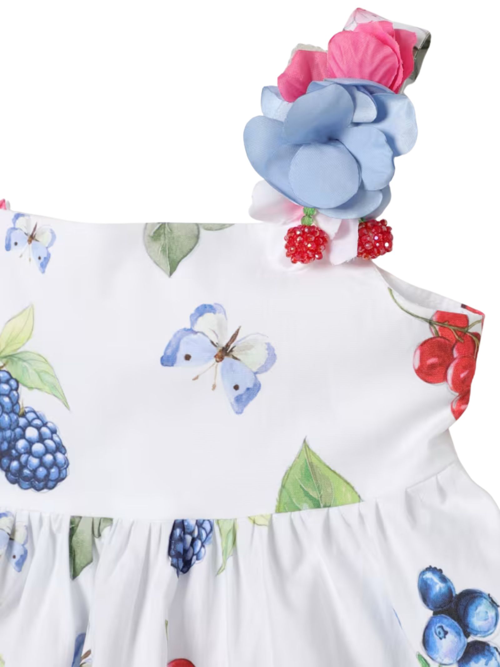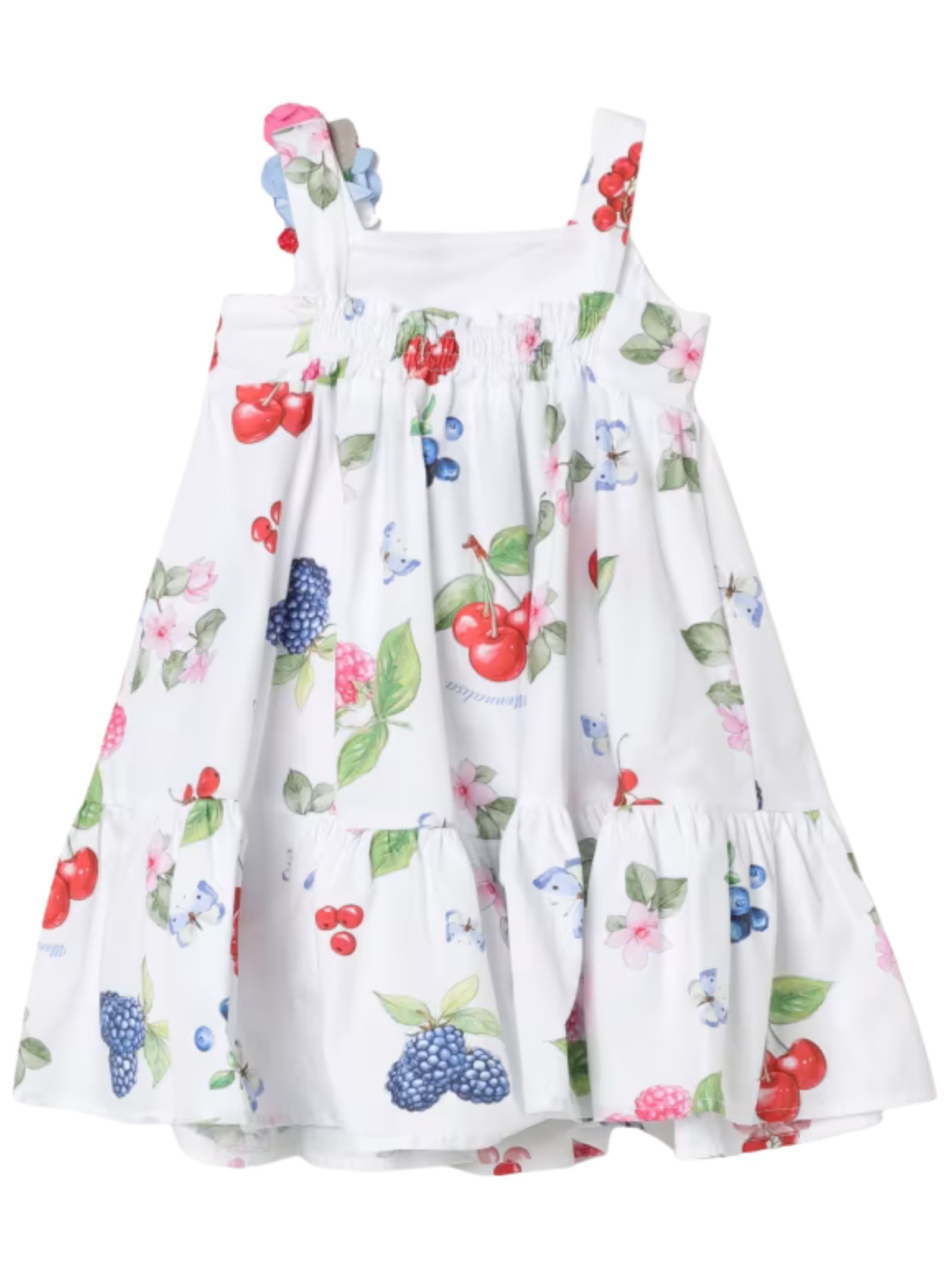 Monnalisa Kids abito di colore bianco, stampa fiori multicolor su tutta la superficie, modello con bretelle, applicazione fiori, design svasato. Composizione: Poliestere 100%. Fodera: 100% cotone. Made in Italy