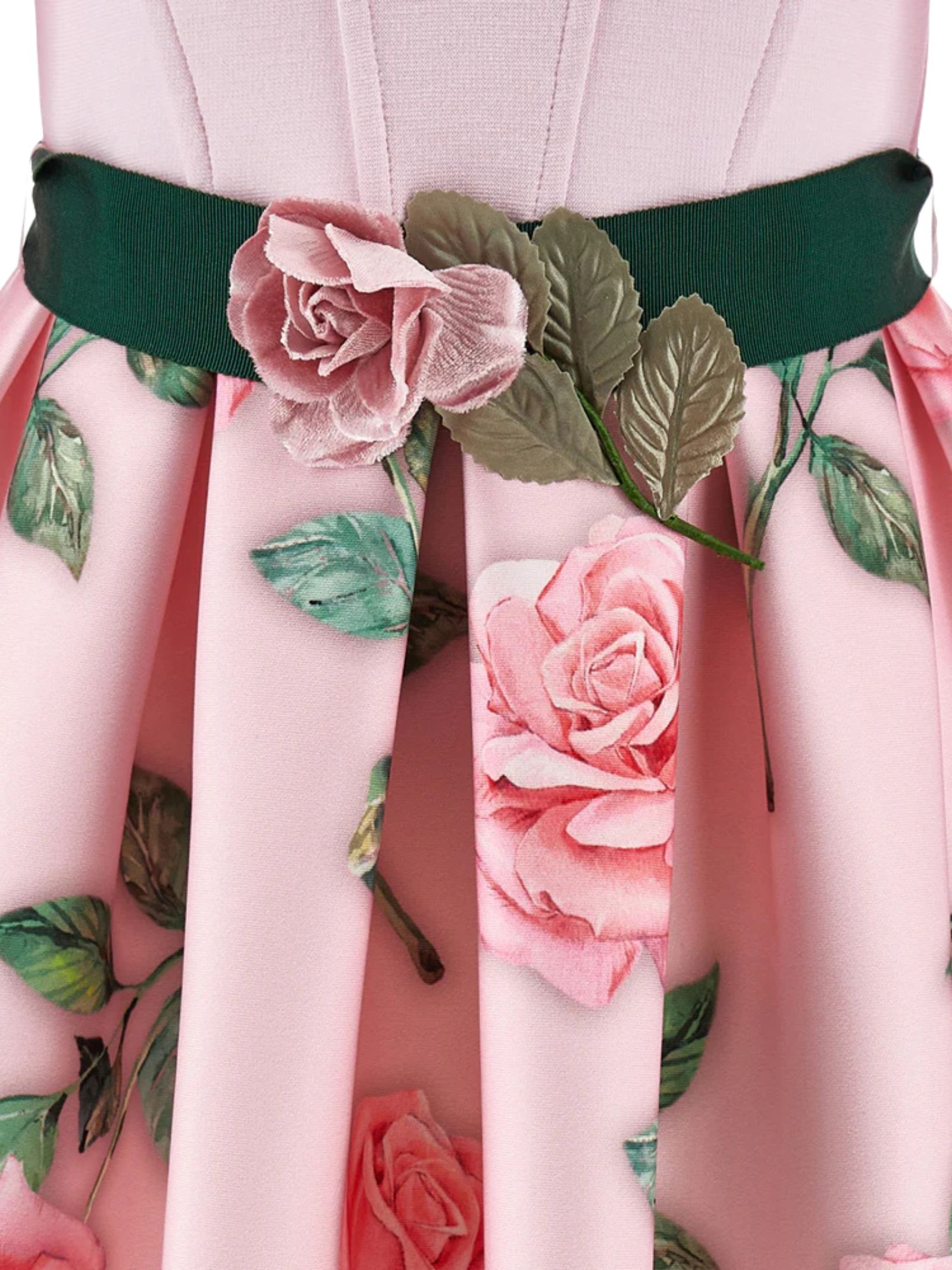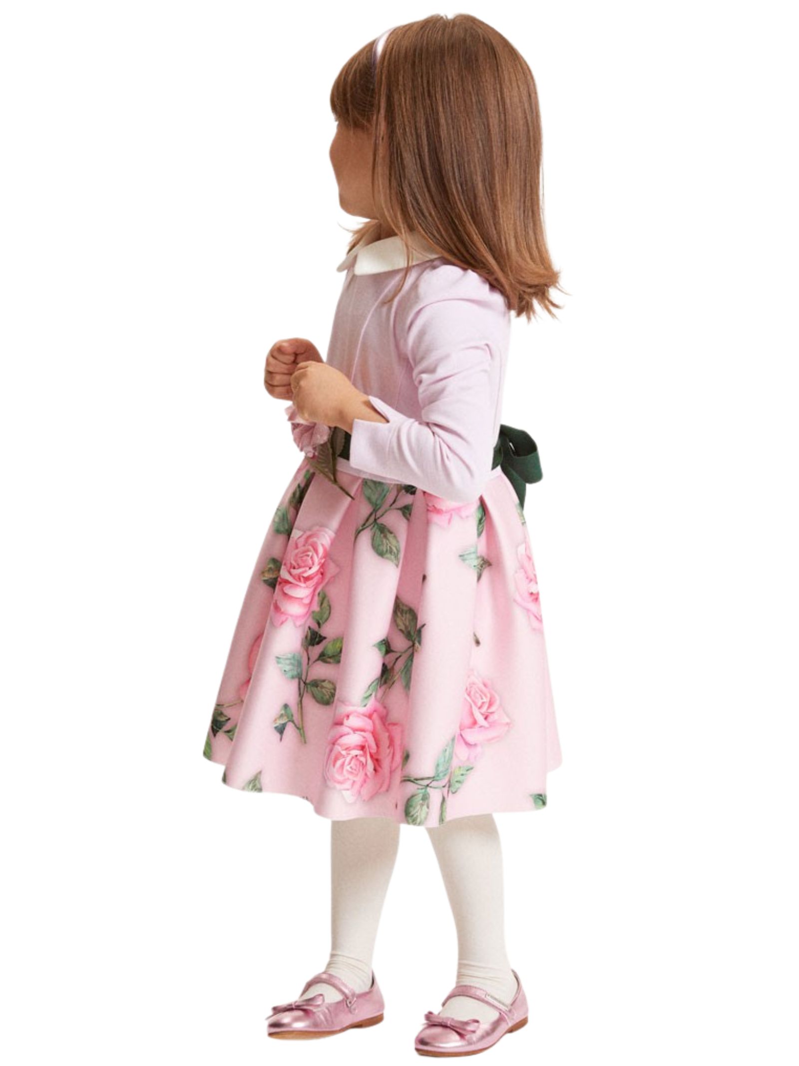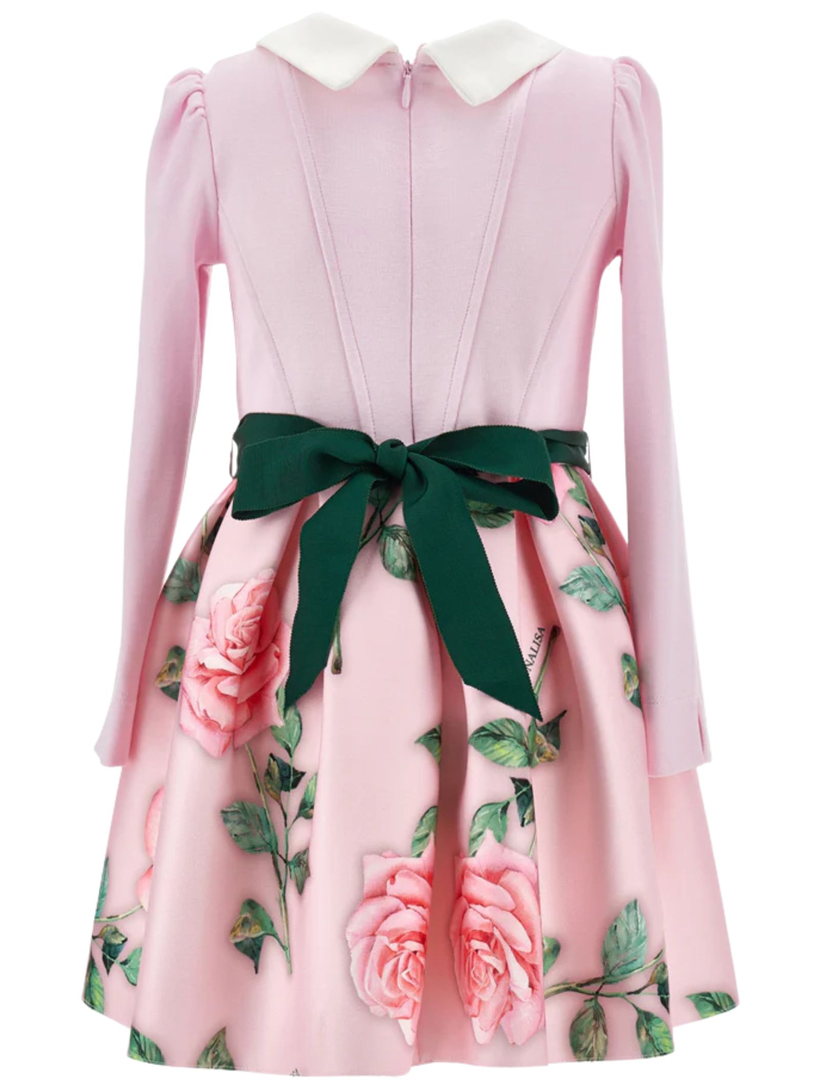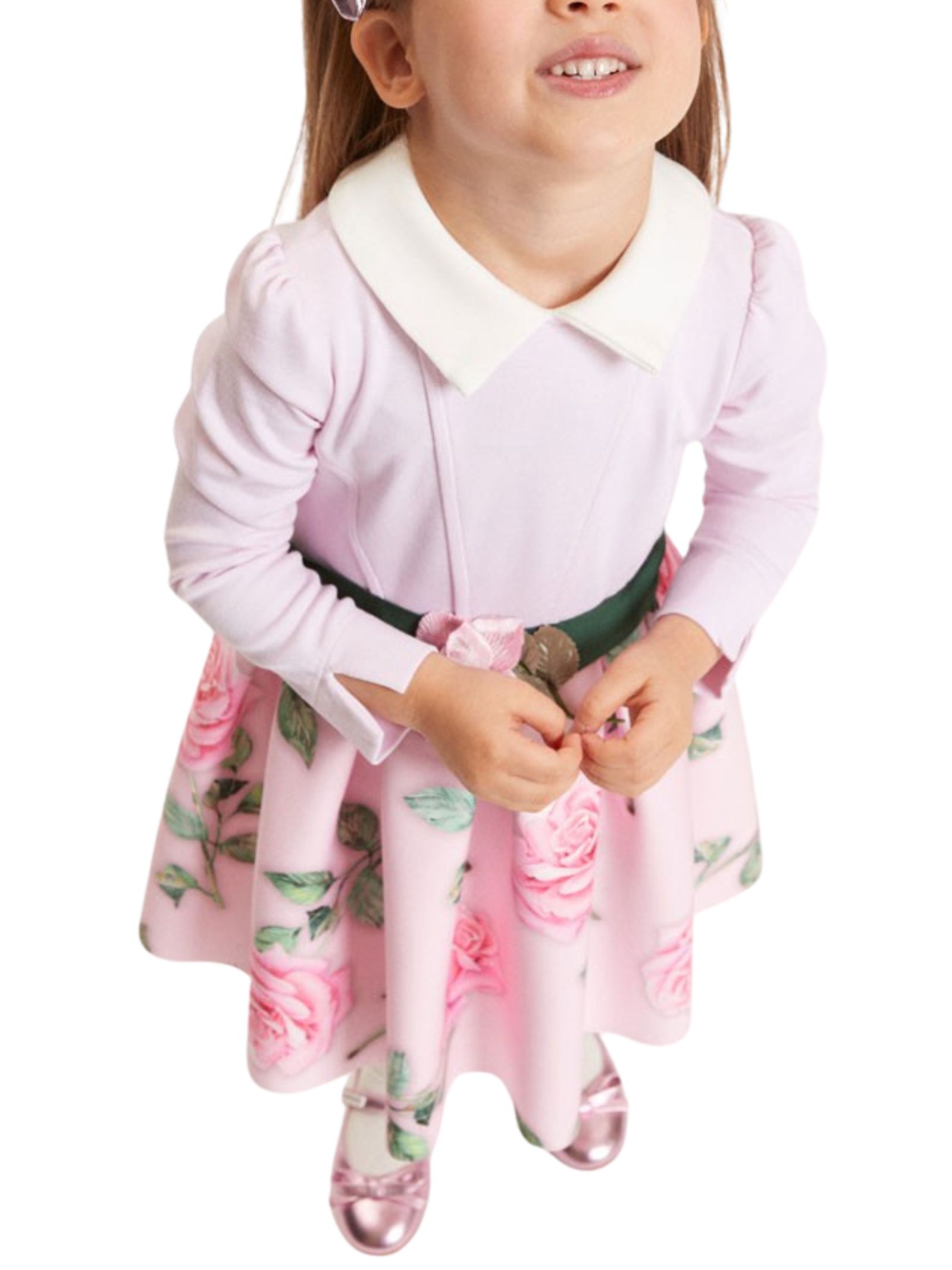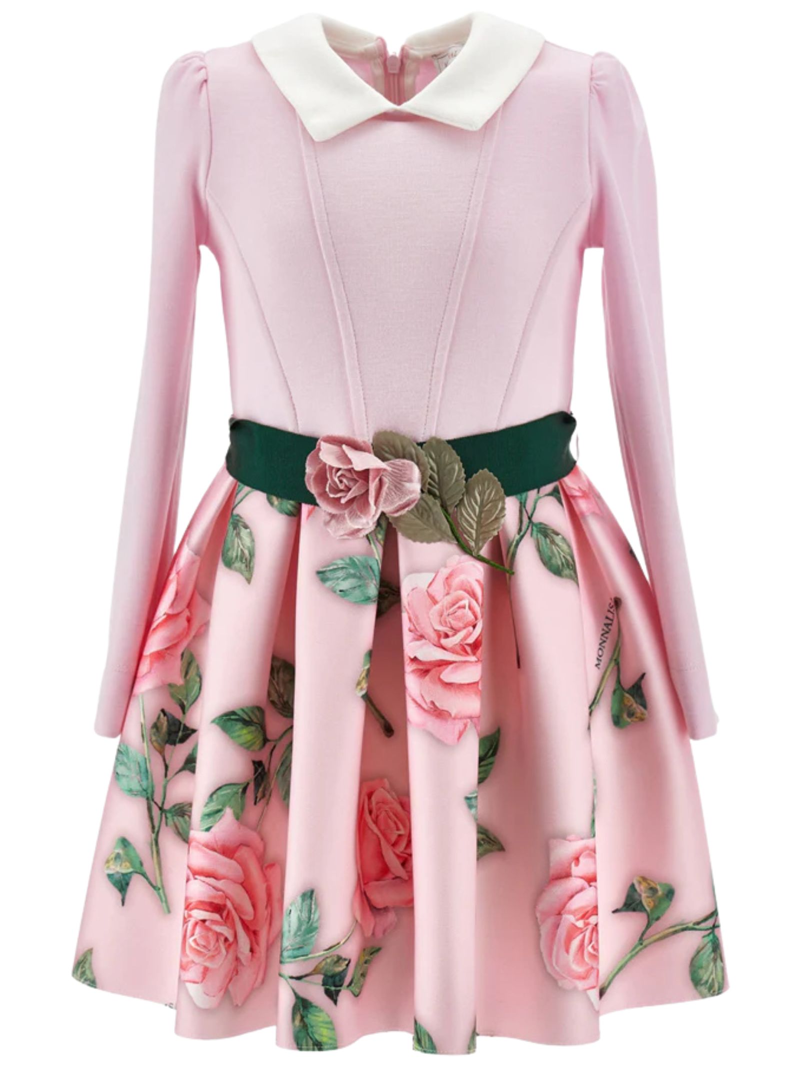 Monnalisa Kids abito realizzato in neoprene di colore rosa chiaro, corpetto montato, colletto bianco a contrasto, gonna svasata con stampa fiori, dettaglio cintura verde con abbellimenti floreali, maniche lunghe, fissaggio posteriore a zip a scomparsa. Composizione: 92% Poliestere 8% elastan. Fodera gonna: 51% viscosa 49% cotone. Made in Italy