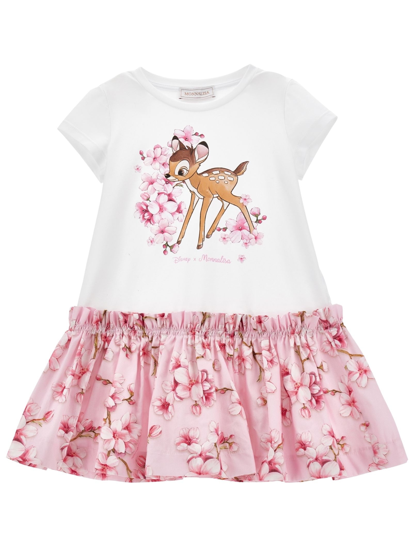 Monnalisa Kids abito di colore bianco/rosa, dettaglio parte inferiore in stampa fiori, modello girocollo, mezza manica, stampa Bambi a contrasto con logo, vestibilità svasata. Composizione: 94% cotone 6% elastan. Made in Italy