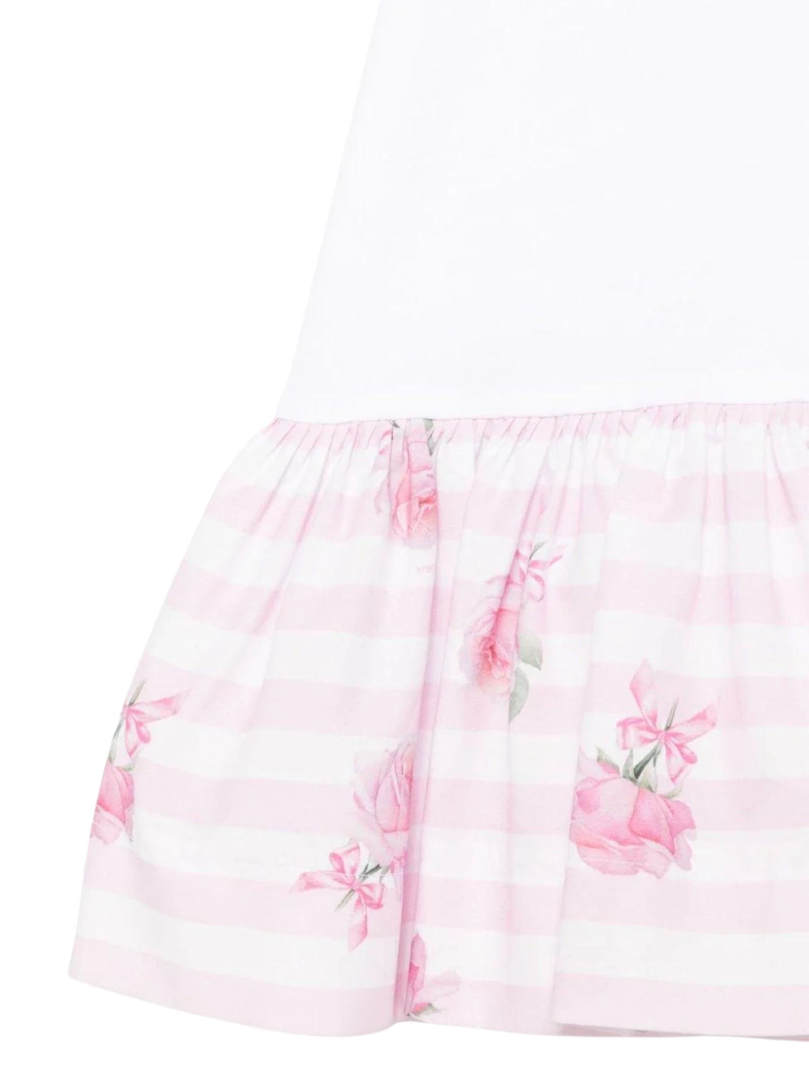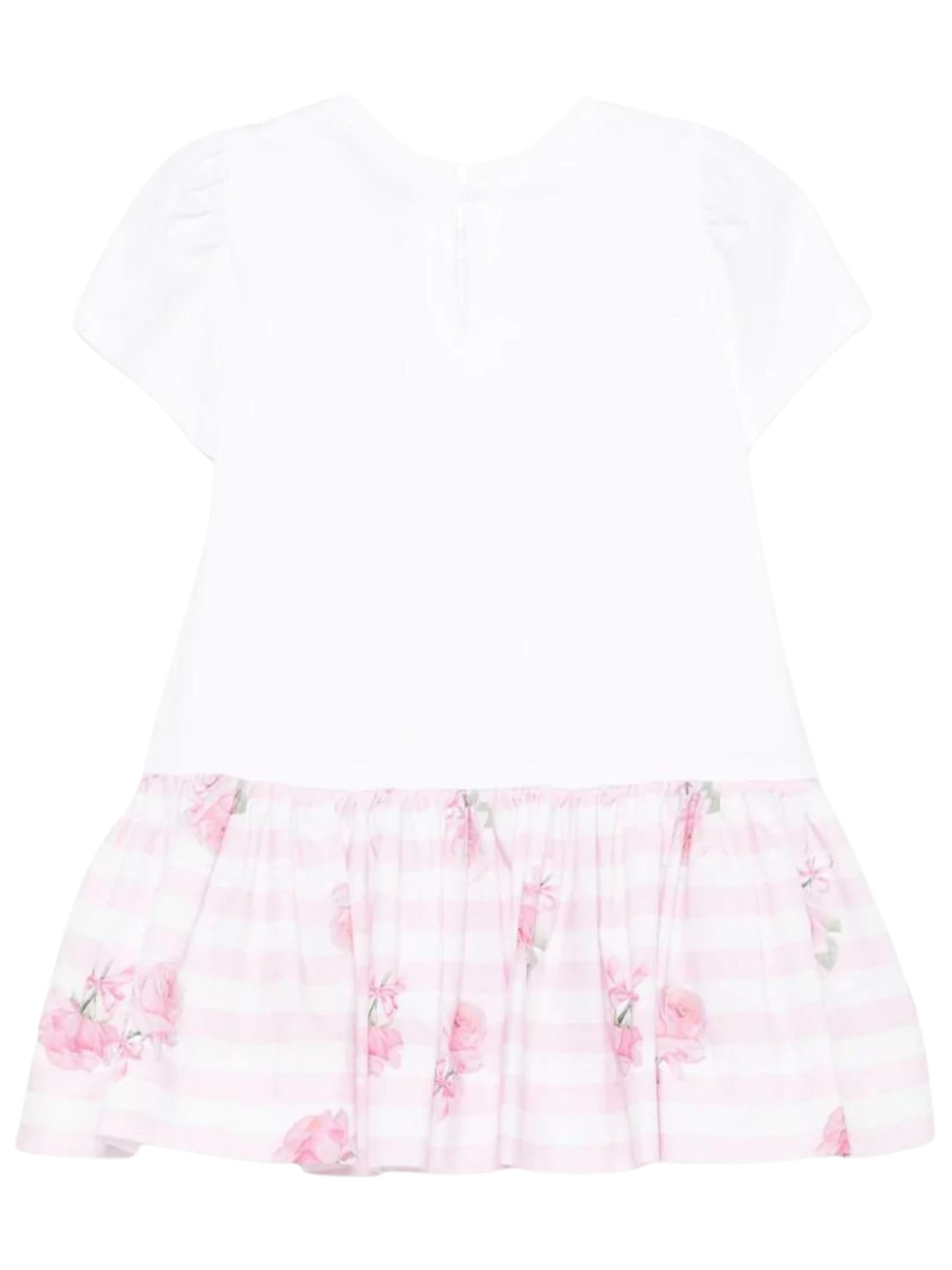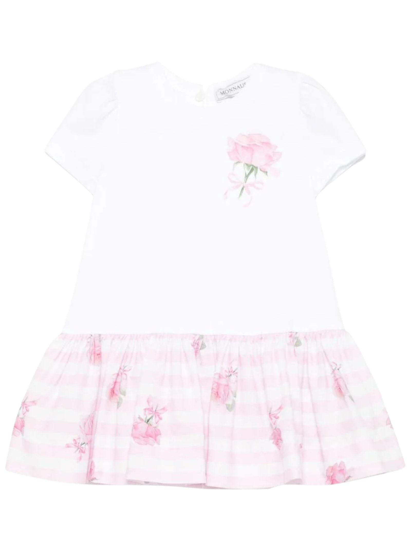 Monnalisa Kids abito di colore bianco/rosa, modello girocollo, mezza manica, stampa rose, apertura con bottone sul retro, design svasato. Composizione: 95% cotone 5% elastan. Made in Italy