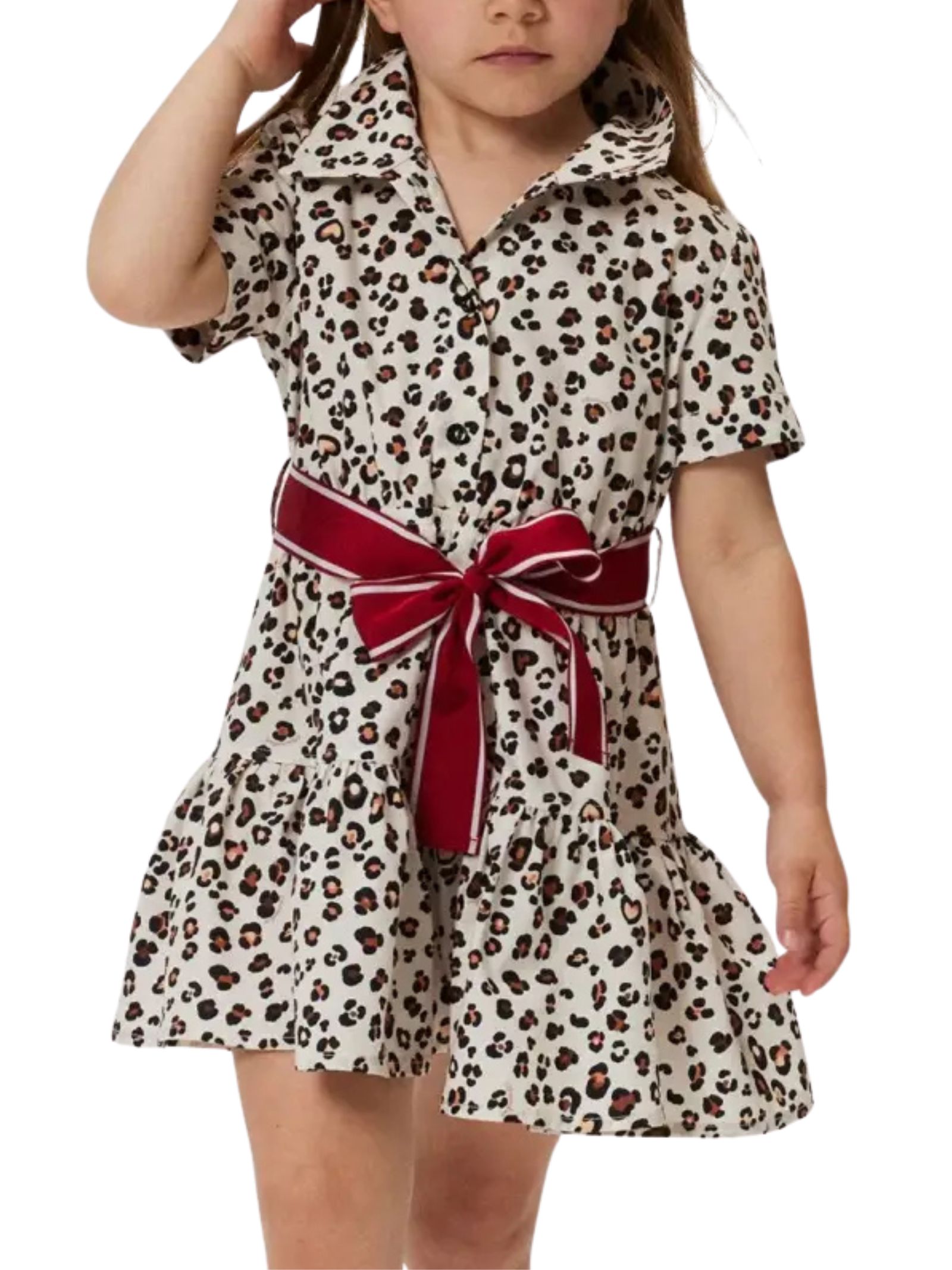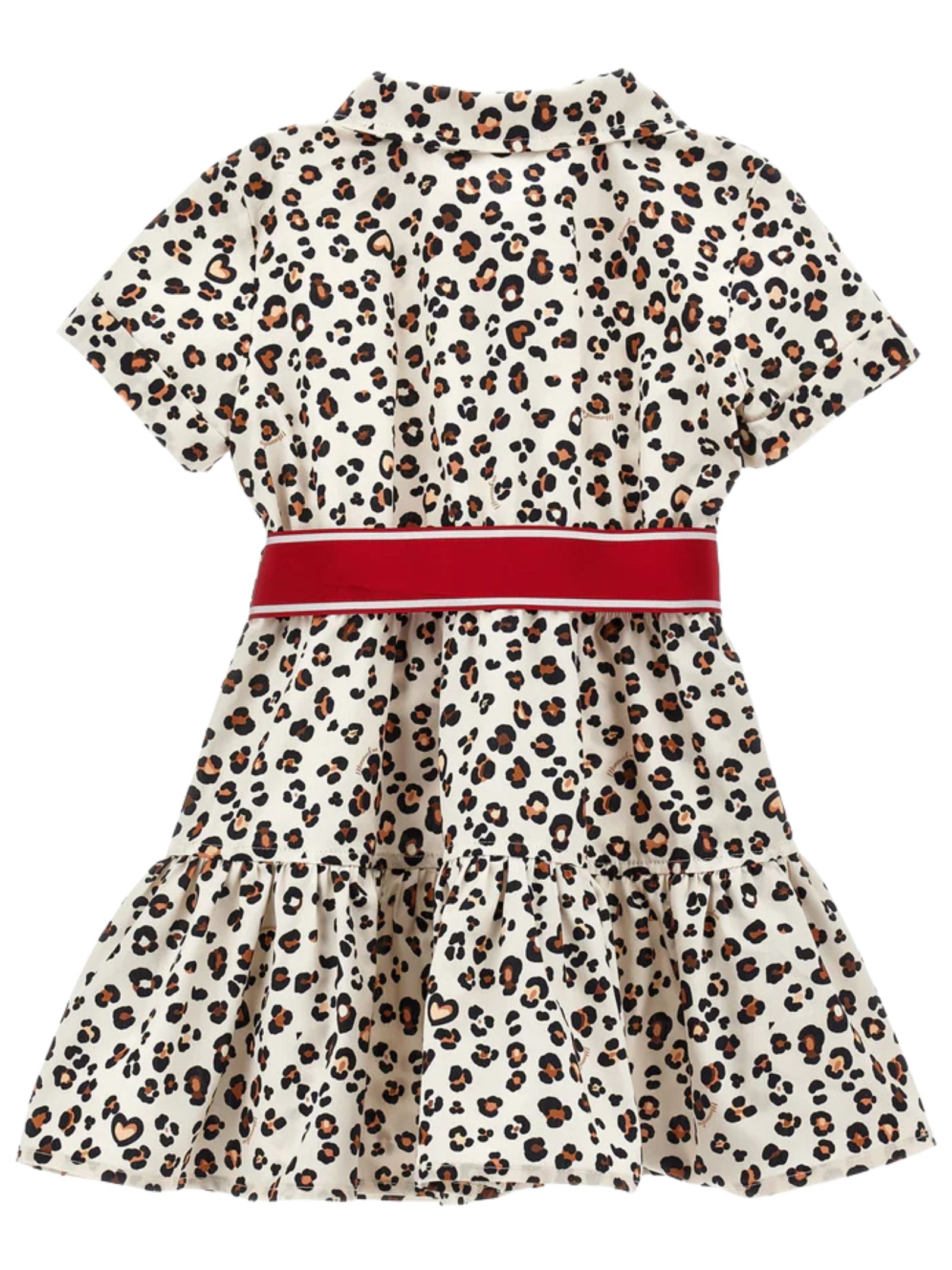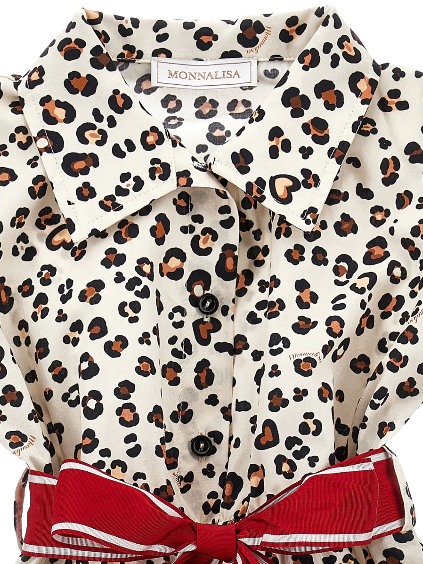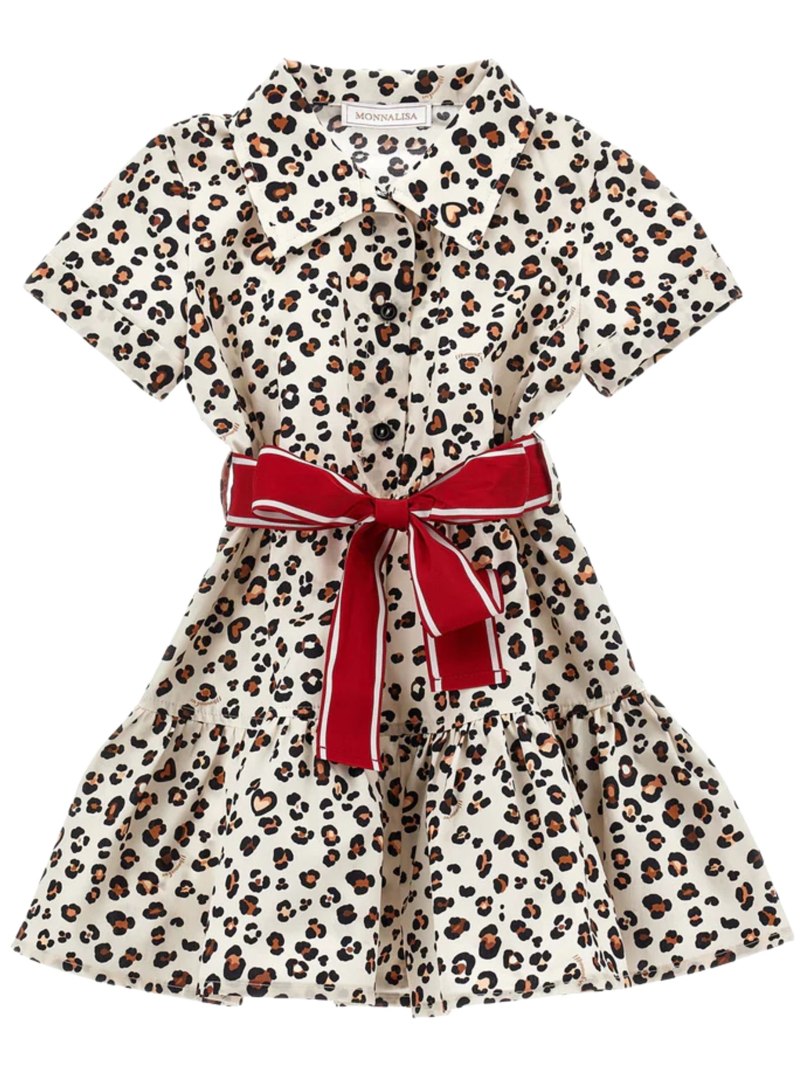 Monnalisa Kids abito in fantasia maculata, cintura removibile rosso in vita, mezza manica, bottoni frontali, design svasato, fonod con rouches. Composizione: 100% cotone. Made in Italy
